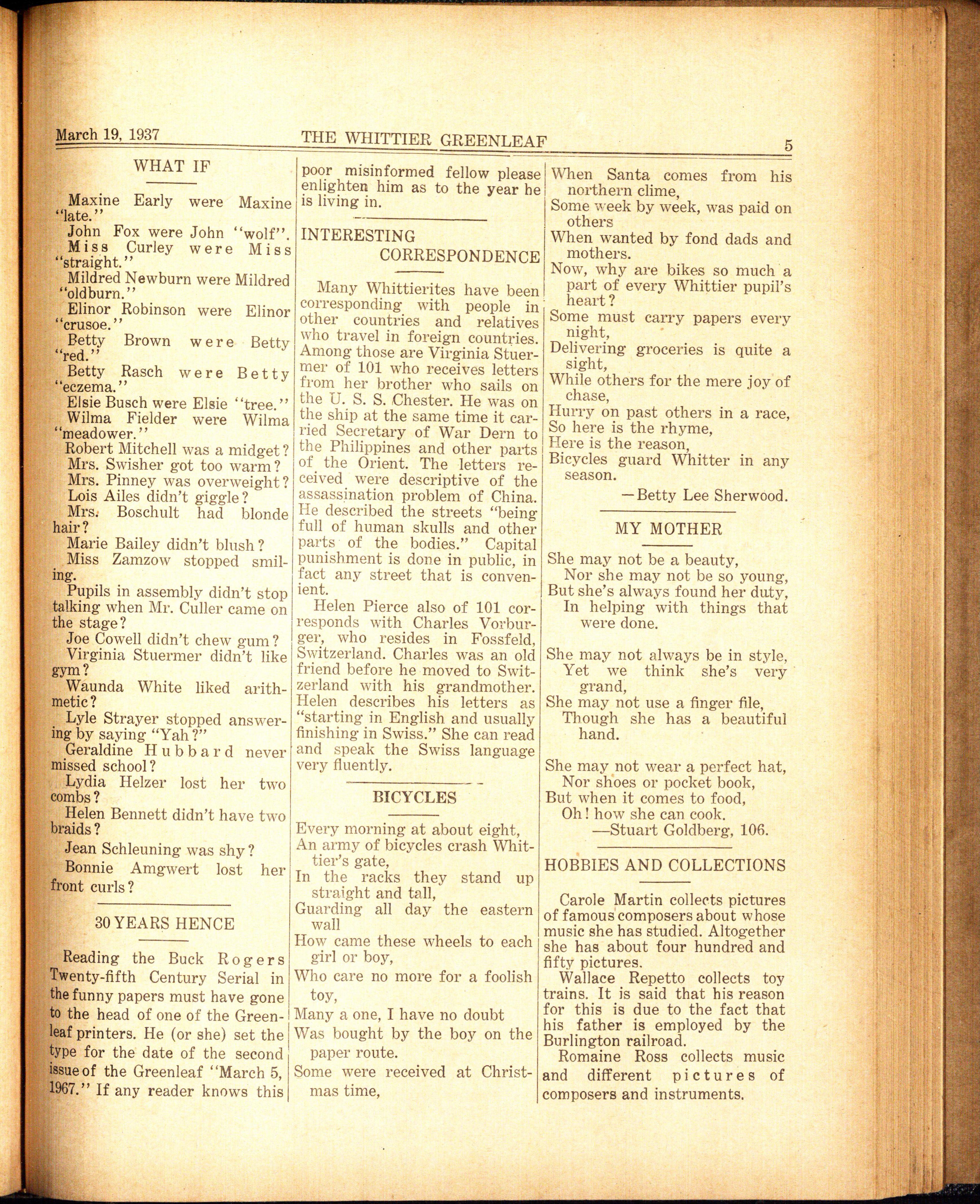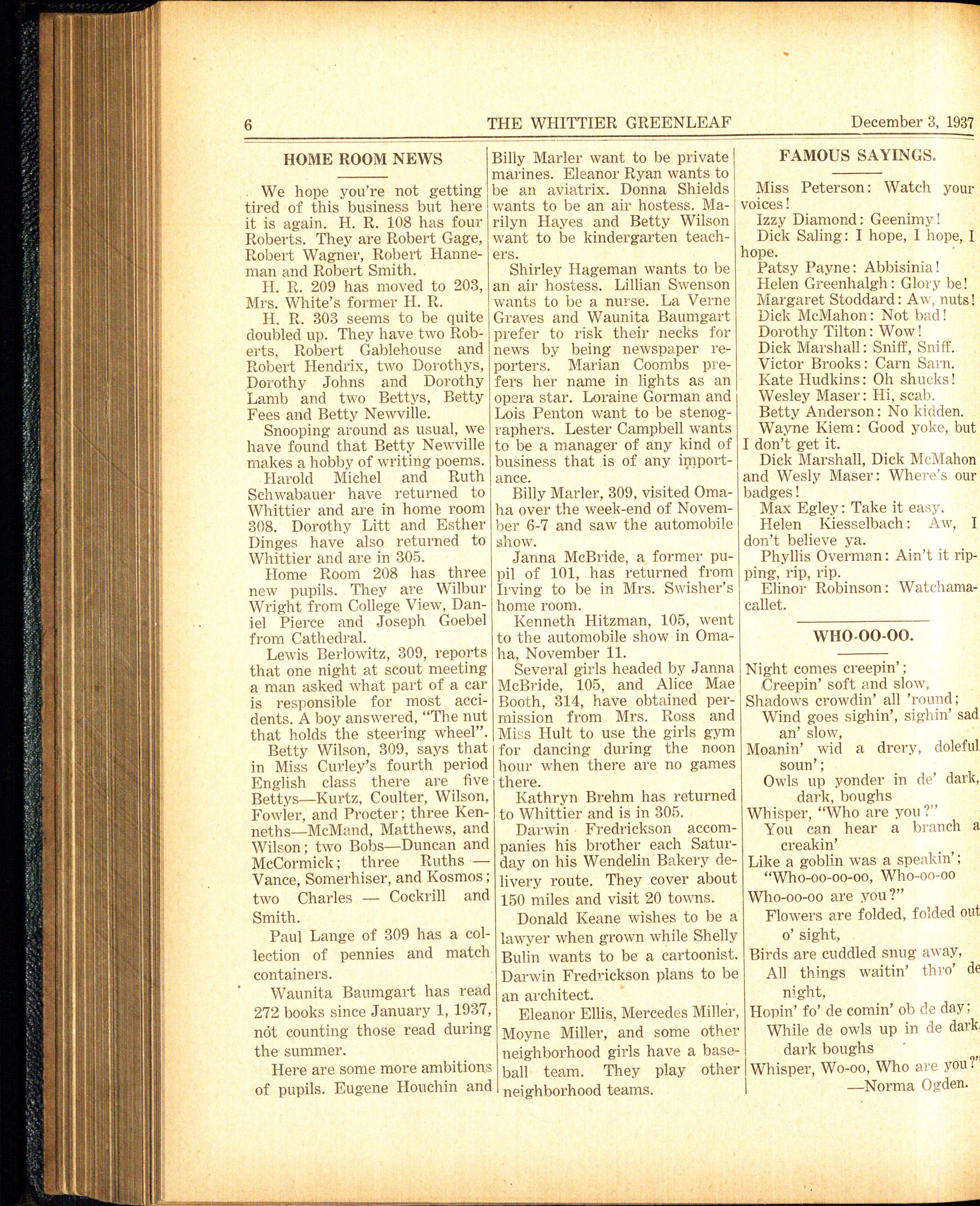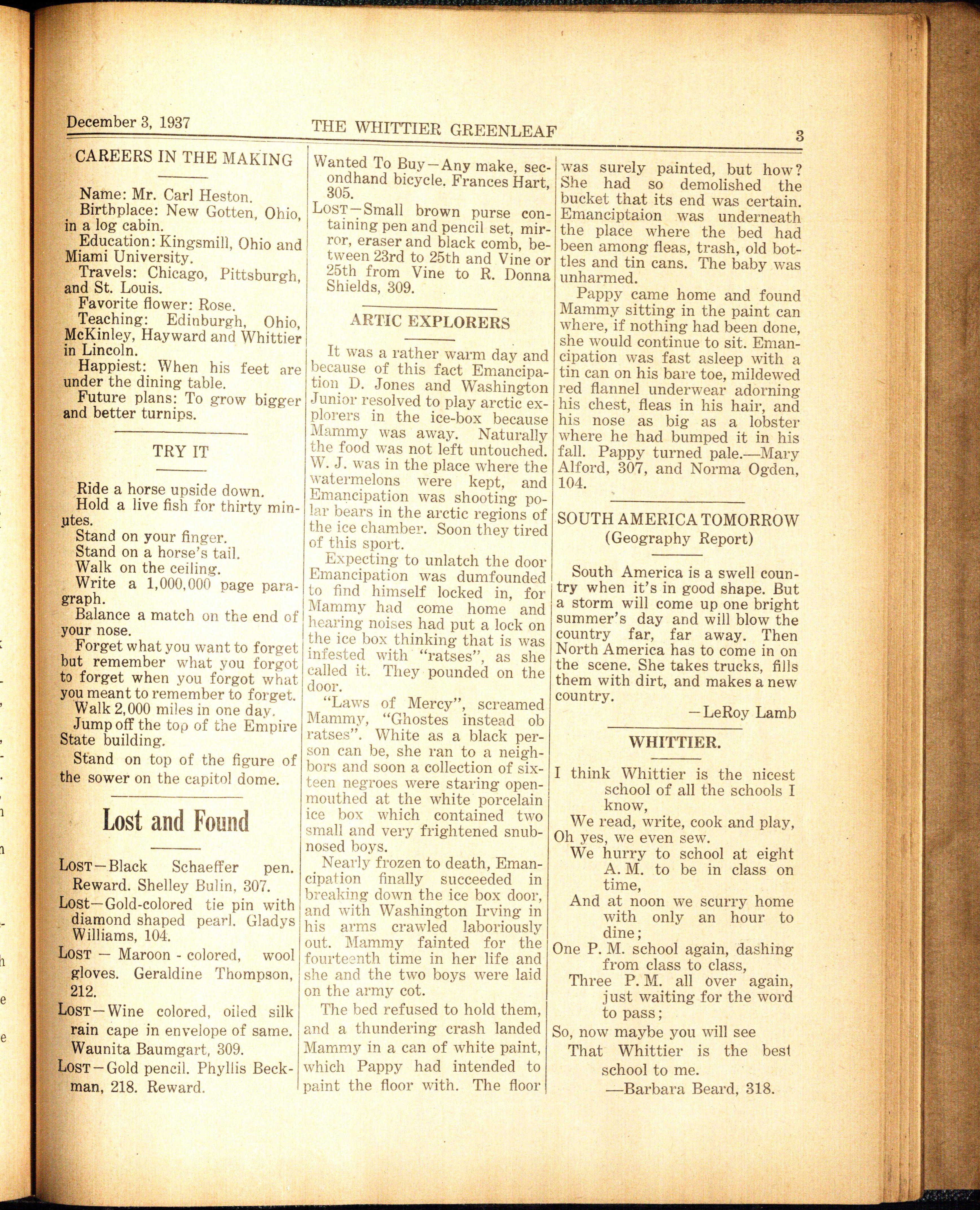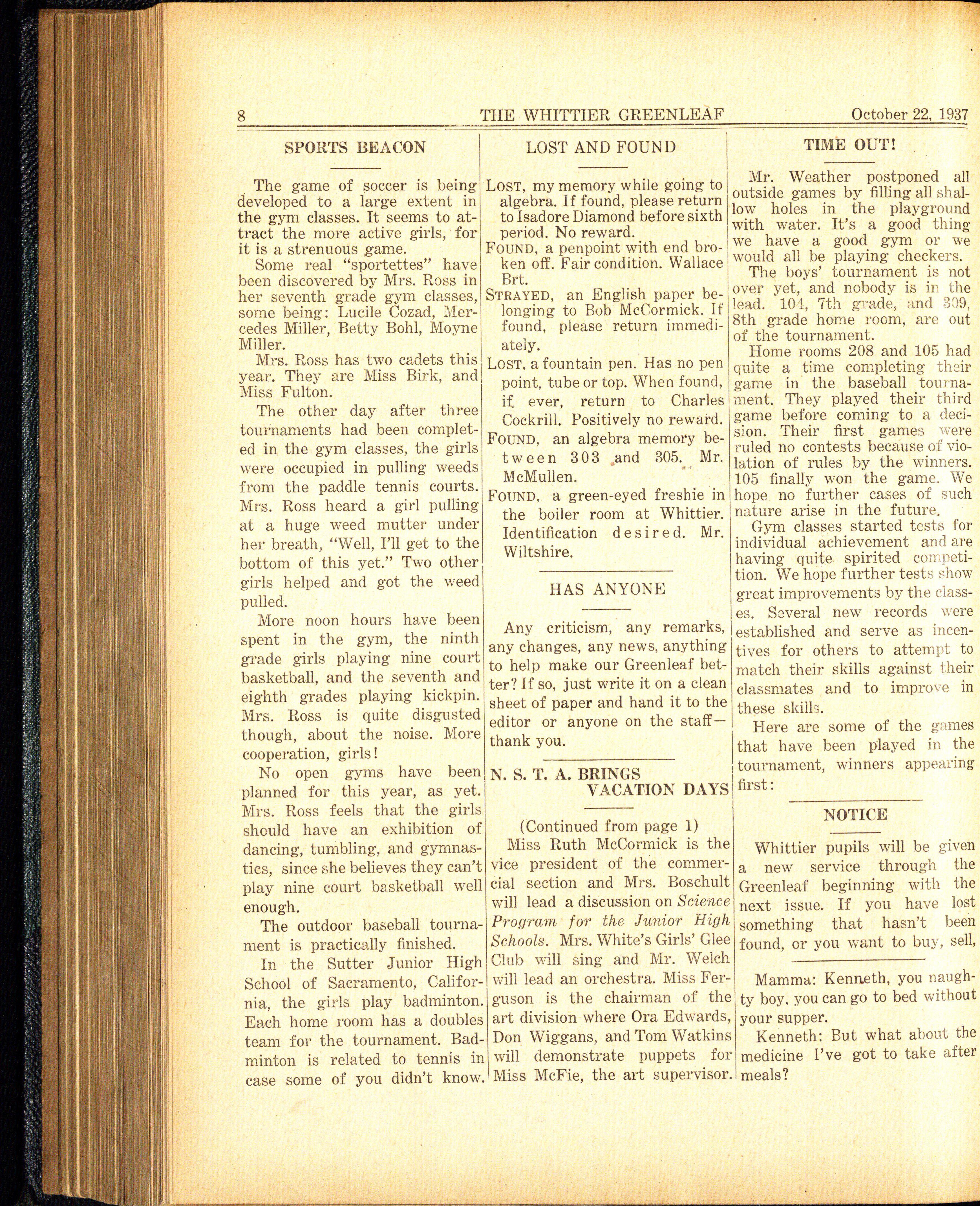 To the incoming 7B's and other newcomers, the teachers and pupils of Whittier extend their heartiest greetings. We hope that you will soon feel at home within our portals and wish you luck and happiness on your journey over the road of knowledge.