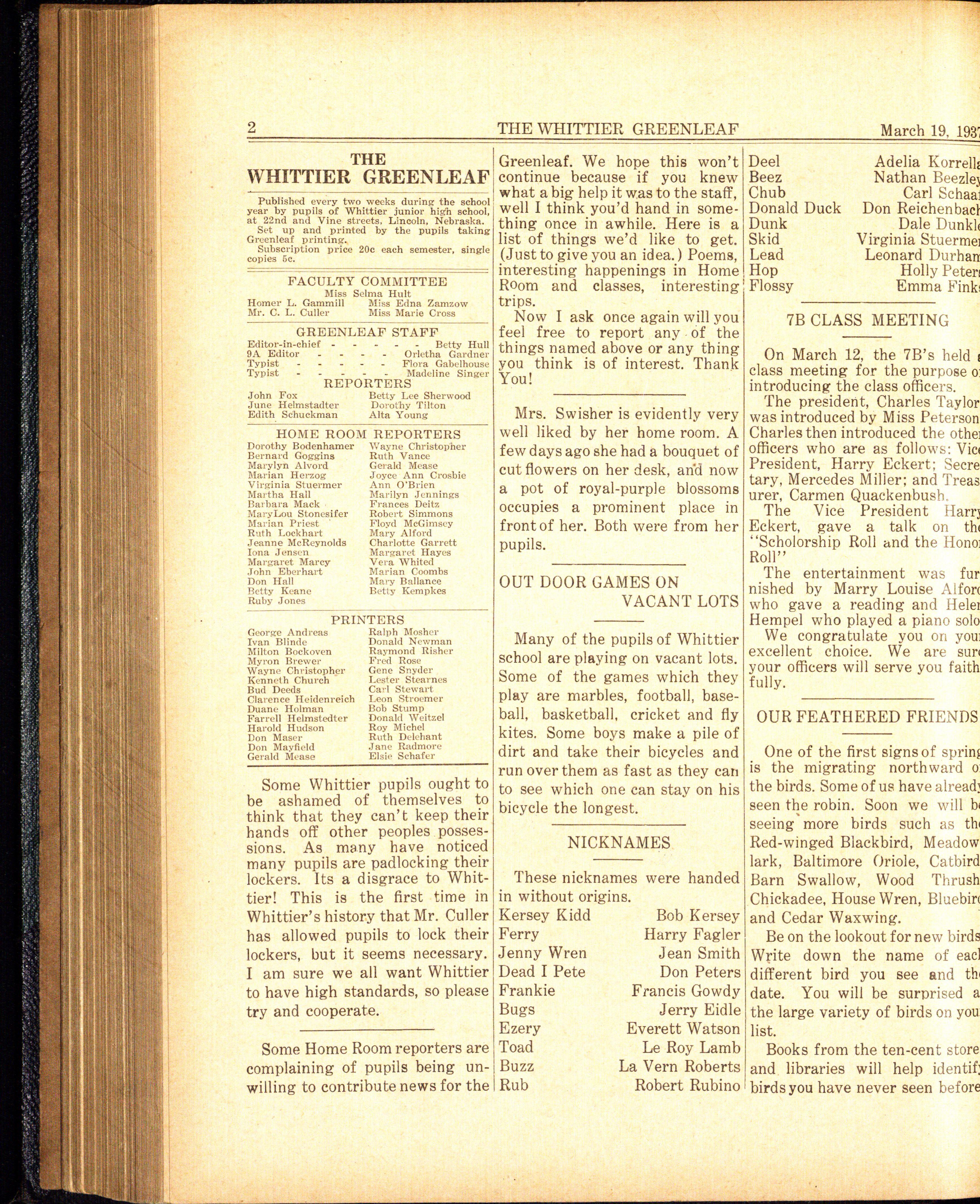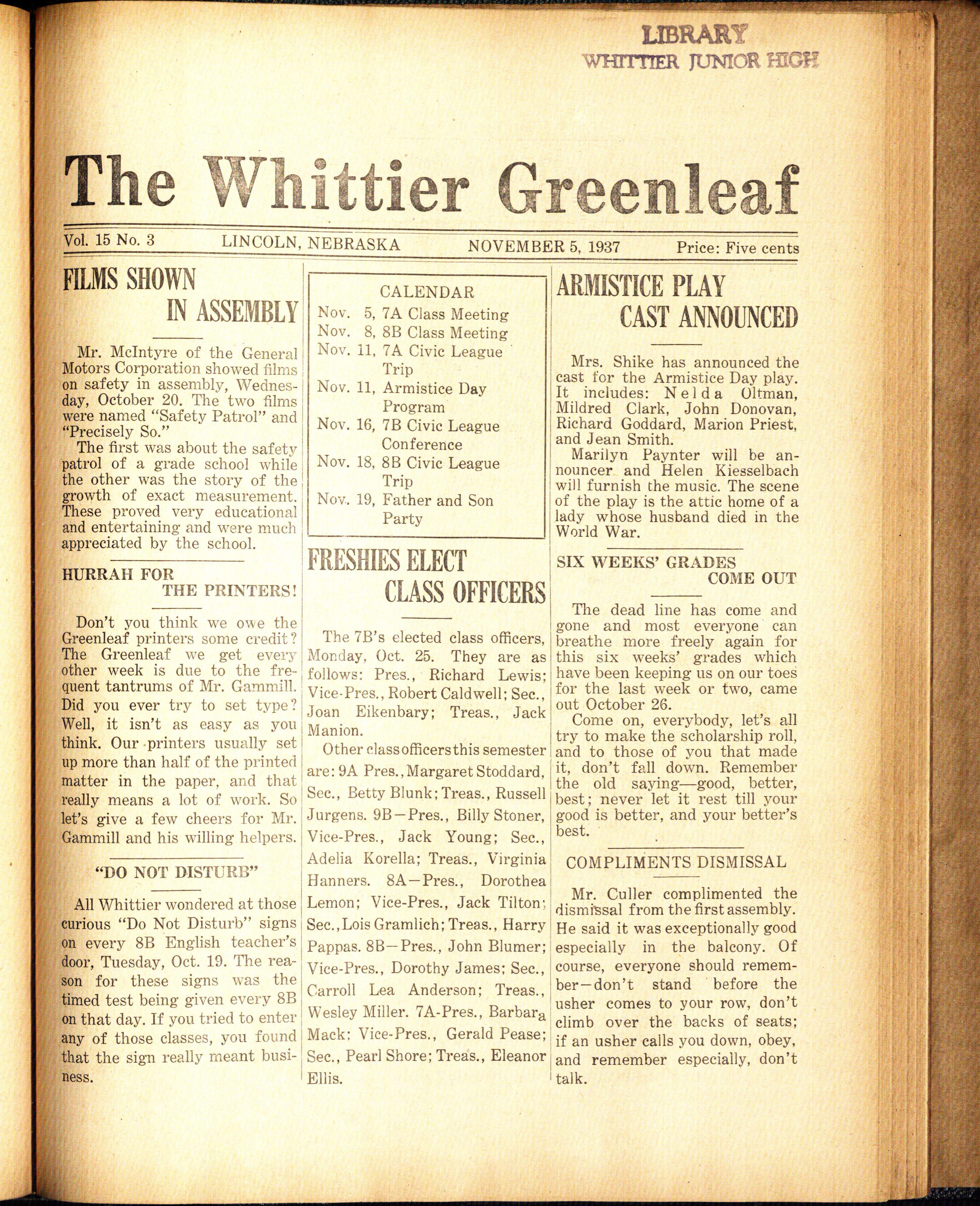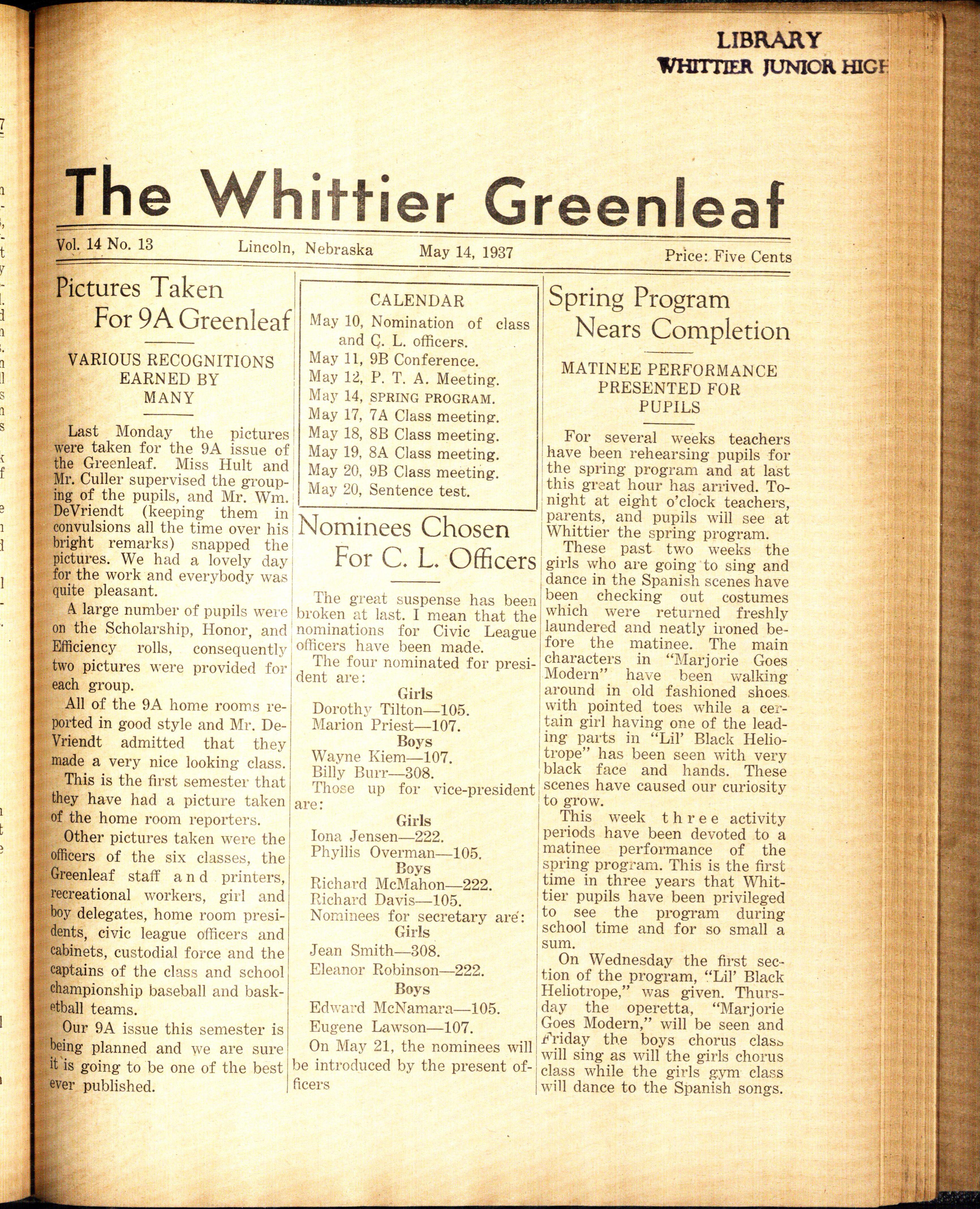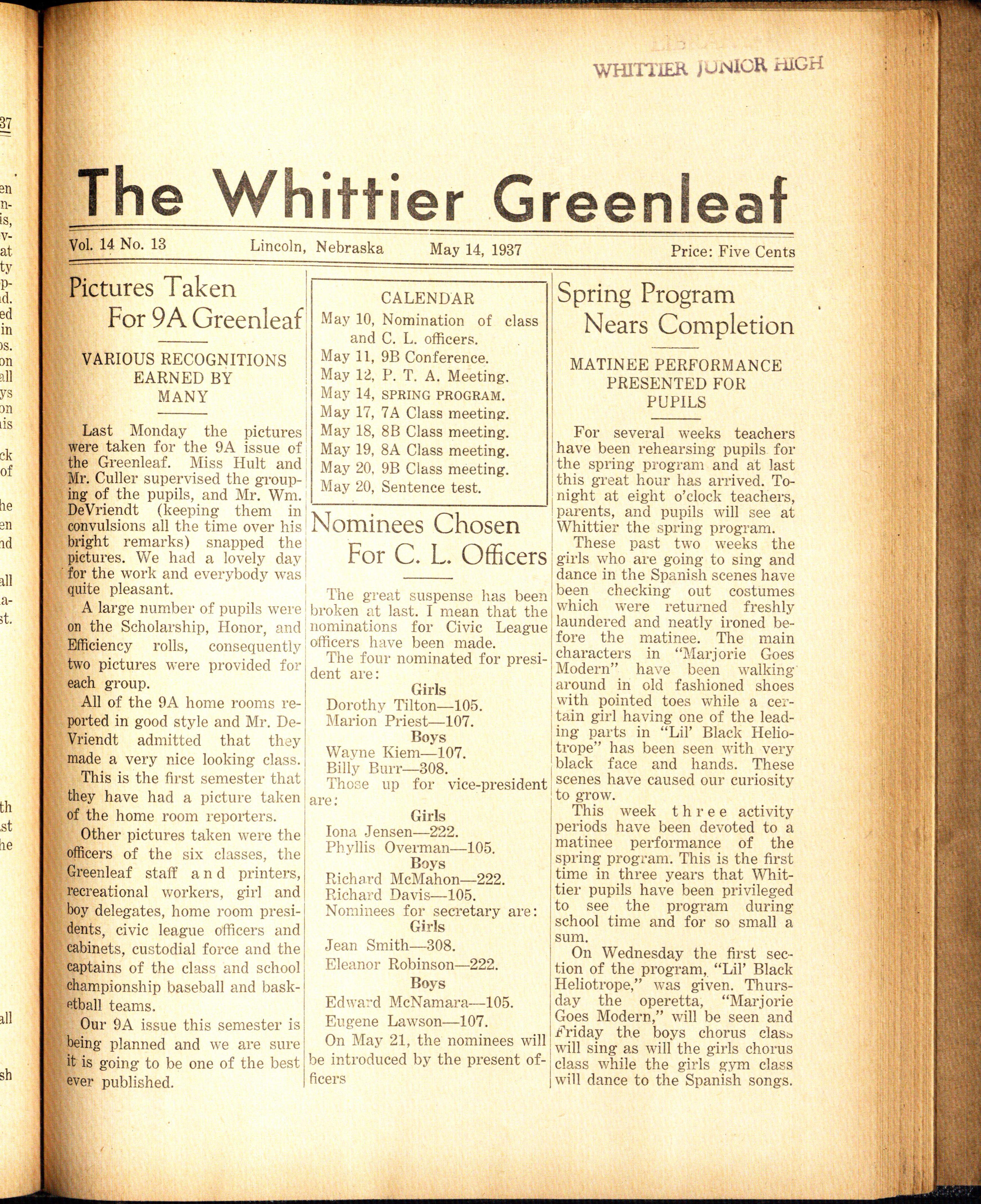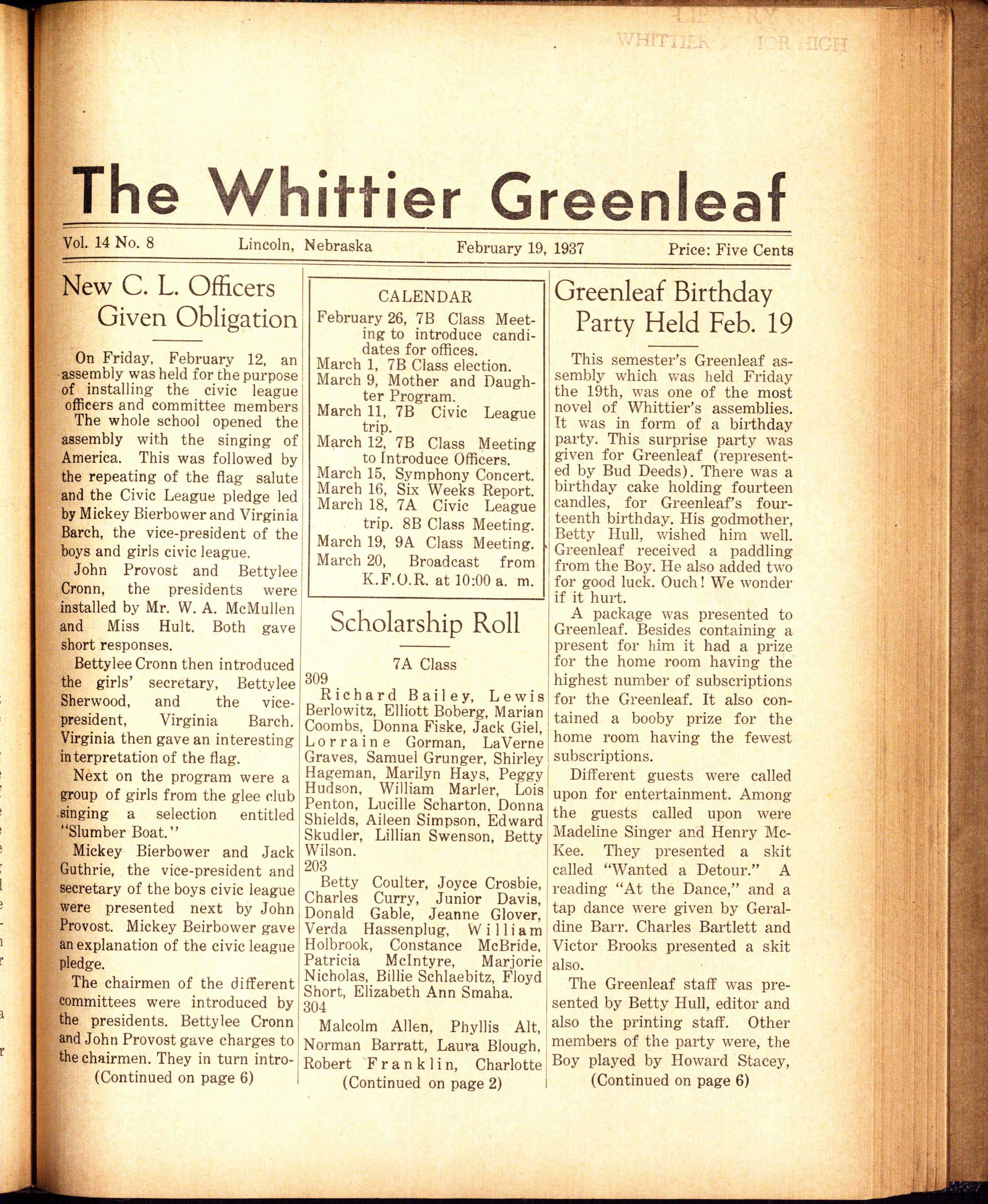 y e ar by pupils of Whittier junior hi g'h school, at 2 2 nd and Vin e s tree ts, Lincoln, N ebra ska