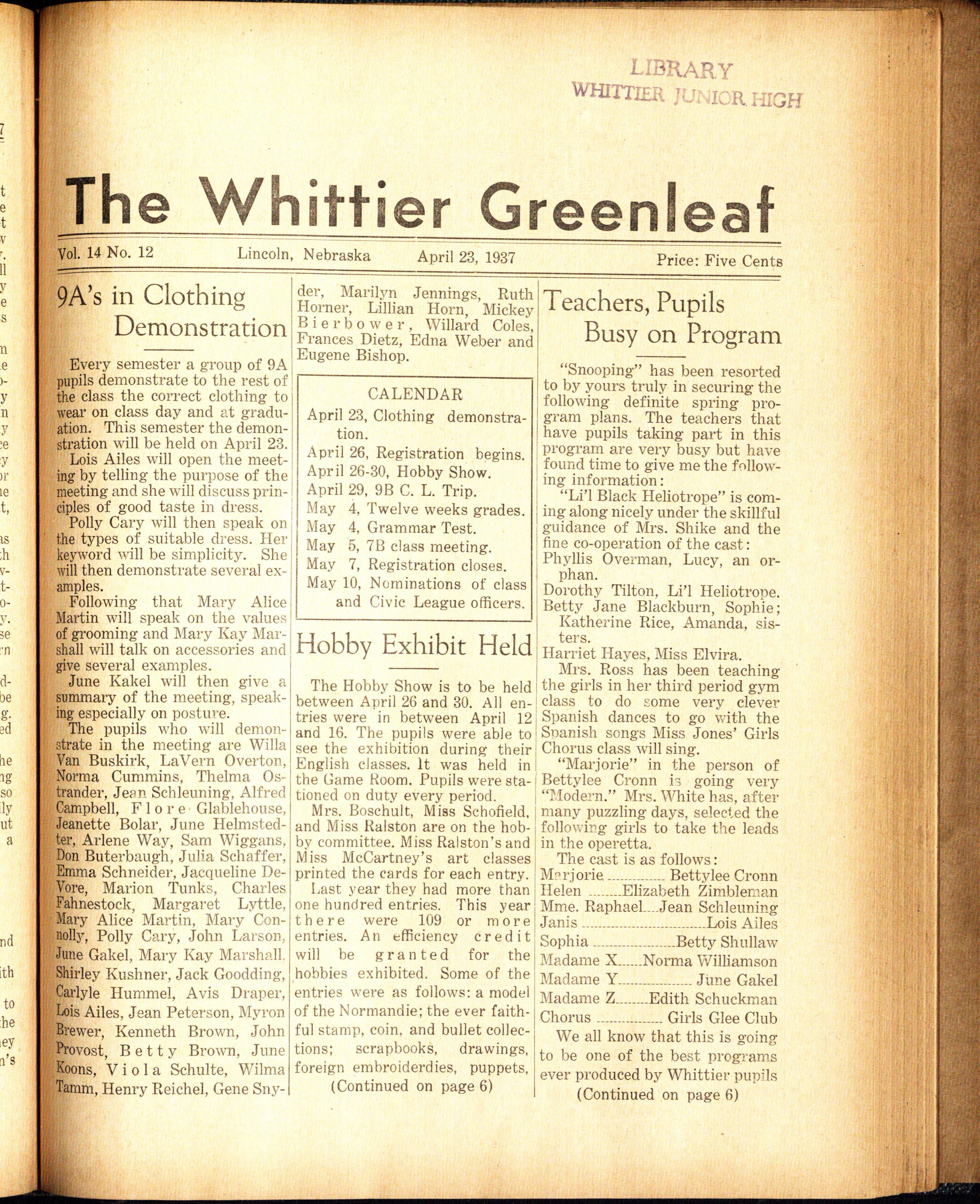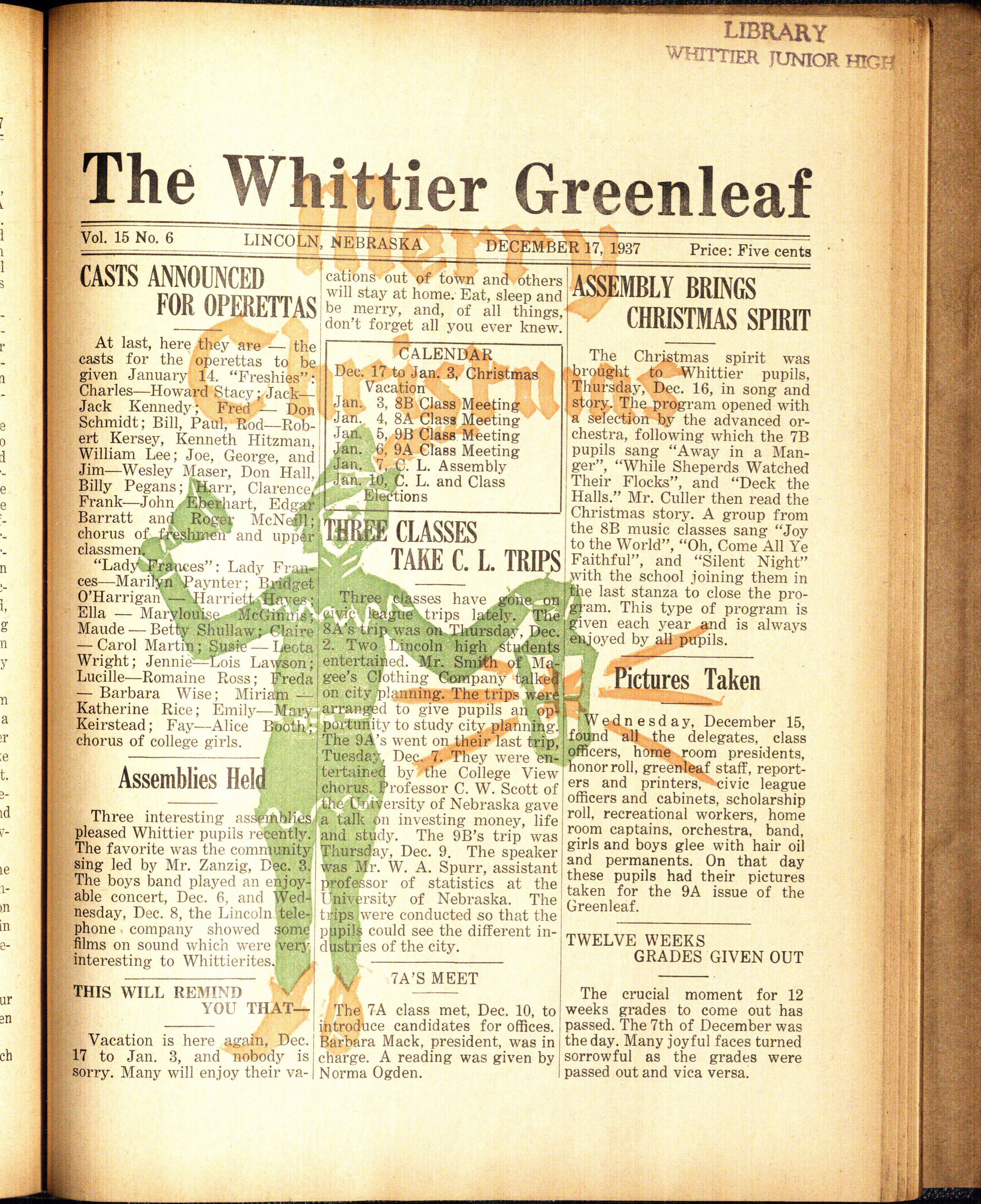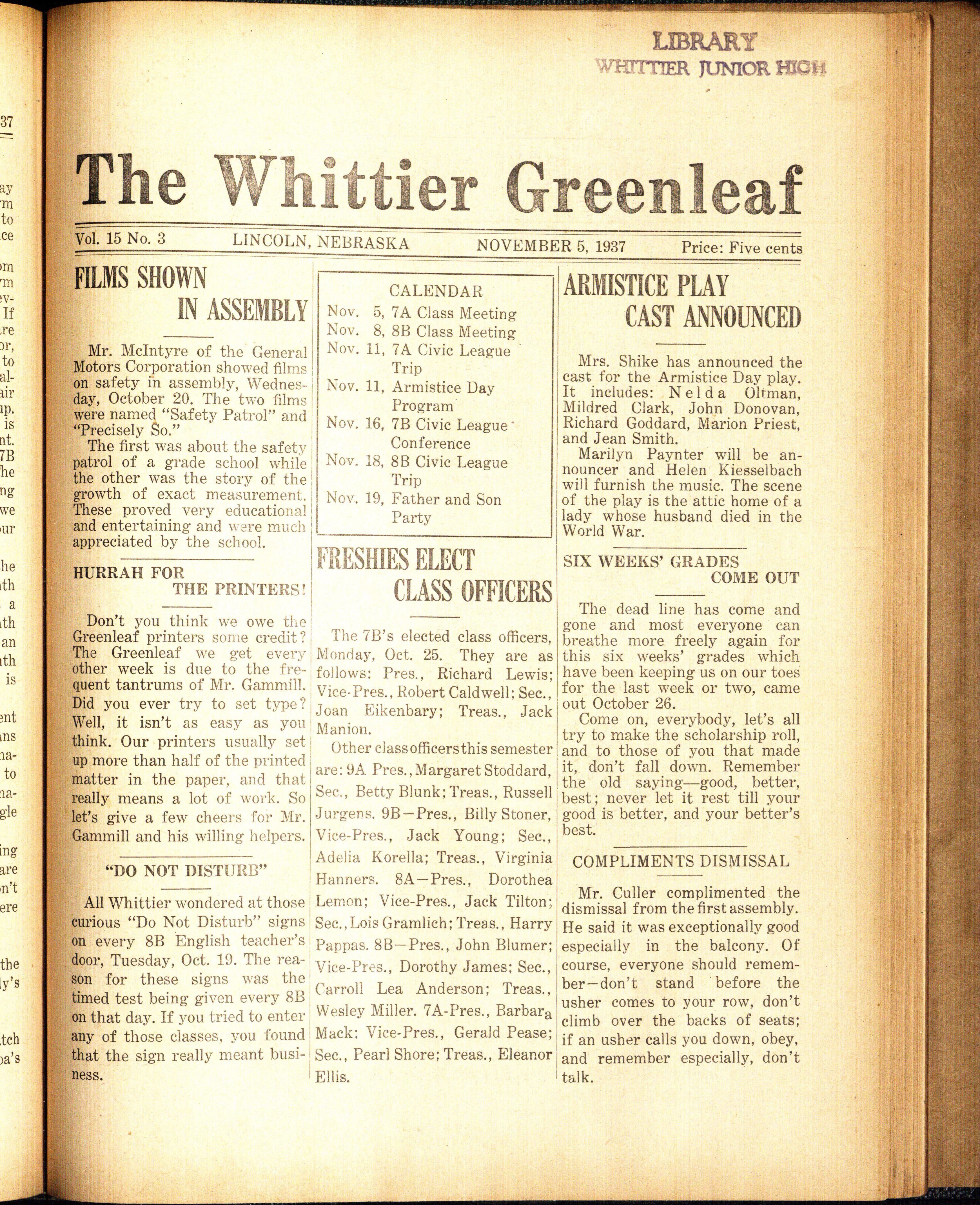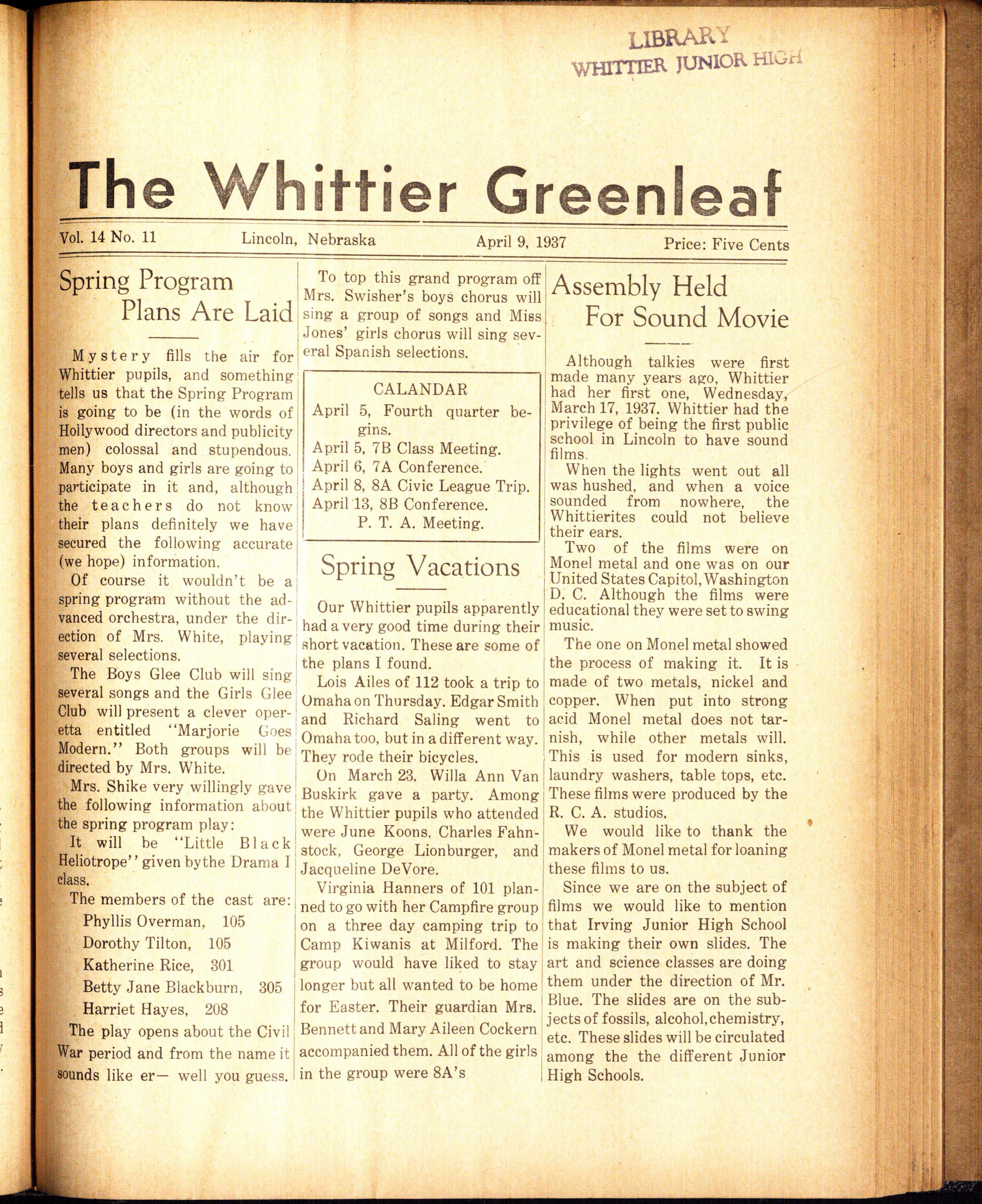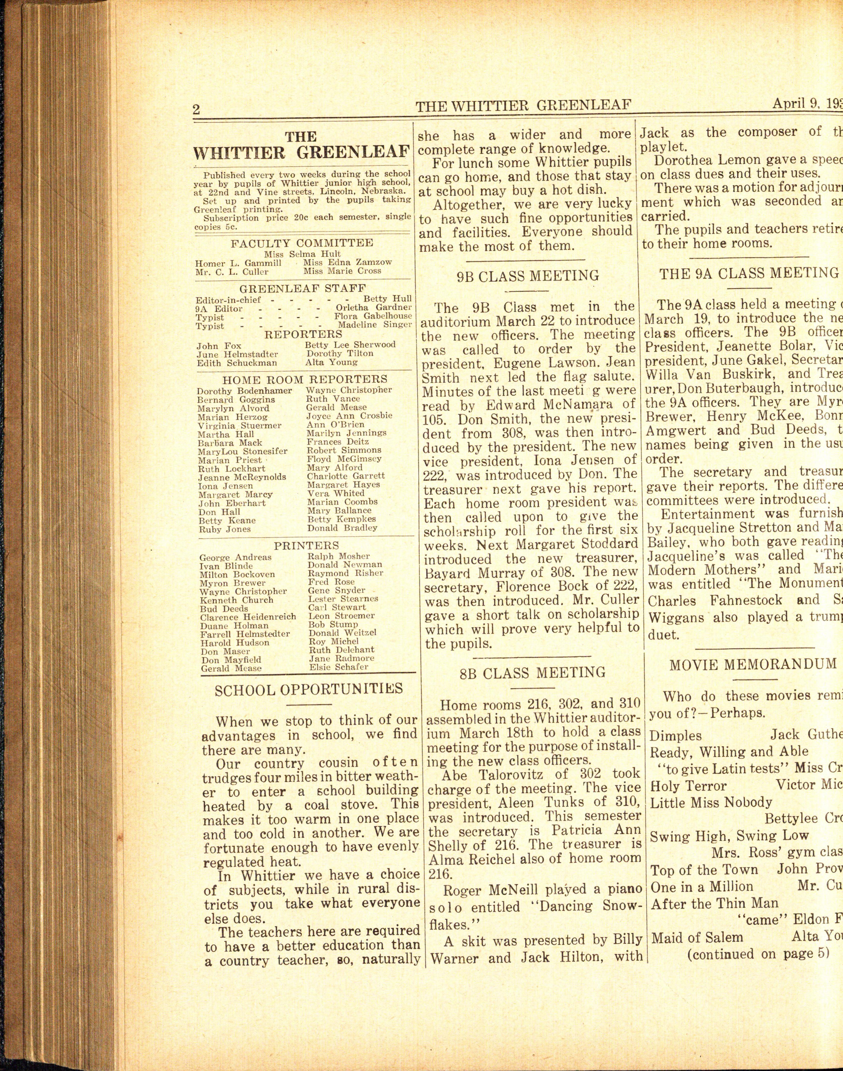 y e ar by pupils of Whittier junior hi g'h school, at 2 2 nd and Vin e s tree ts, Lincoln, N ebra ska