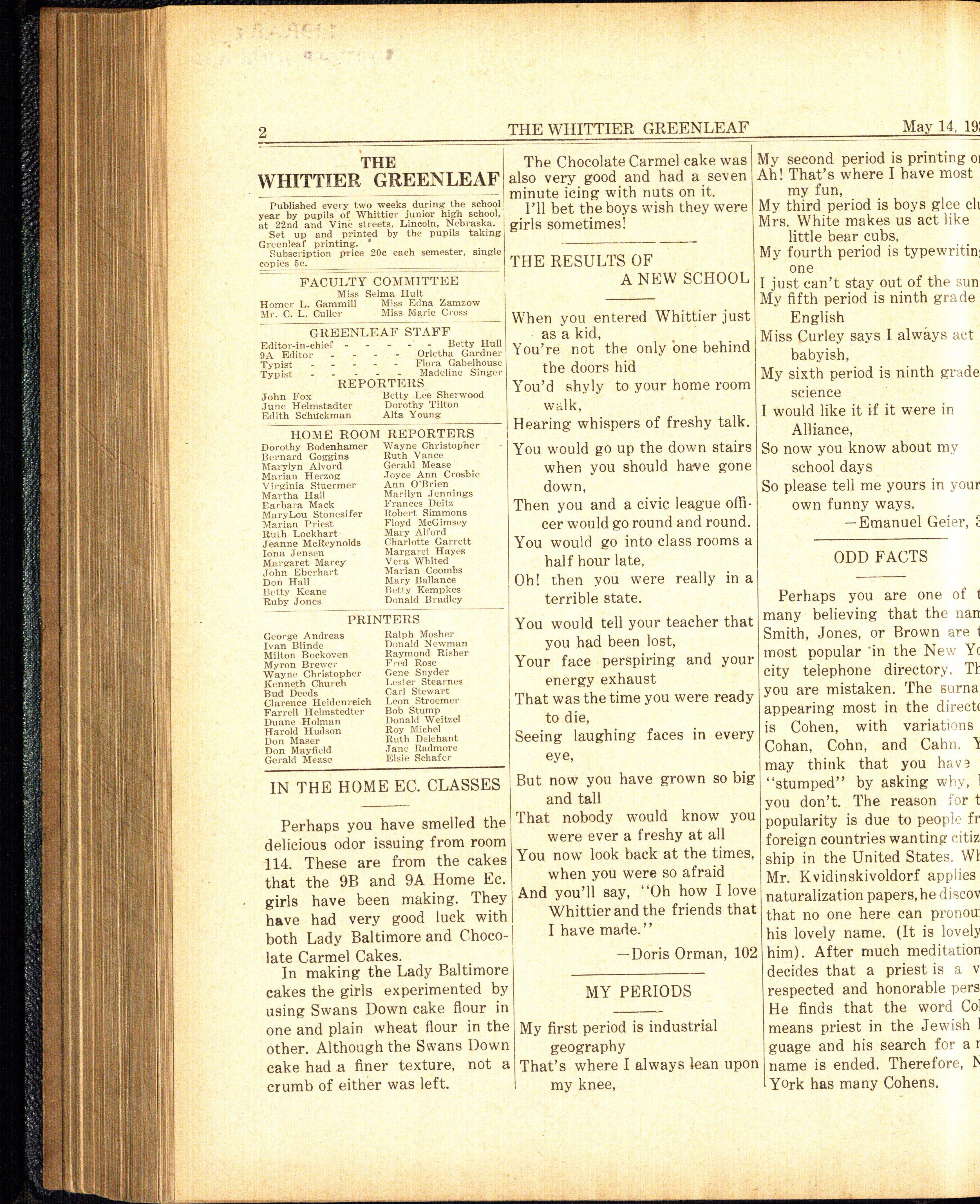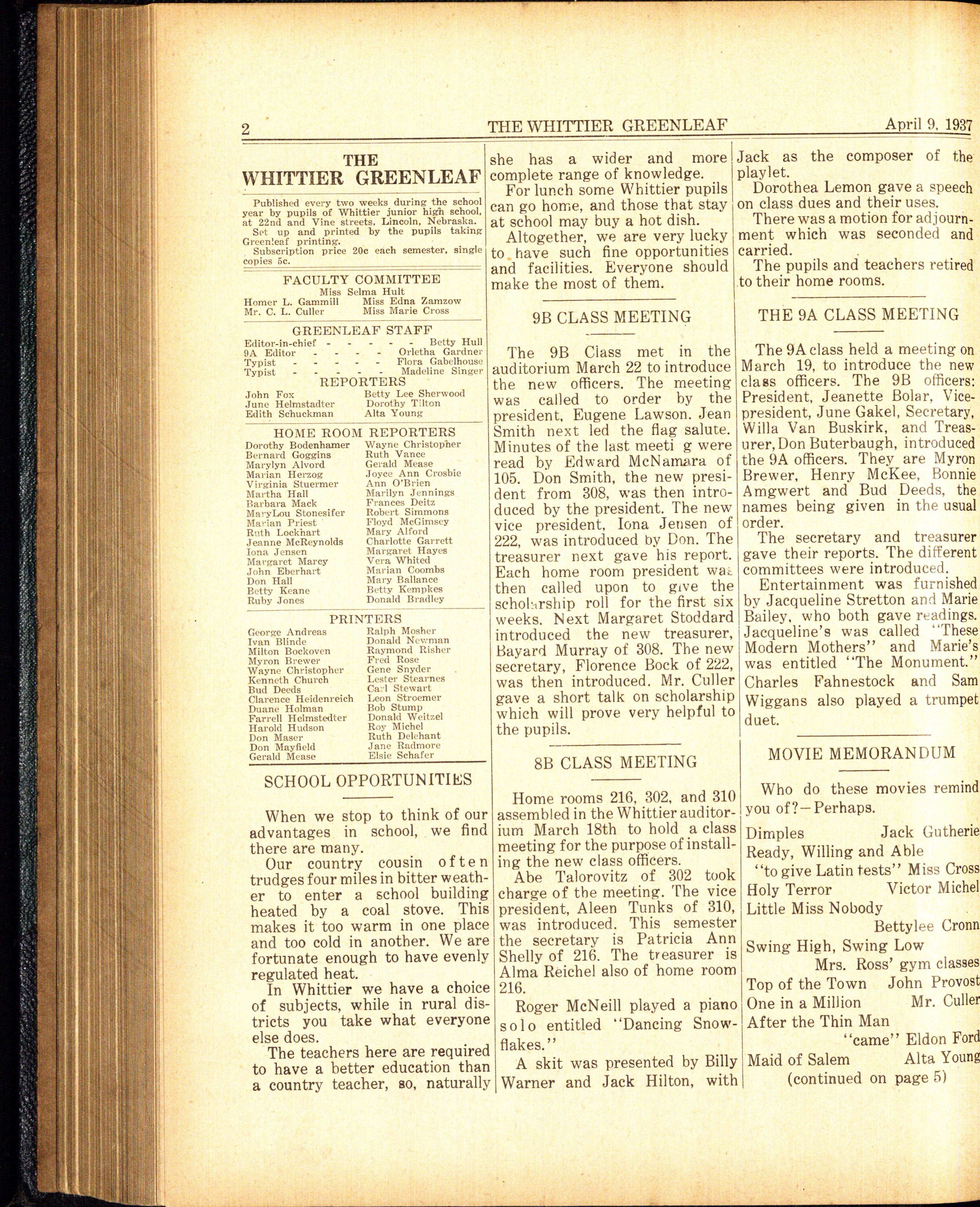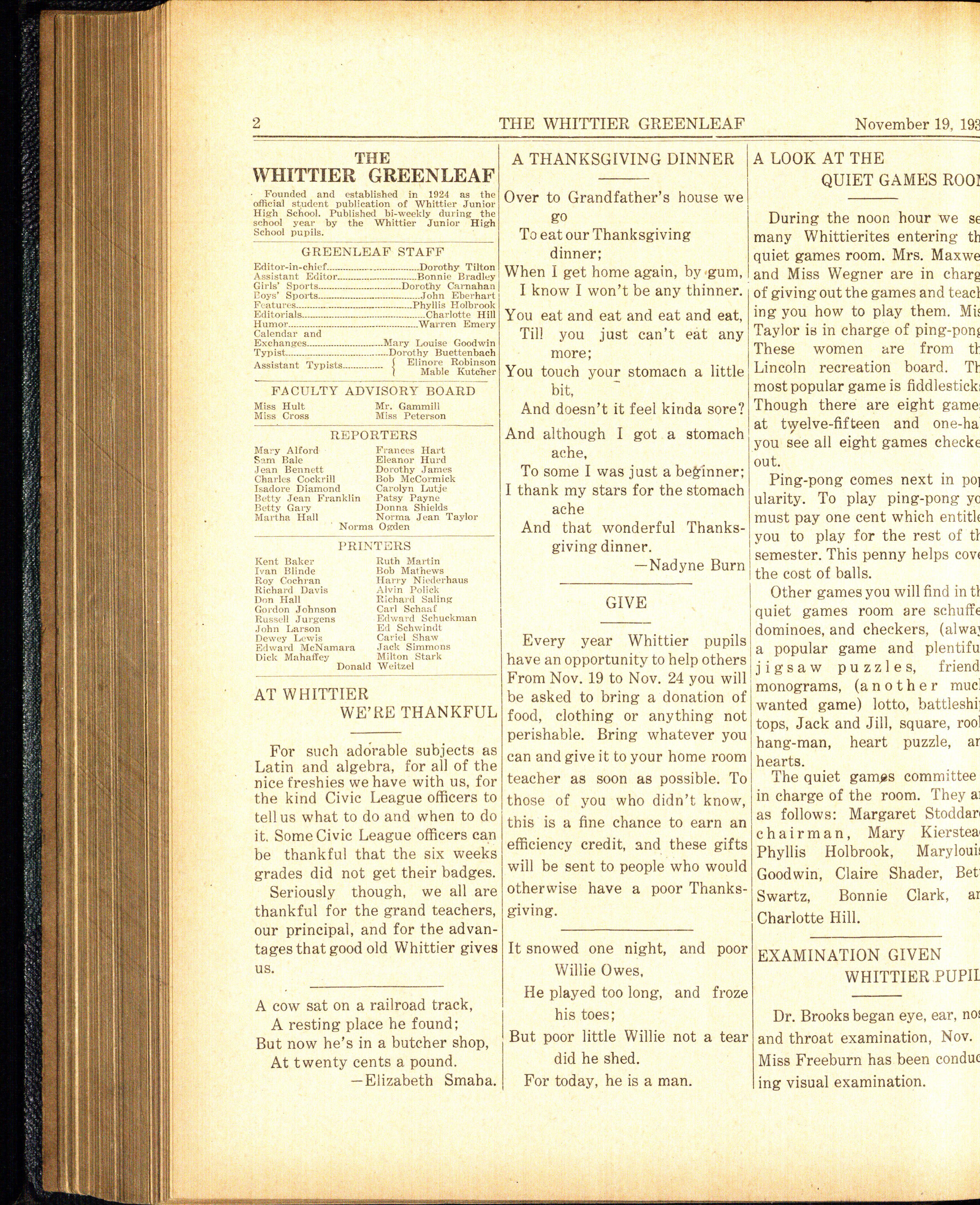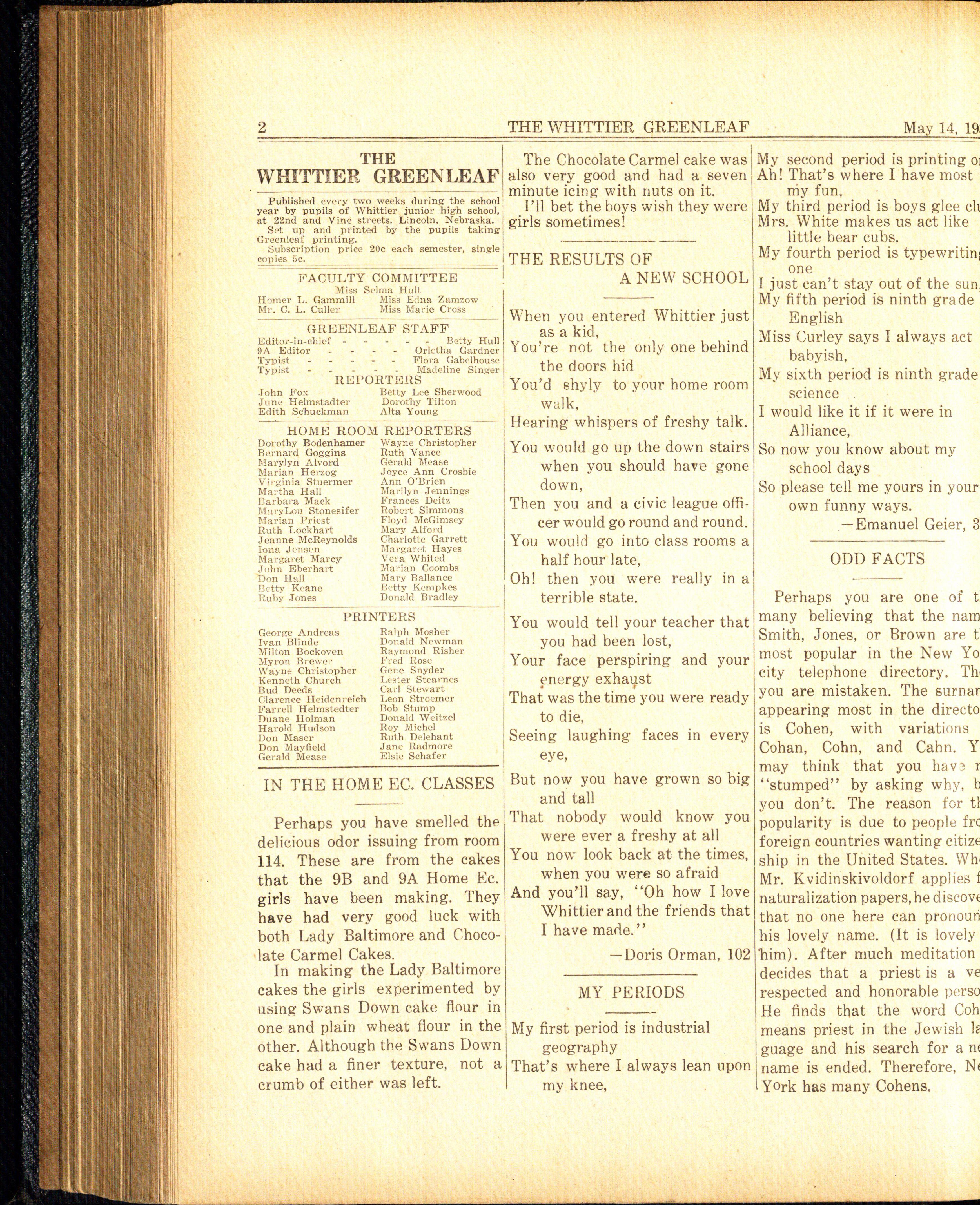 y e ar by pupils of Whittier junior hi g'h school, at 2 2 nd and Vin e s tree ts, Lincoln, N ebra ska