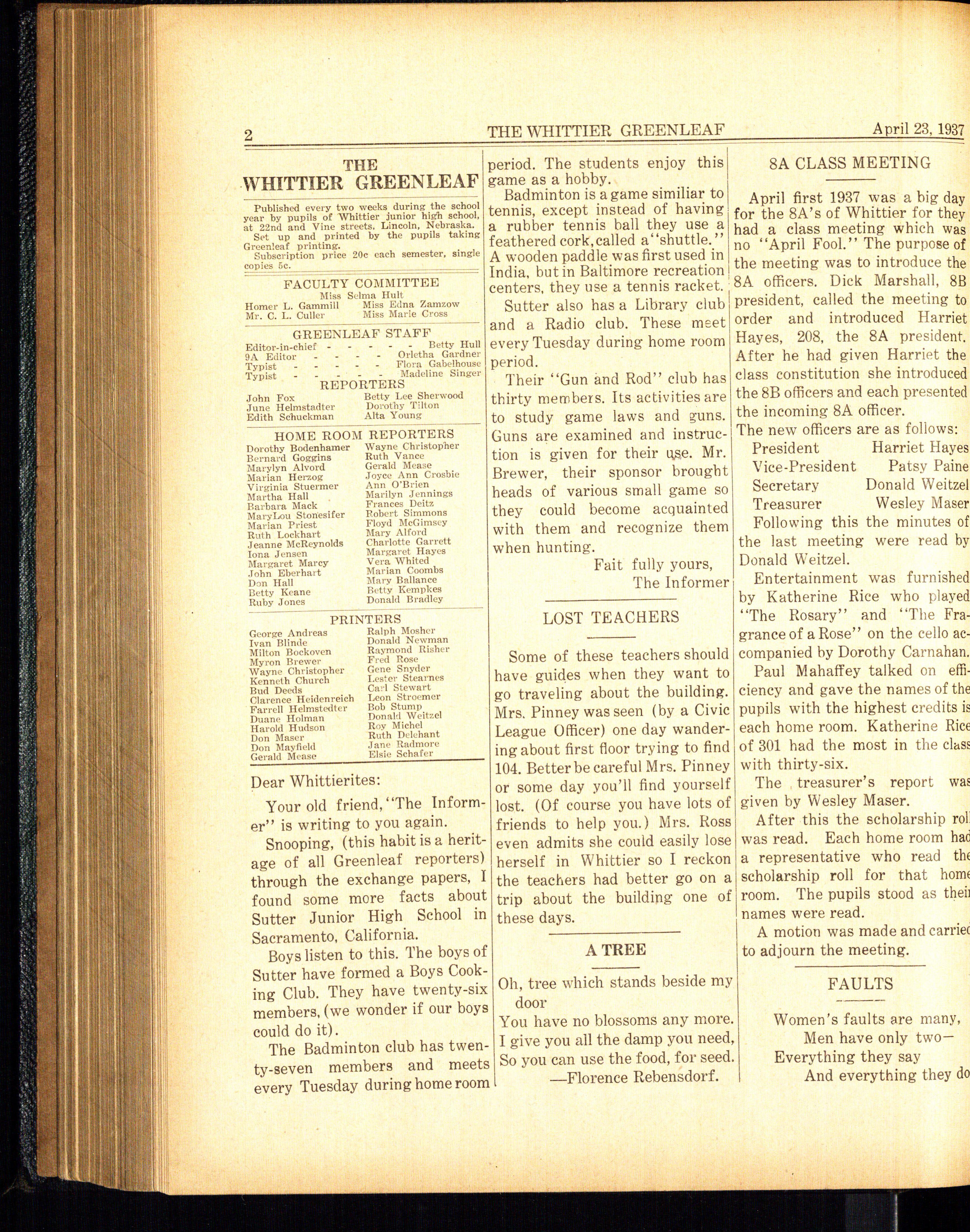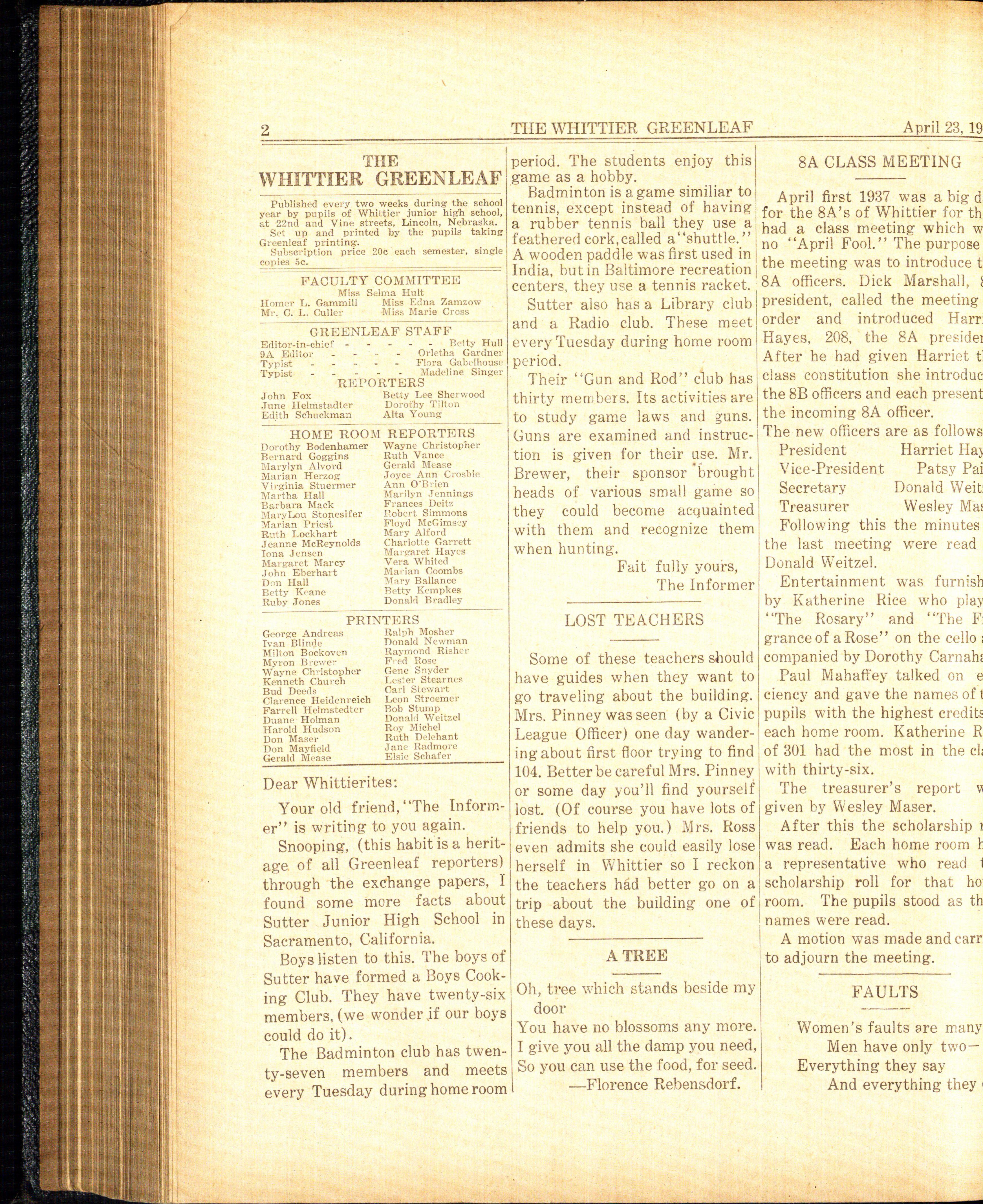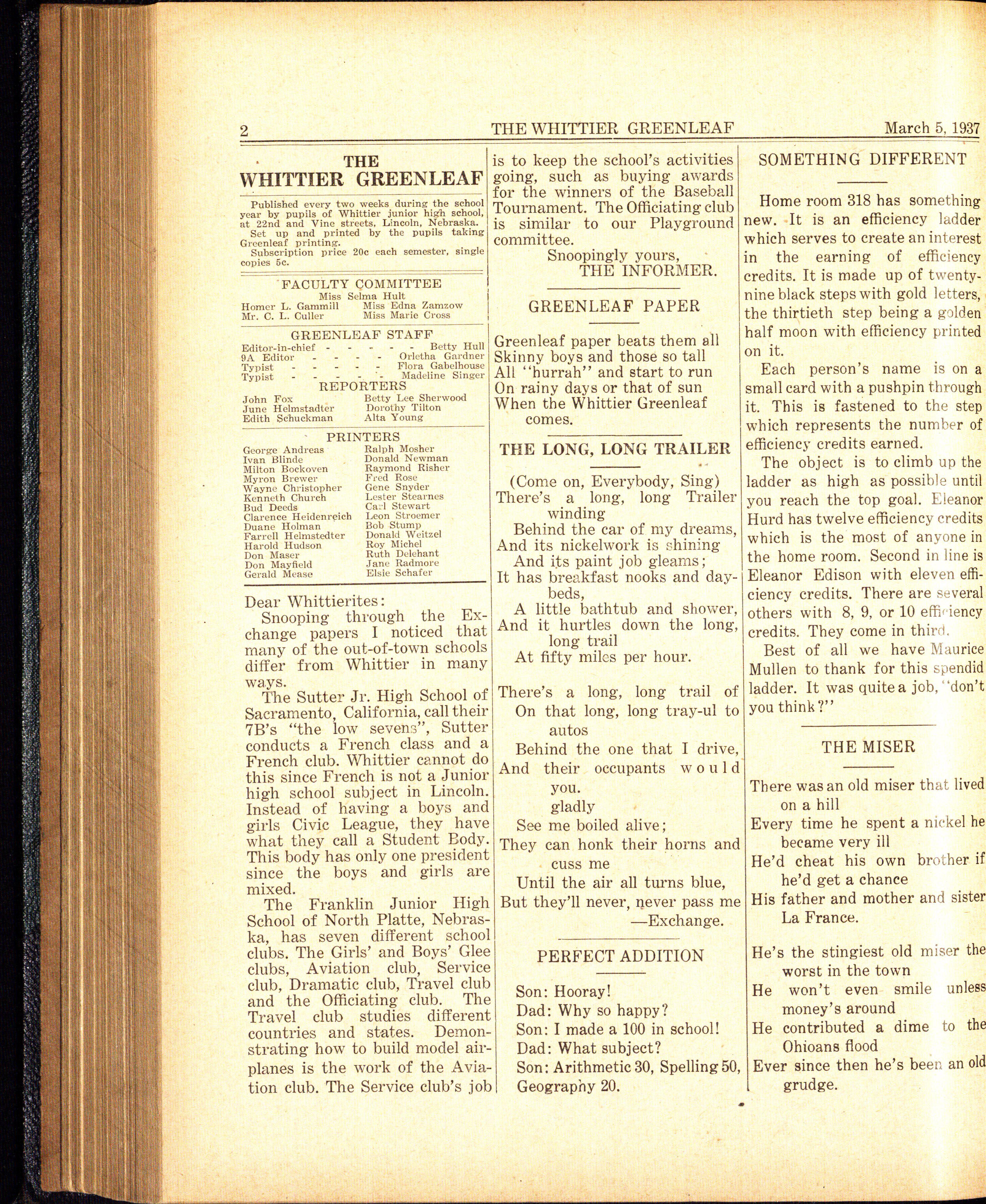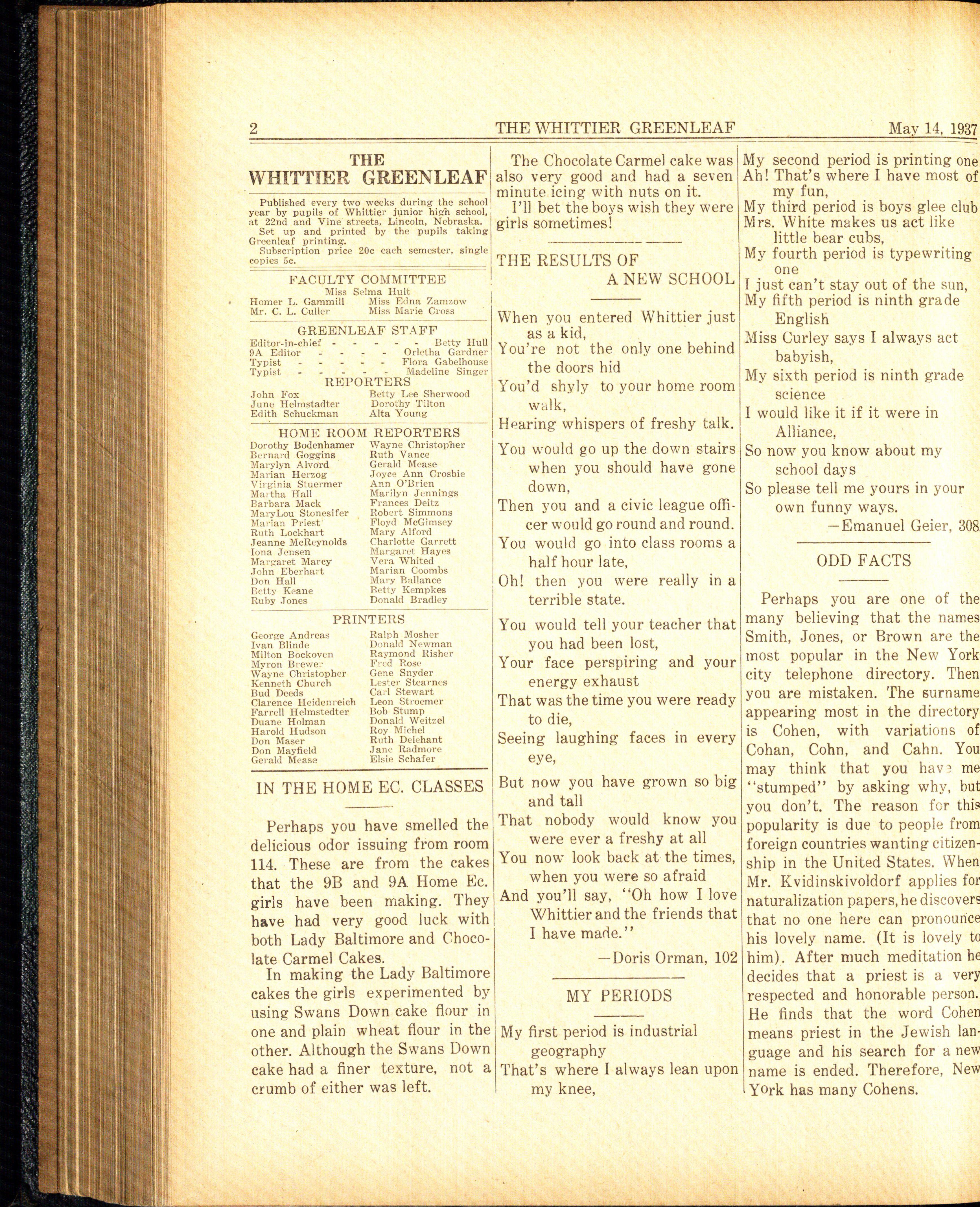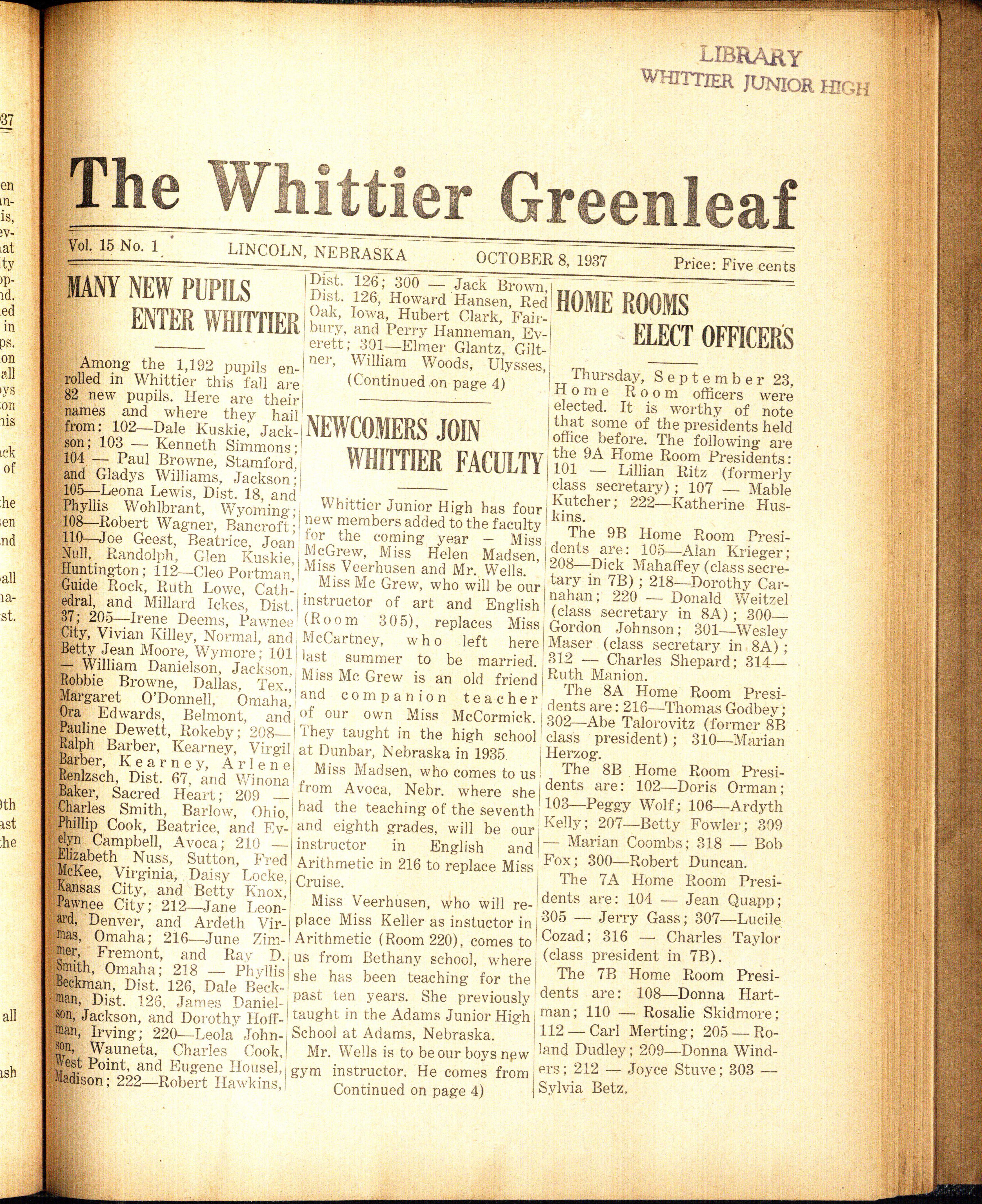 y e ar by pupils of Whittier junior hi g'h school, at 2 2 nd and Vin e s tree ts, Lincoln, N ebra ska