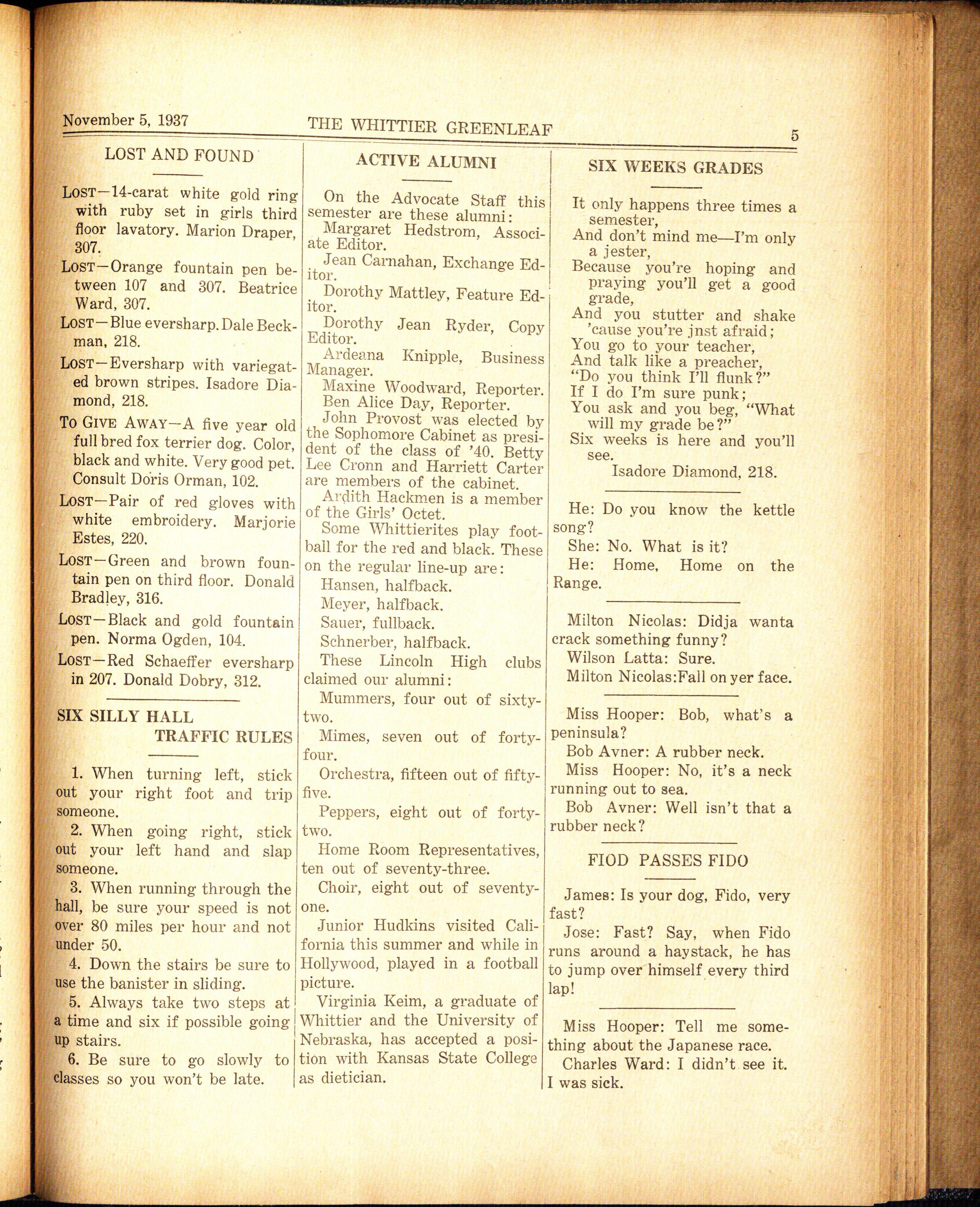 Attention, veteran Whittierites! Whittier wants all of you to play the parts of Good Samaritans. If you feel qualified for this position apply on the first, second and third floors of Whittier and give aid to the bewiidered freshies that wander aimlessly around the halls after the class bell has rung, wondering what it's about. Answer any puzzling questions and your reward will be their numerous and grateful thanks.