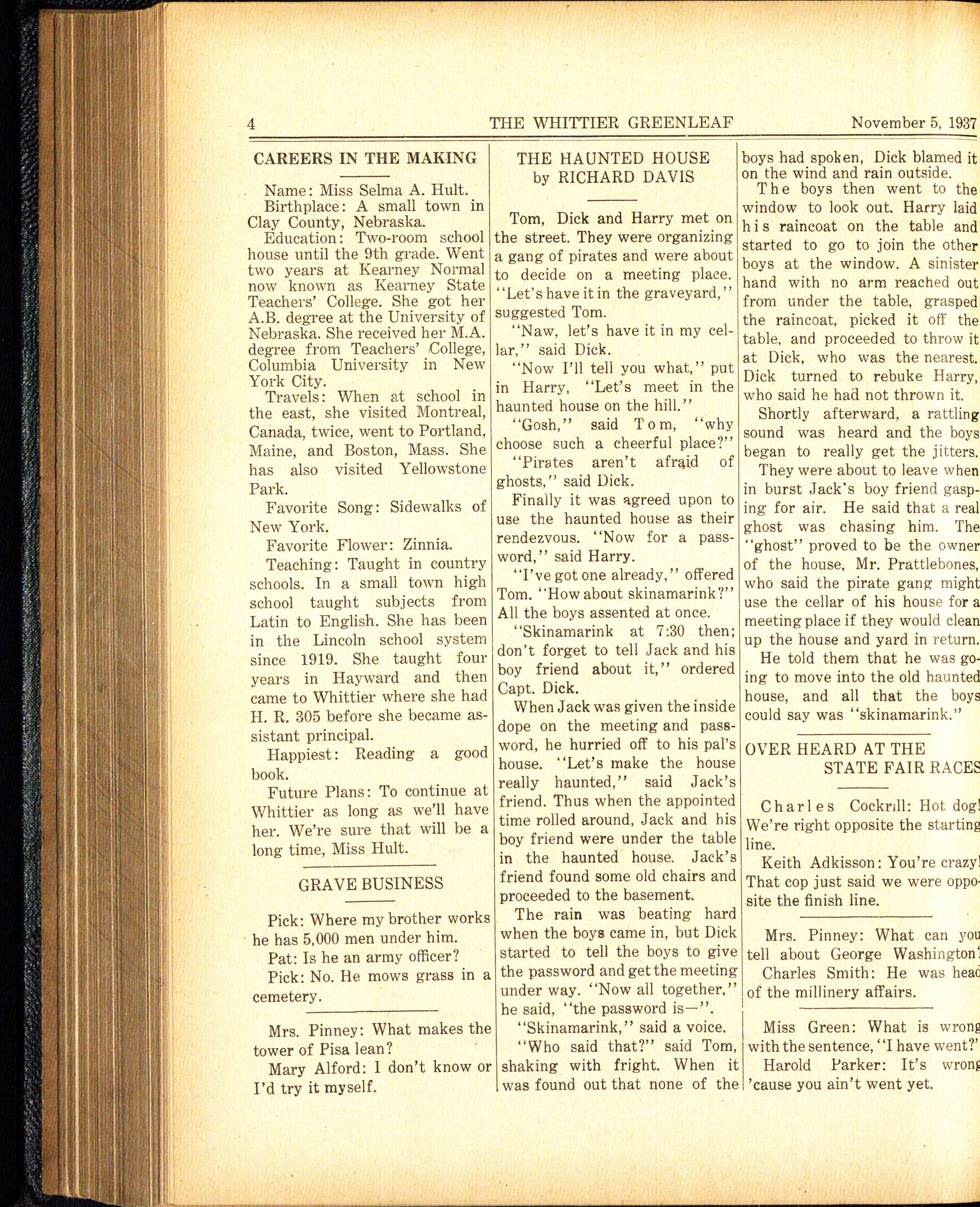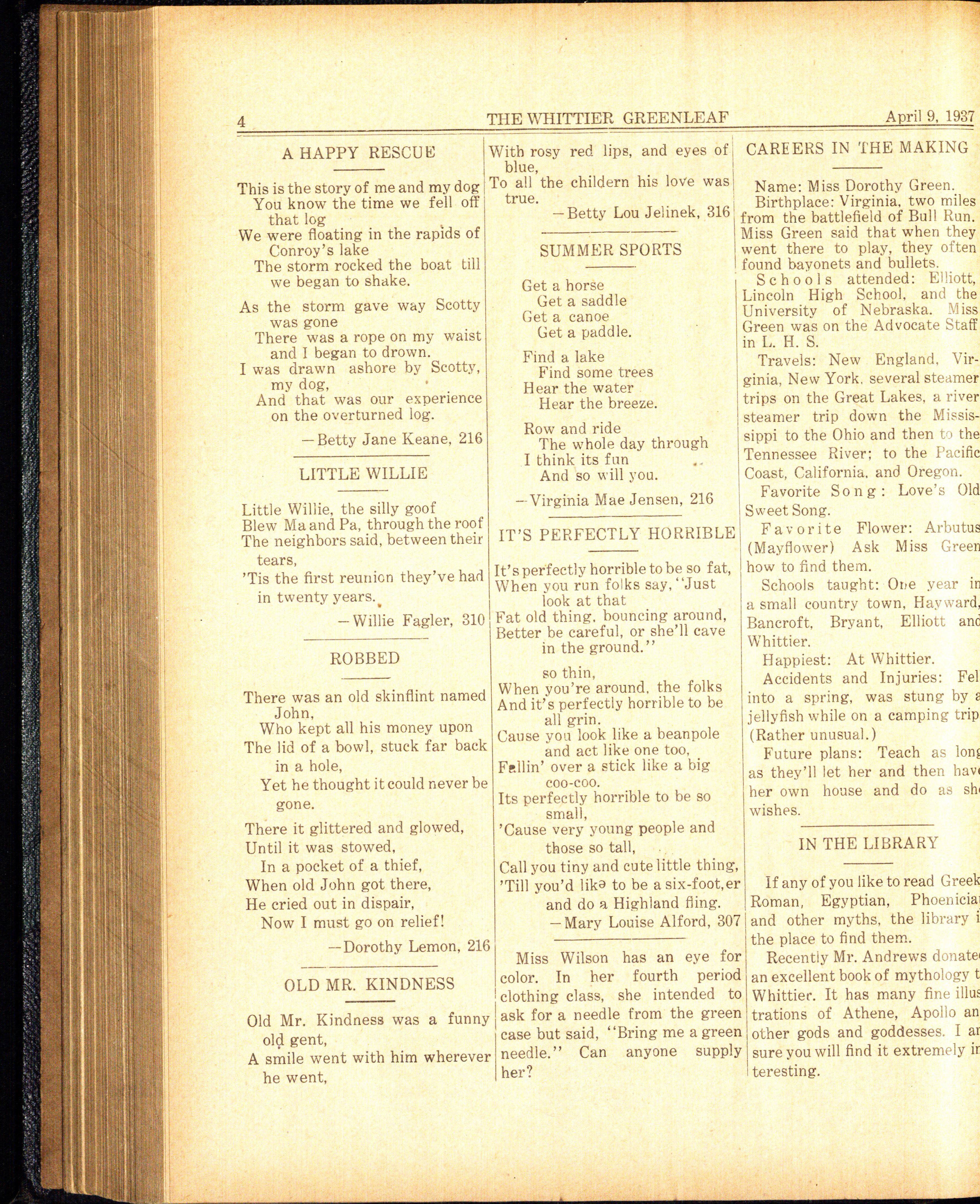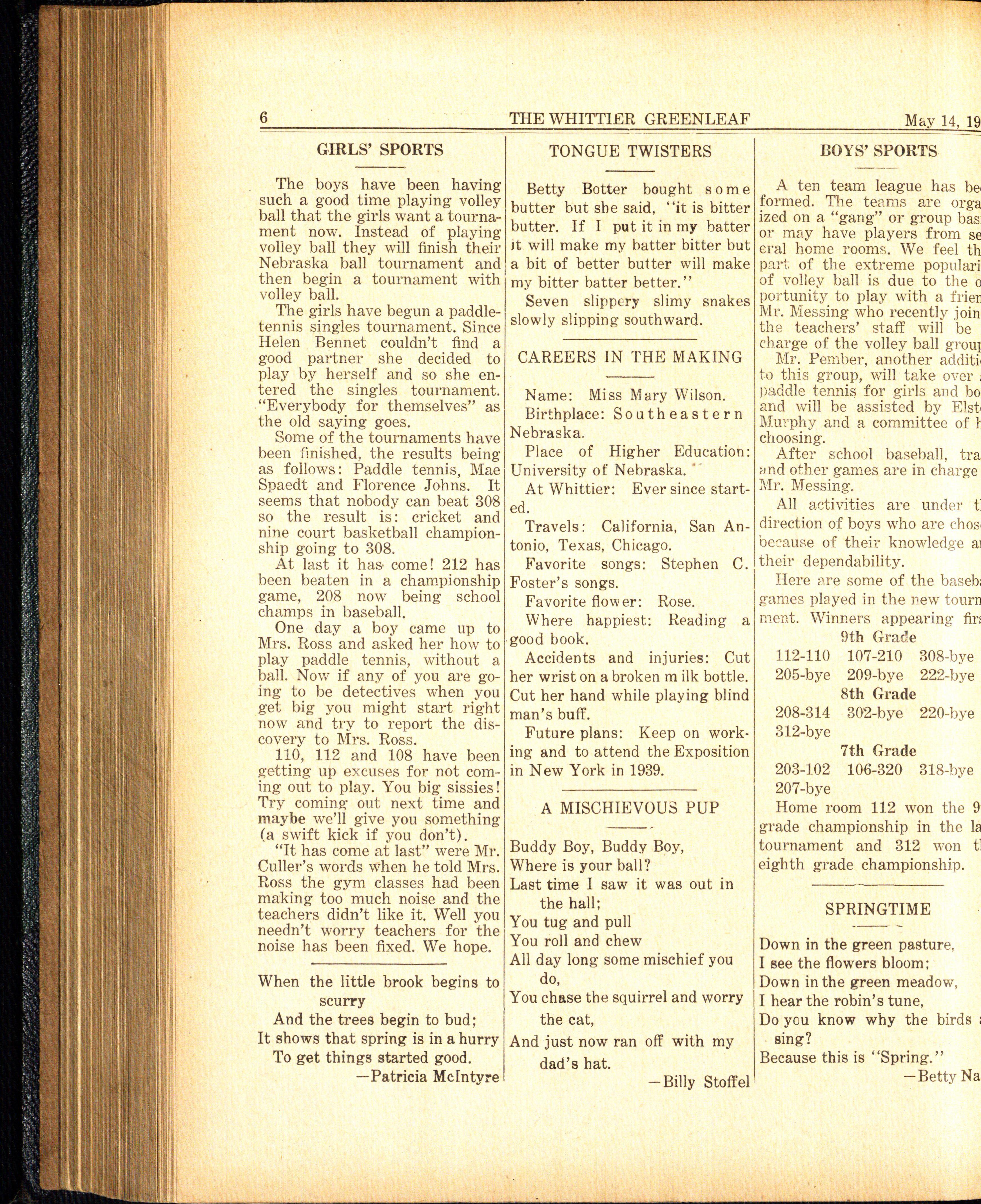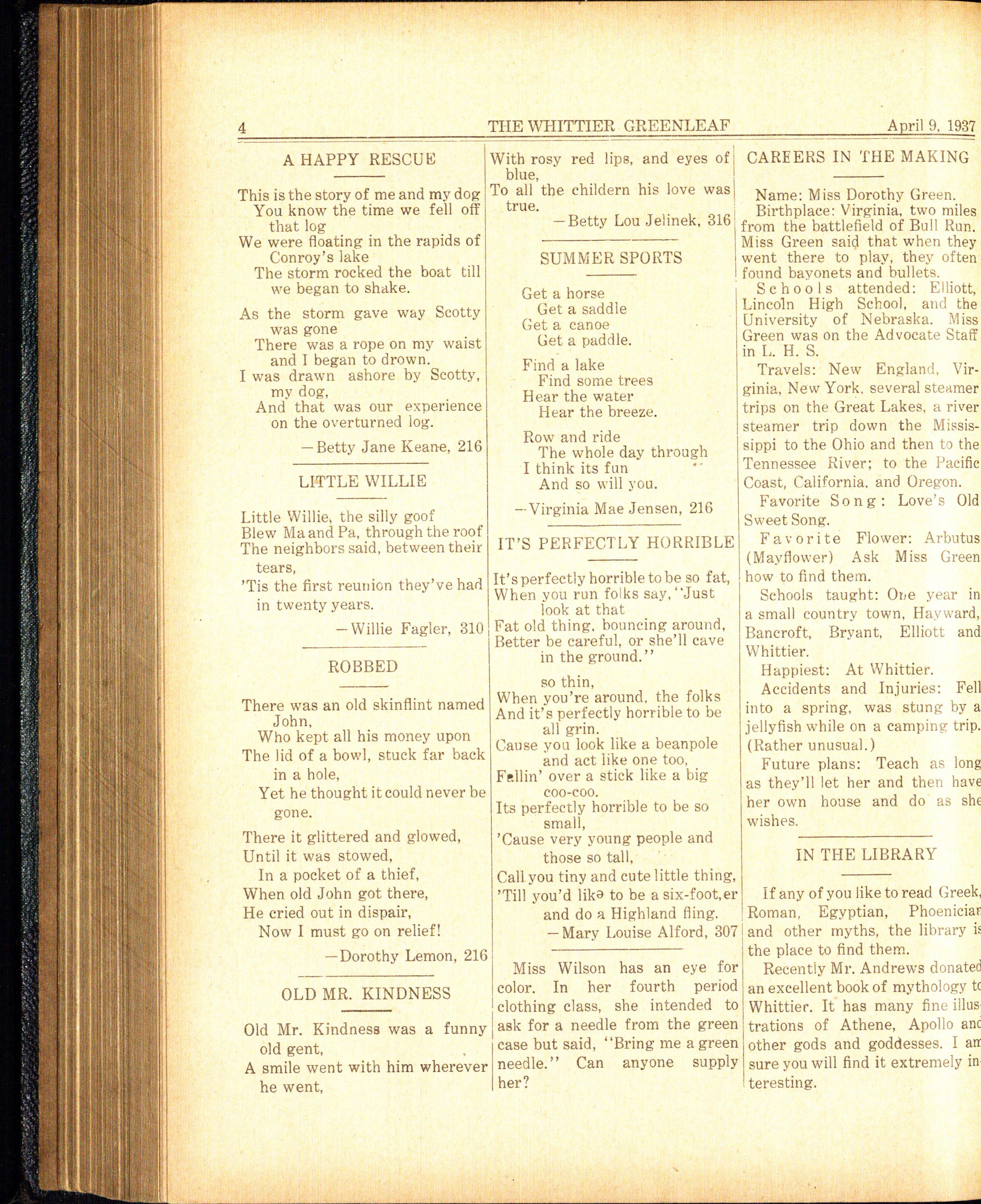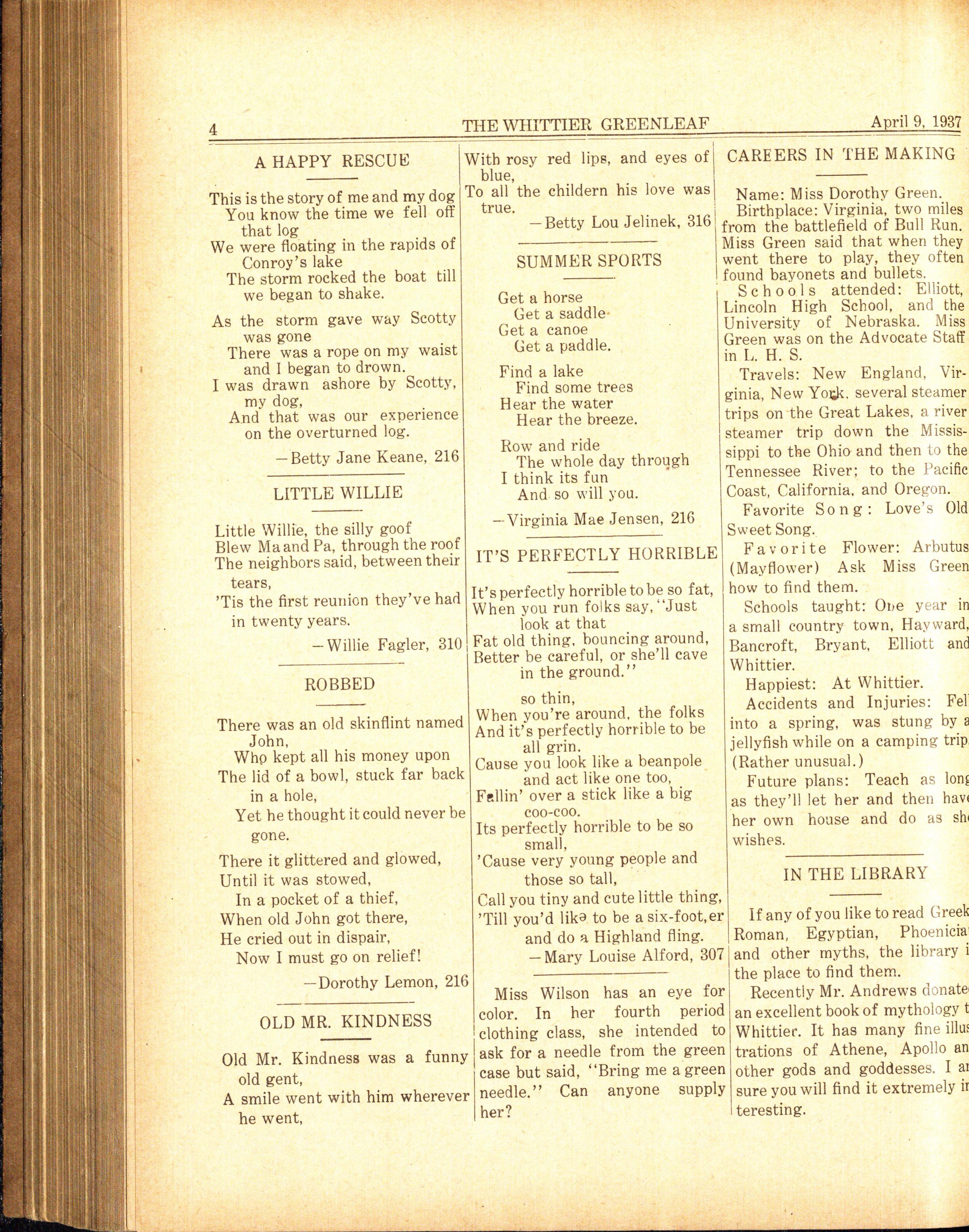 Elizabeth Ann Smaha wrote the Limerick and Sad Story in the last issue of the Greenleaf. Her name was accidentally omitted.
