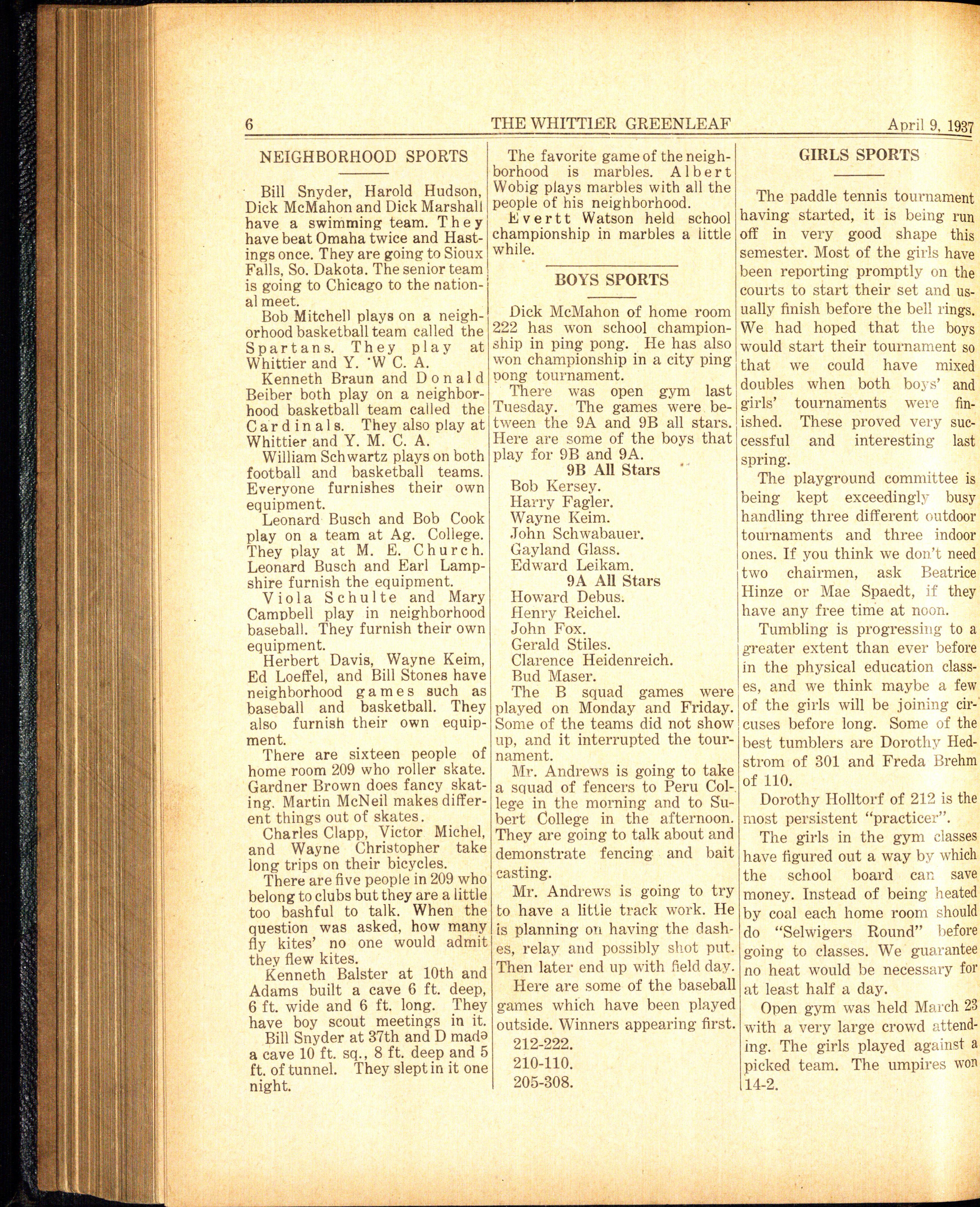 A review of tournaments this Schneider, and Jim Danielson. In phys. ed. there are thi1 semester. The baseball tourna- Dick Marshall: Not to get sent called skill tests. These ar e ment was won by 208, Nebraska to the office more than t.wice a determine how good an indiv ball by 222, and three base by week (it's a good average). ual is. If you make 60 points 222. Virginia Stuermer and Alice Saxton: I will try to keep any five events, you get a n Virginia Hanners won the first from falling over things. It's paddle tennis tournament. hard on them and me. Robert ficiency credit. So far n on e