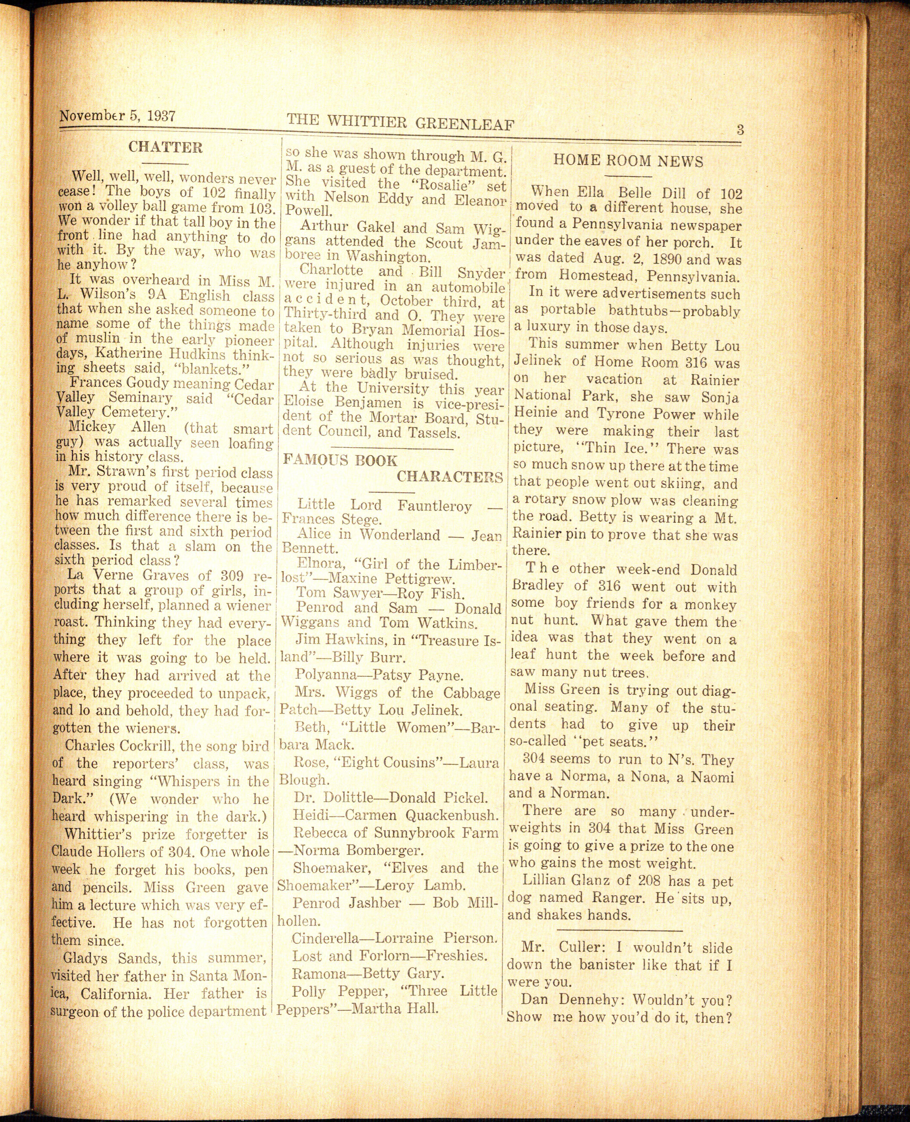 Richard Baile Y, Lewis for the Greenleaf. It also conBerlowitz, Elliott Boberg, Marian tained a booby prize for the Coorn bs, Donna Fiske, Jack Giel, Lorr a in e Gorman, La Verne home room having the fewest Graves, Samuel Grunger, Shirley subscriptions. Hageman, Marilyn Hays, Peggy Different guests were called Hudson, William Marler, Lois upon for entertainment. Among Penton, Lucille Scharton, Donna Shields, Aileen Simpson, Ed ward the guests called upon were Skudler, Lillian Swenson, Betty Madeline Singer and Henry Mc- Wilson. Kee. They presented a skit 203 called "Wanted a Detour." A Betty Coulter, Joyce Crosbie, reading "At the Dance," and a Charles Curry, Junior Davis, Donald Gable, Jeanne Glover, tap dance were given by GeralVerda Hassenplug, W i 11 i am dine Barr. Charles Bartlett and Holbrook, Constance McBride. Victor Brooks presented a skit Patricia McIntyre, Marjorie also.