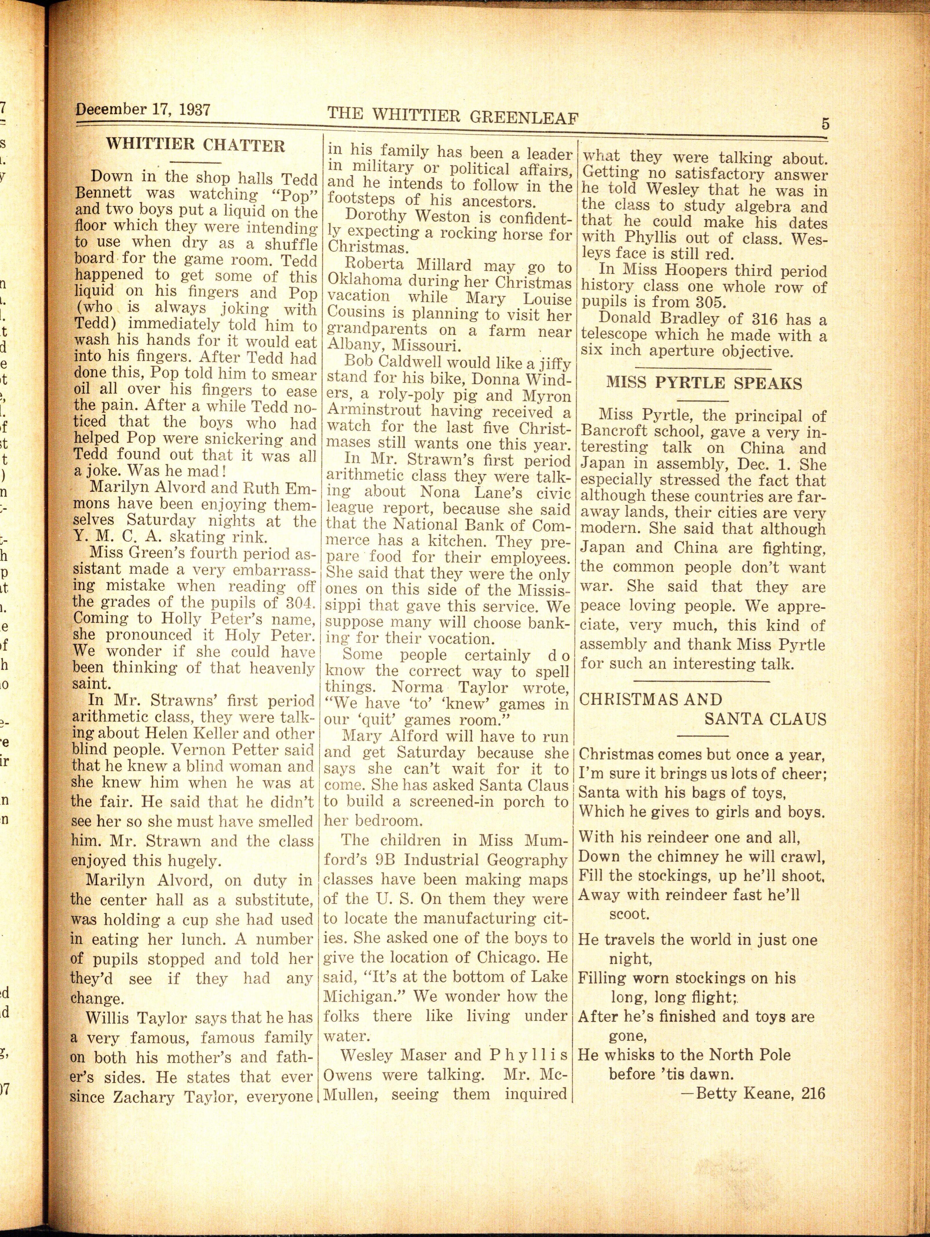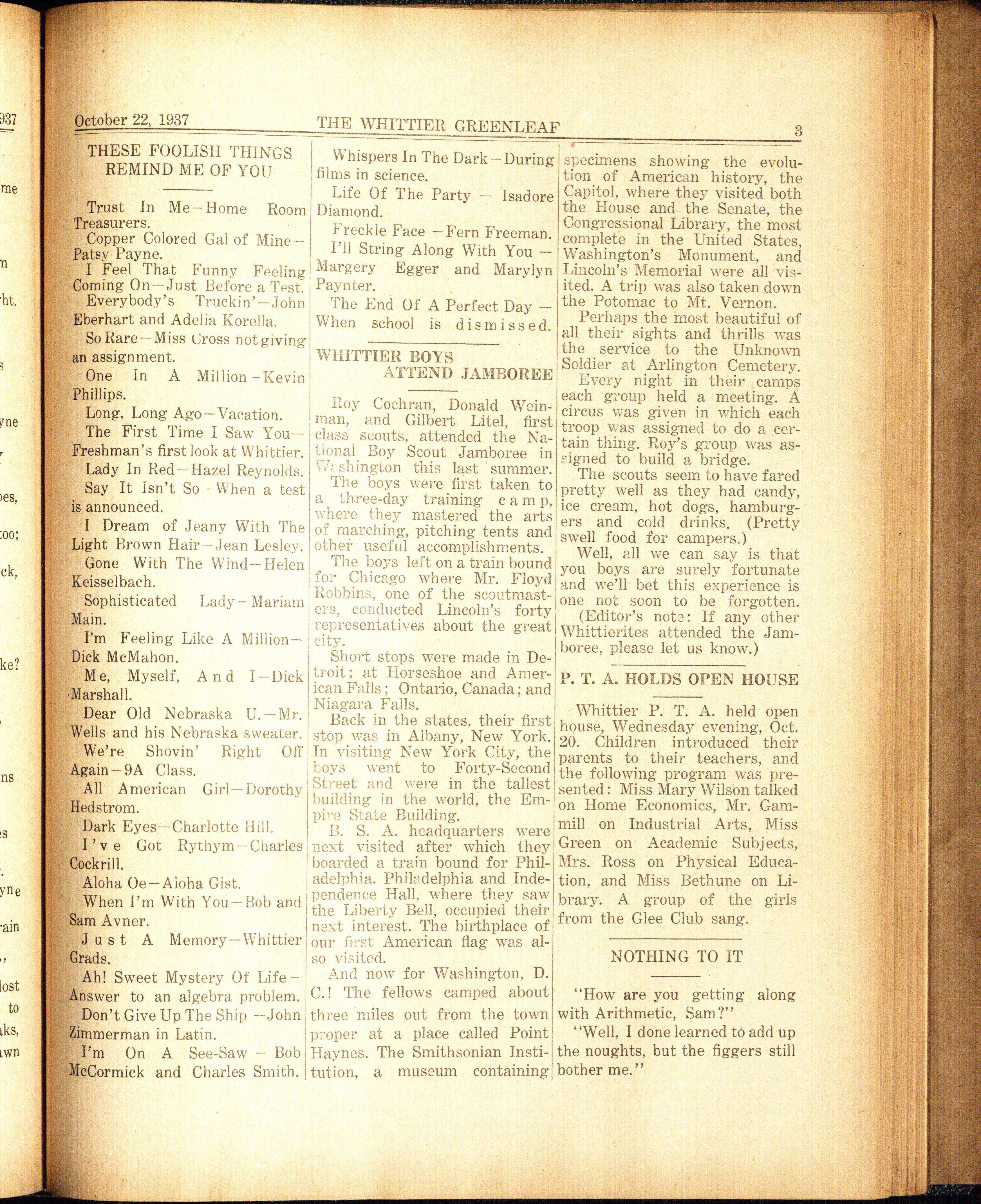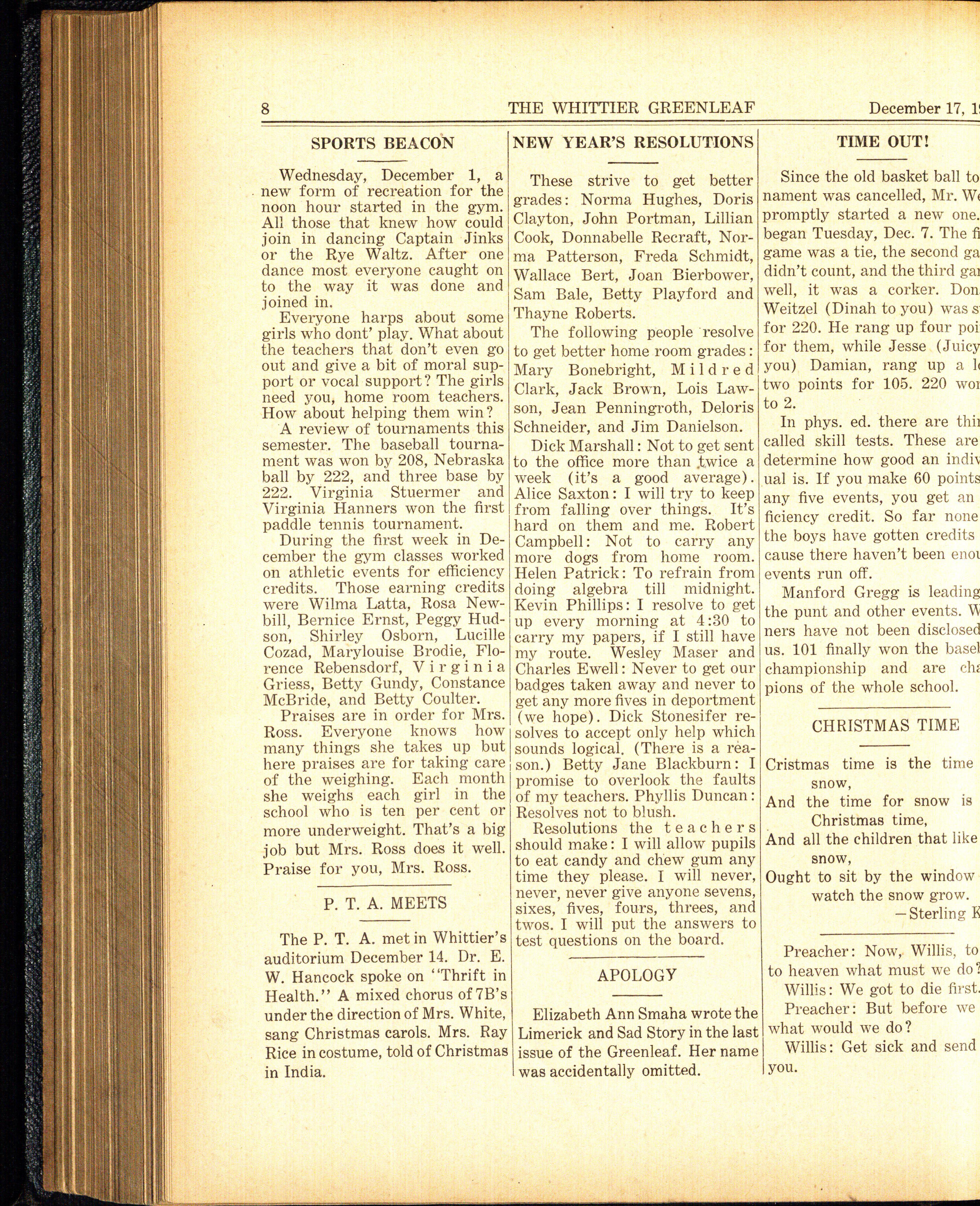 The P. T. A. met in Whittier's auditorium December 14. Dr. E. W. Hancock spoke on "Thrift in Health." A mixed chorus of 7B's under the direction of Mrs. White, sang Christmas carols. Mrs. Ray Rice in costume, told of Christmas in India.