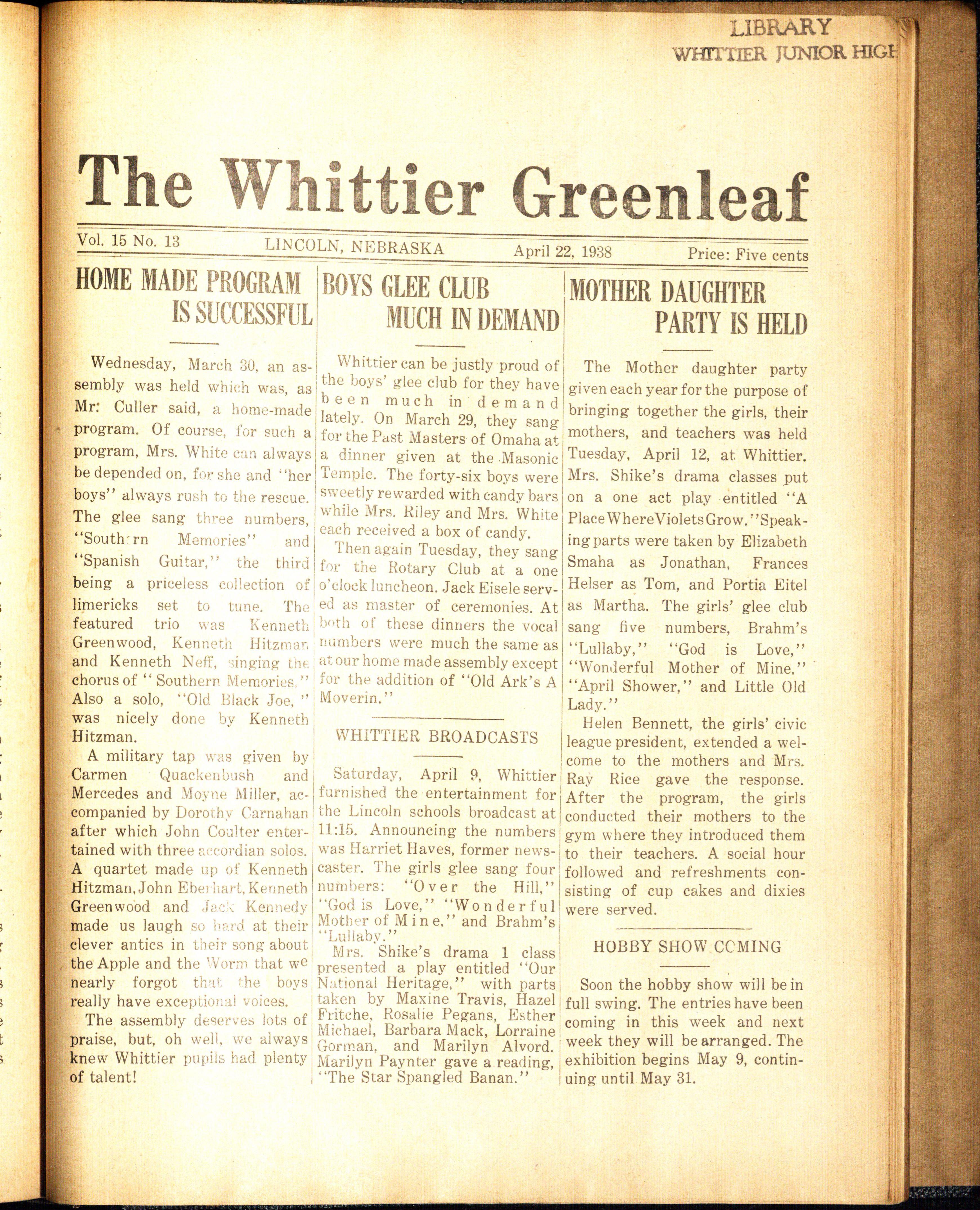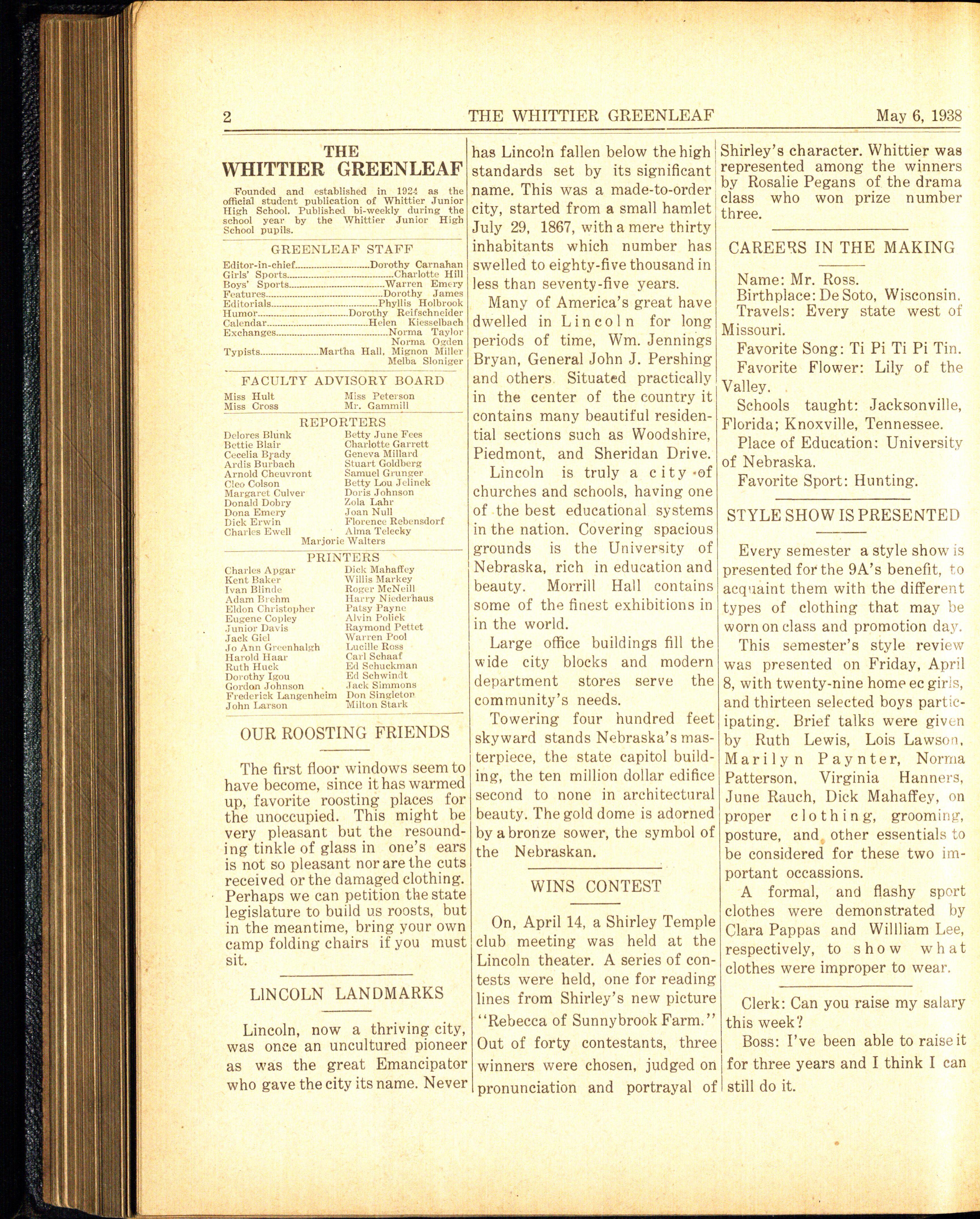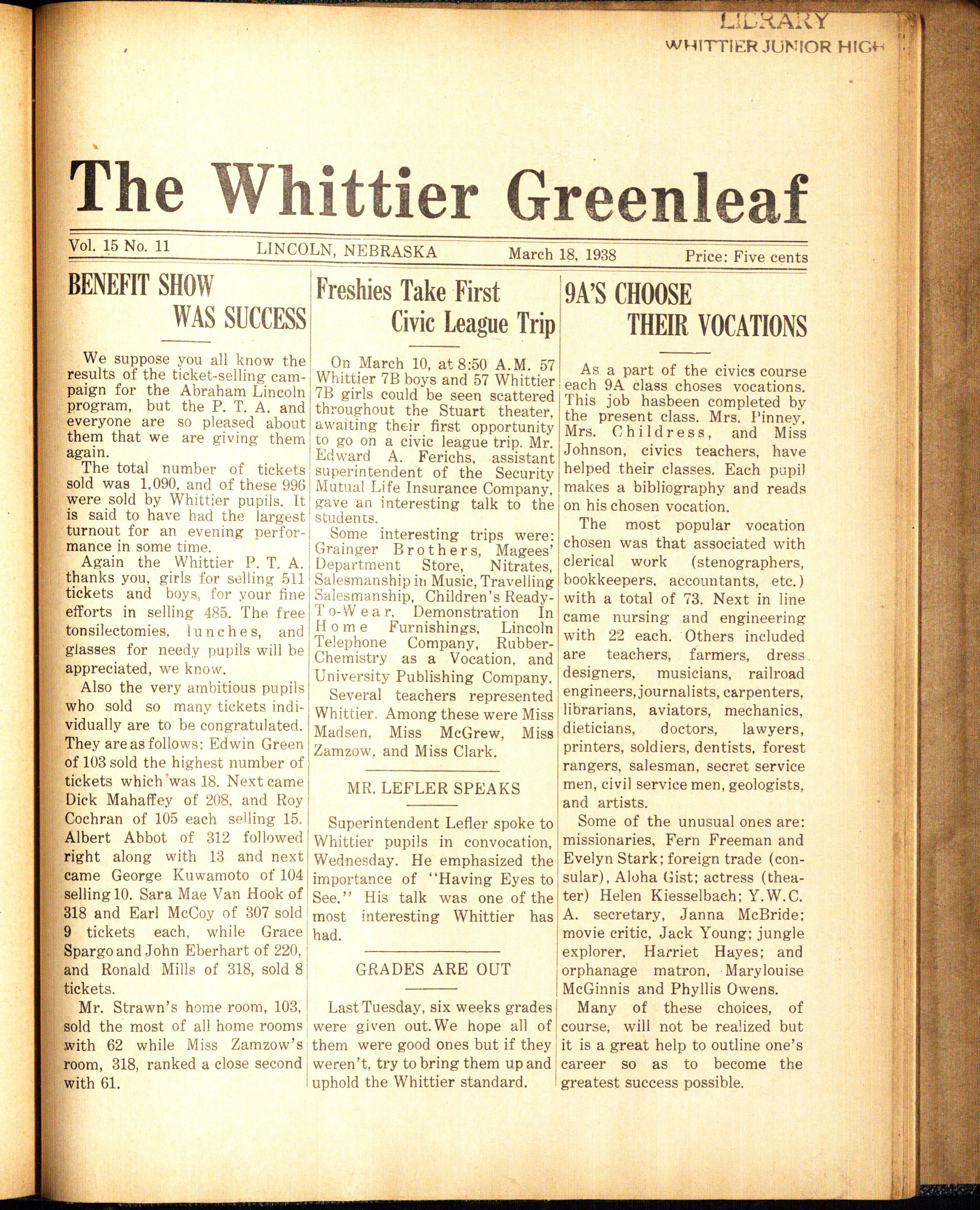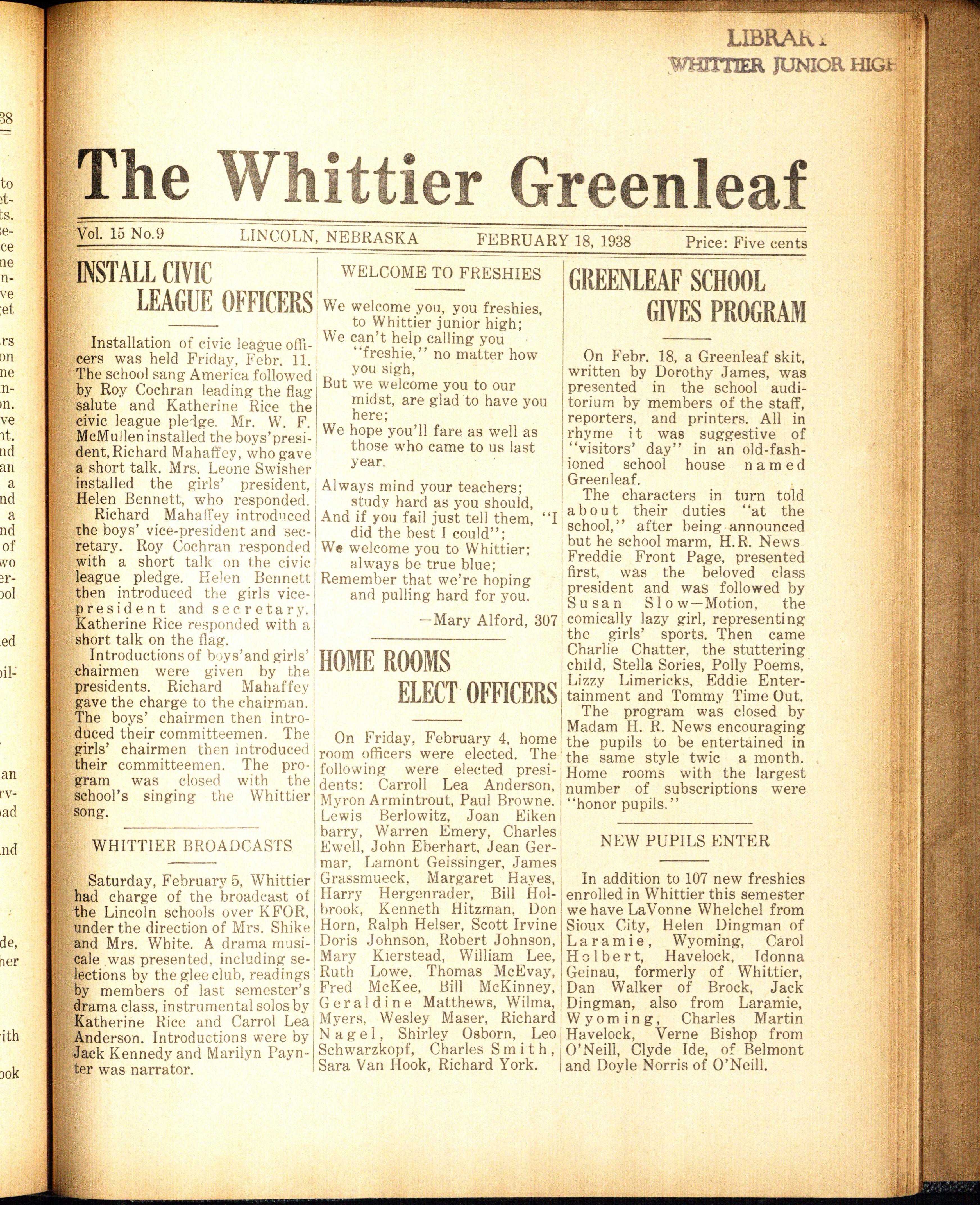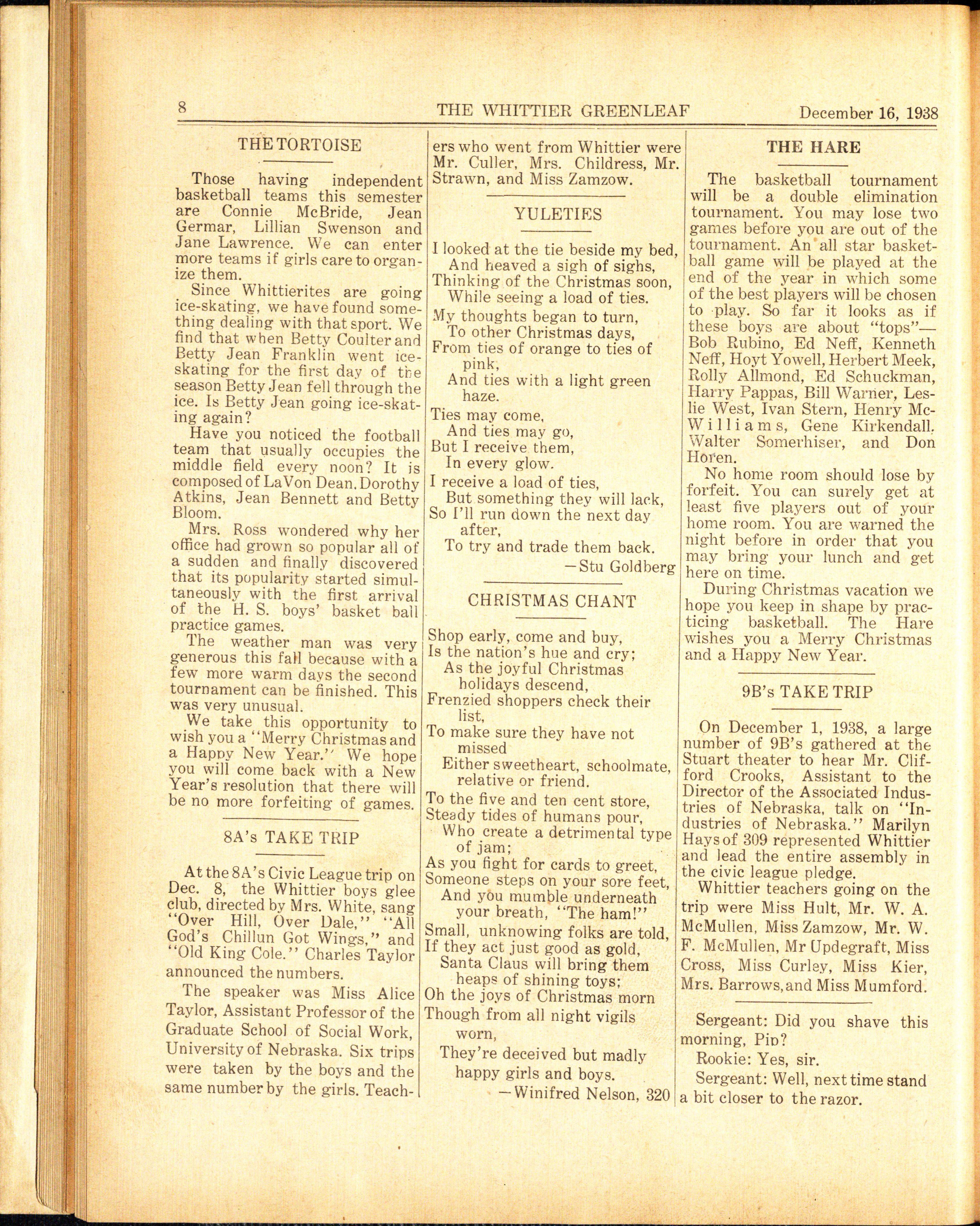 On December 1, 1938, a large number of 9B's gathered at the Stuart theater to hear Mr. Clifford Crooks, Assistant to the Director of the Associated Industries of Nebraska, talk on "Industries of Nebraska." Marilyn Hays of 309 represented Whittier and lead the entire assembly in the civic league pledge.