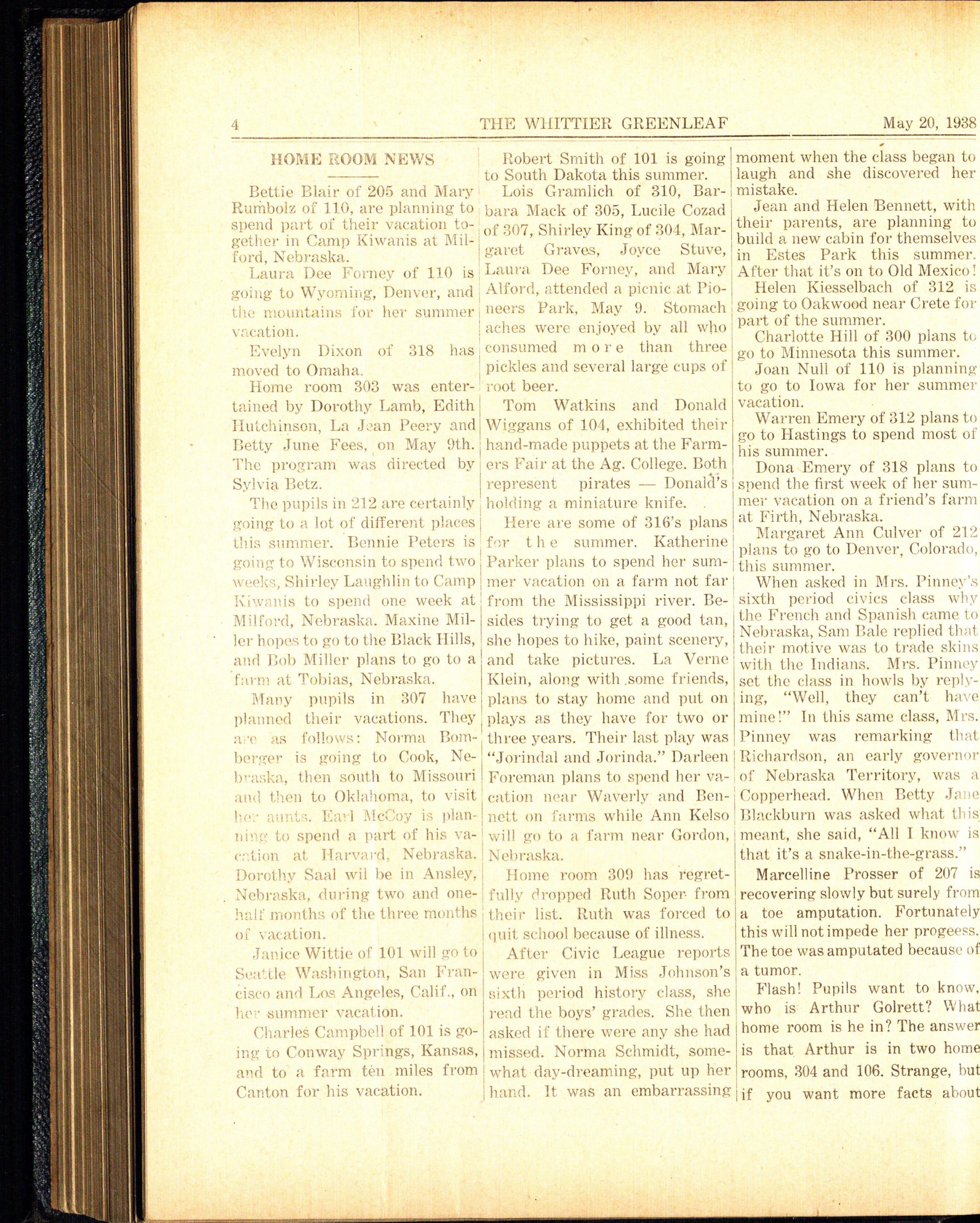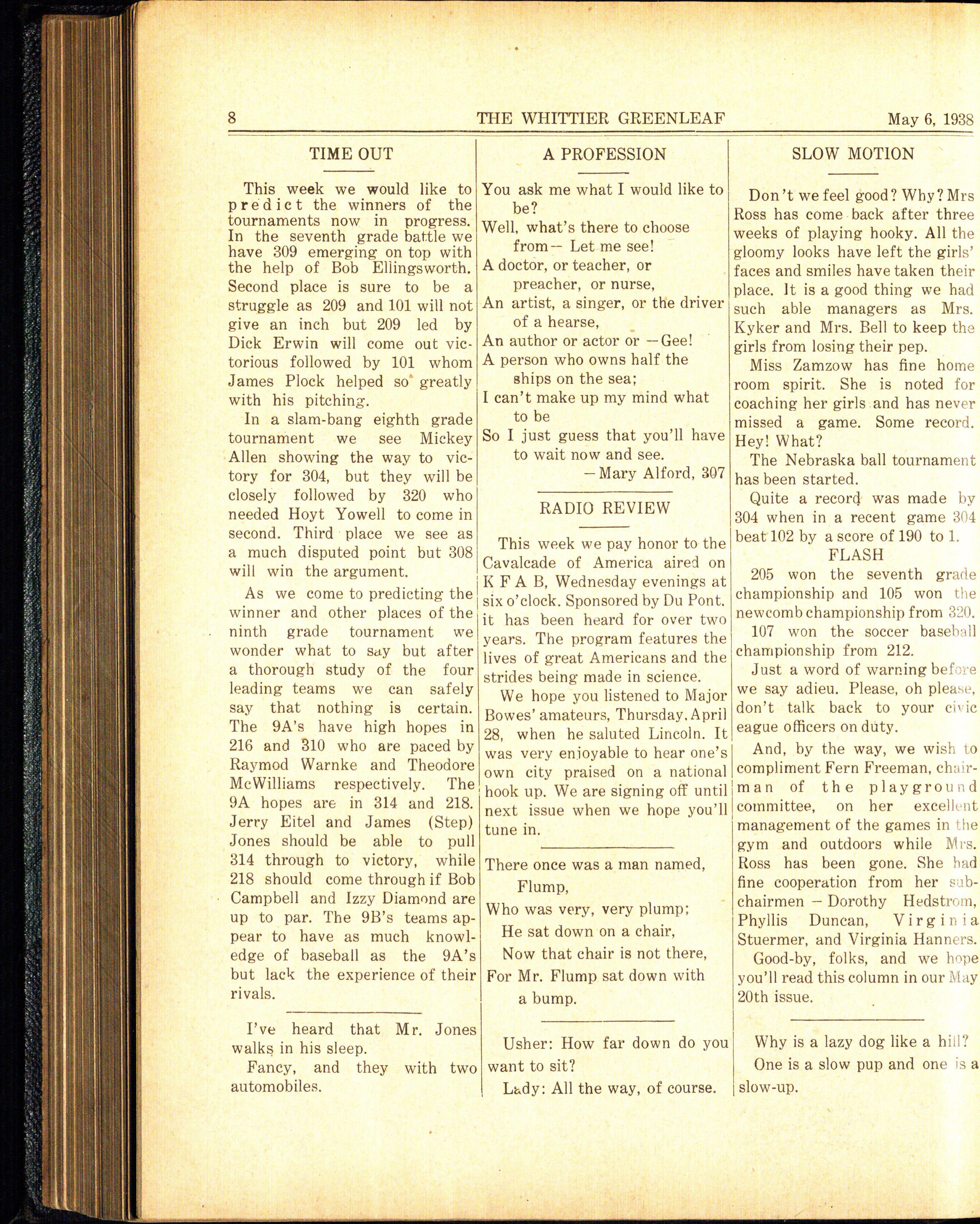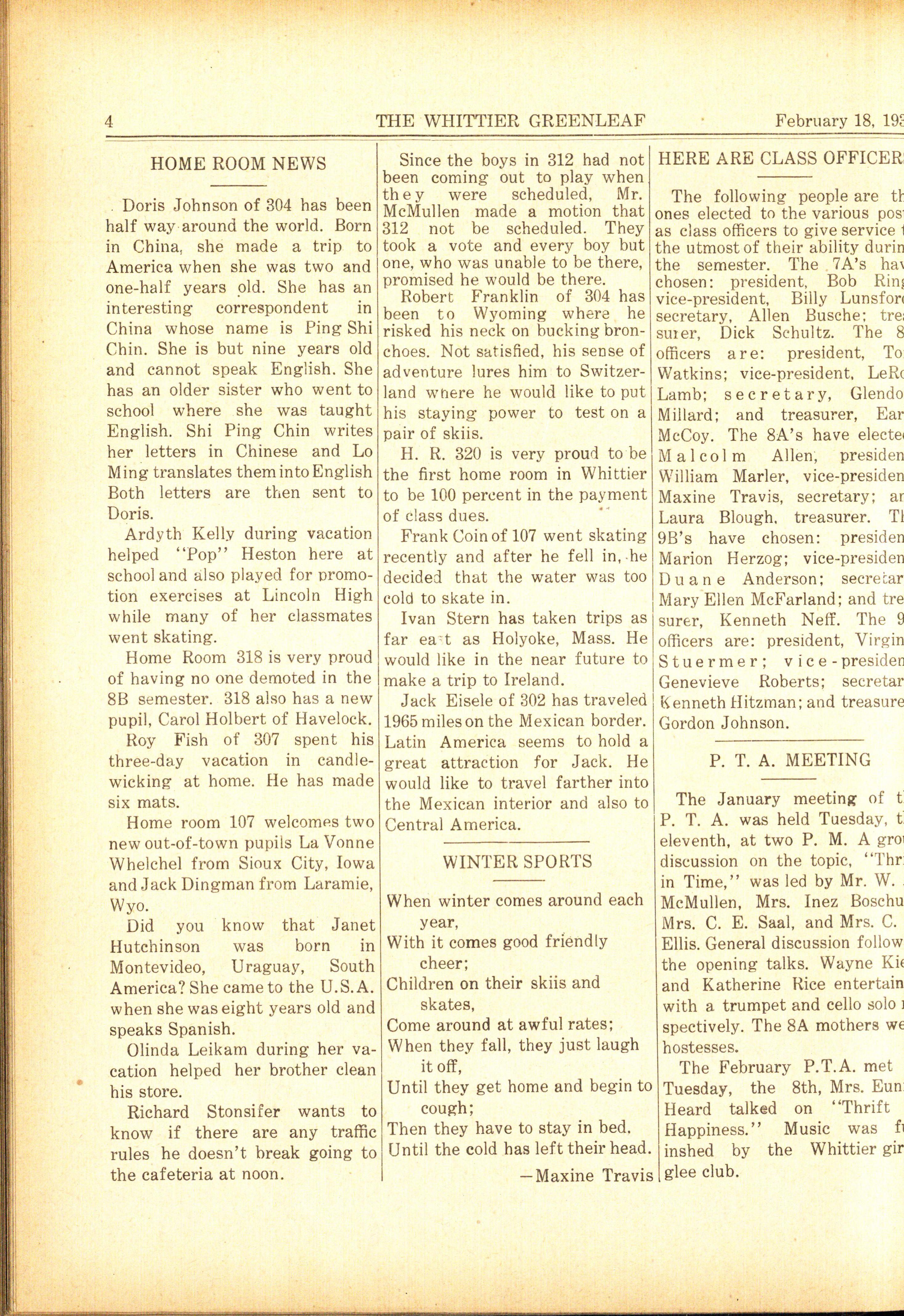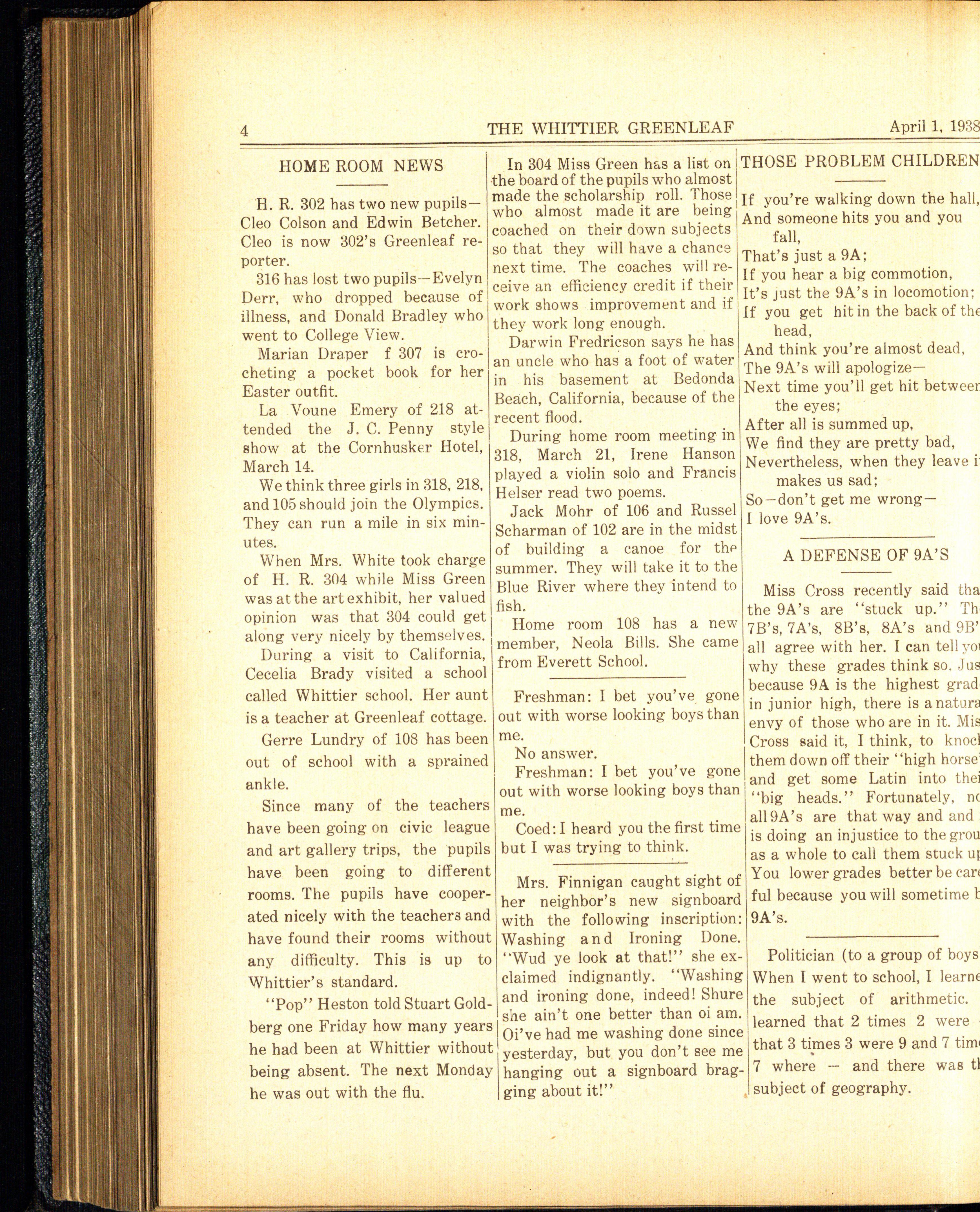 The 9A's final fling at Whittier will occur on class day which will be held January 20, 1938. 9A's graduation will be on Thursday, January 27, at the Lincoln high school. Some of the members of the Whittier orchestra will participate in the selected orchestra which will play at the graduation exercises. We sincerely hope the 9A's find much happiness in their new life
