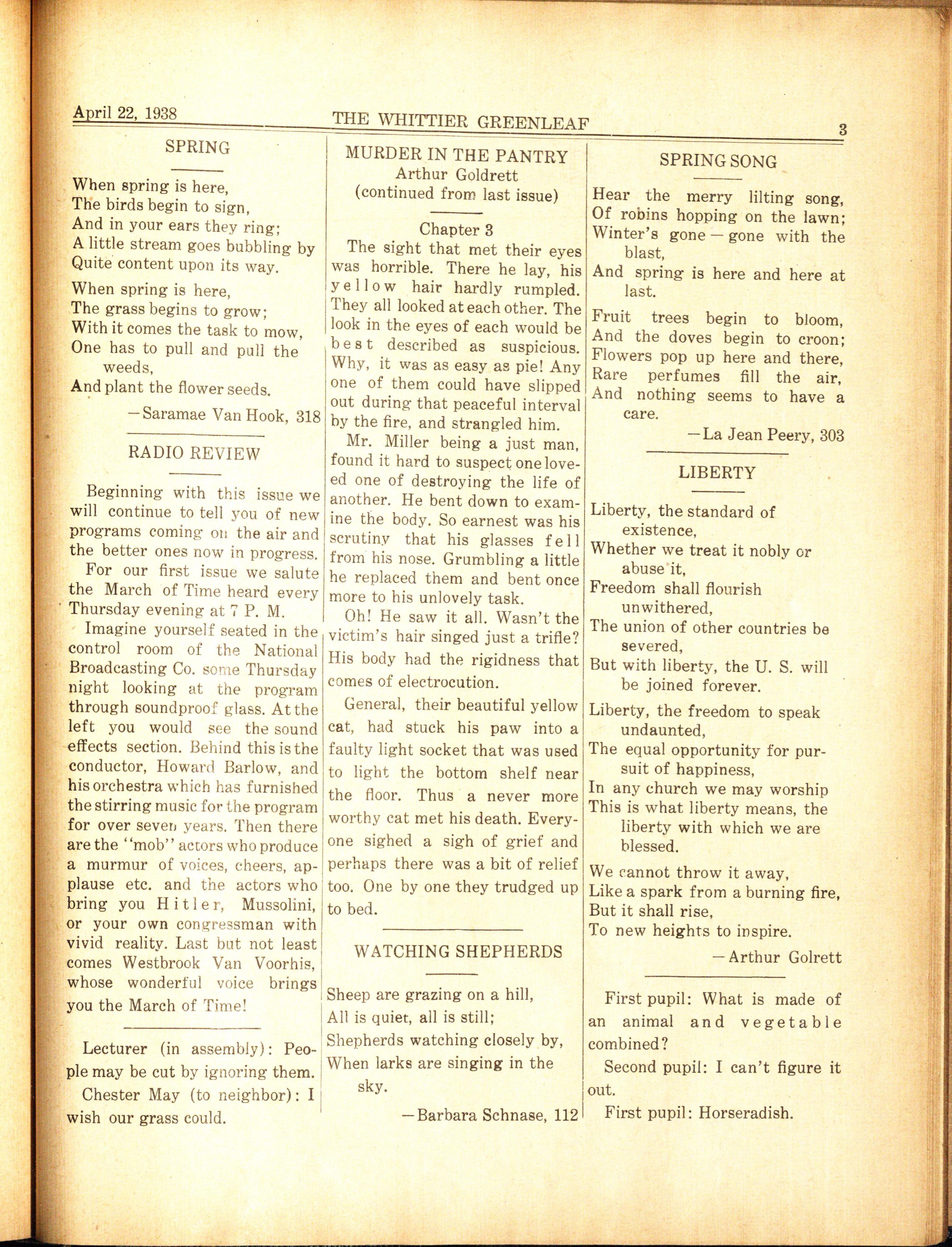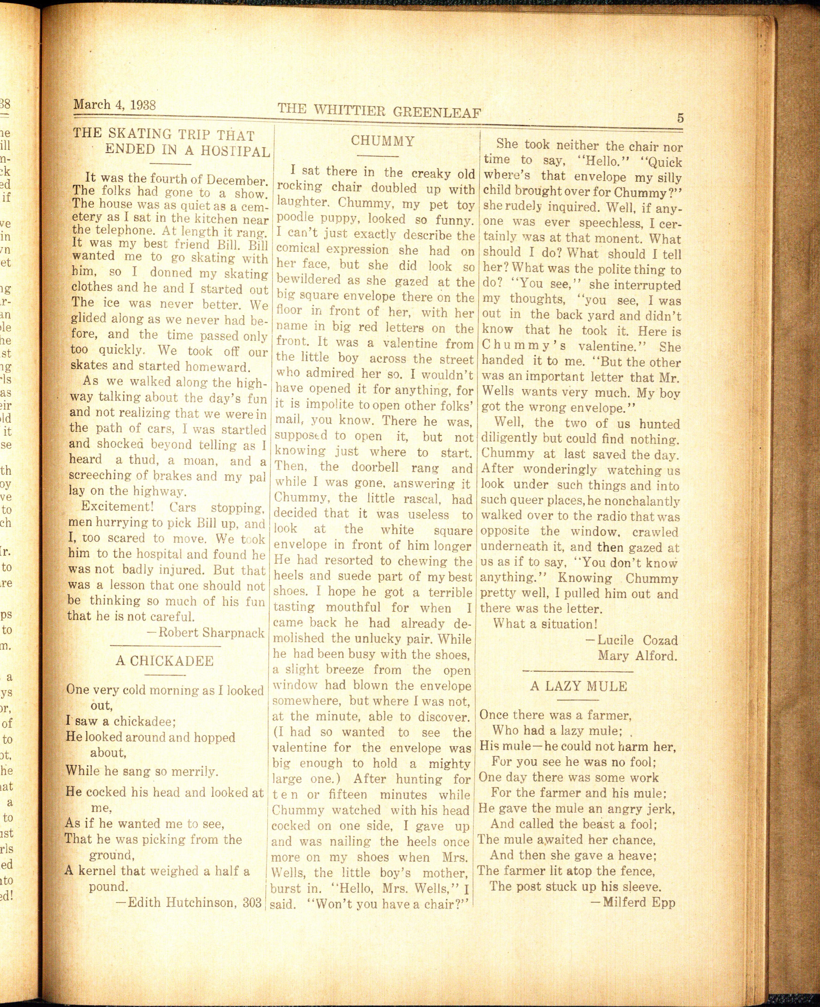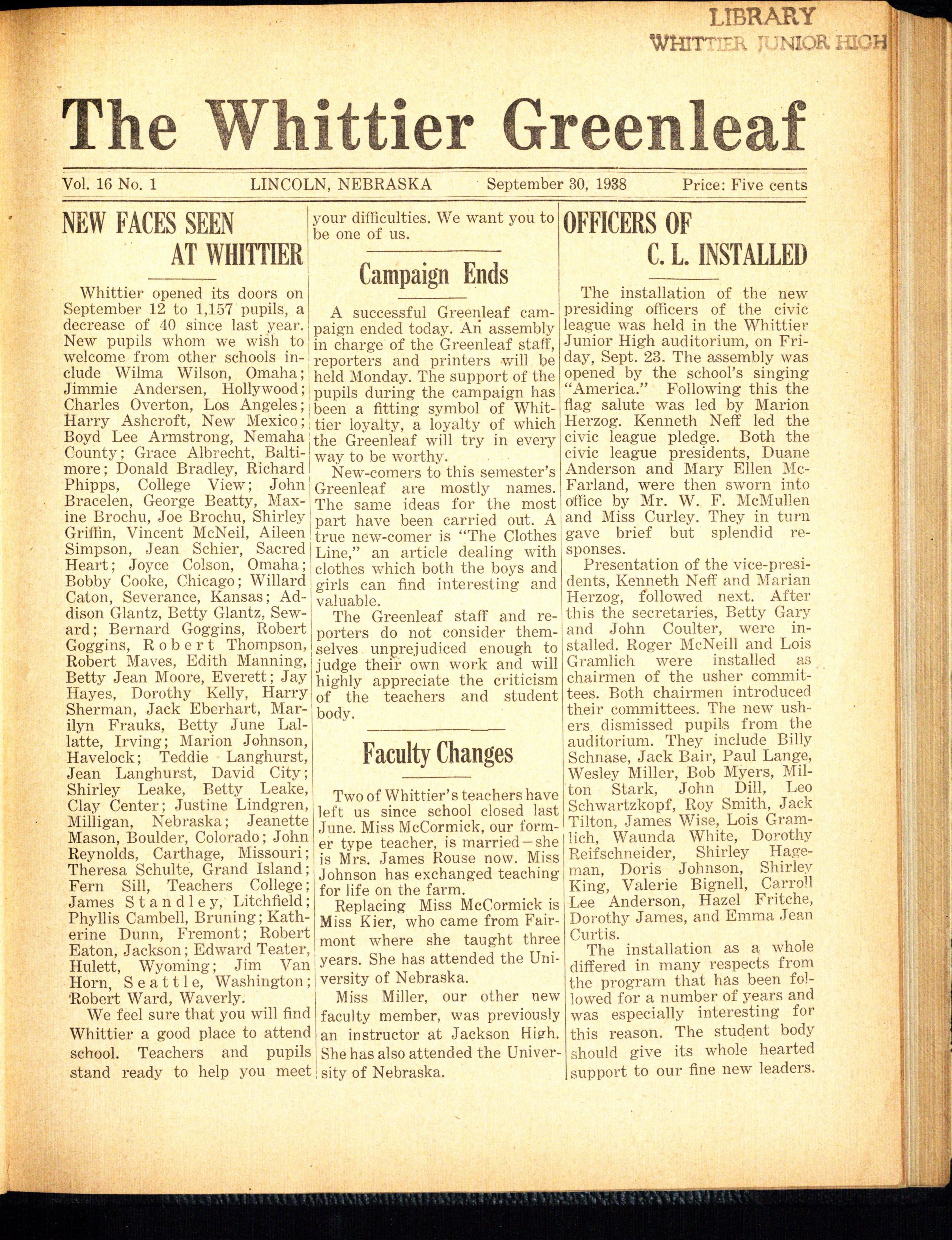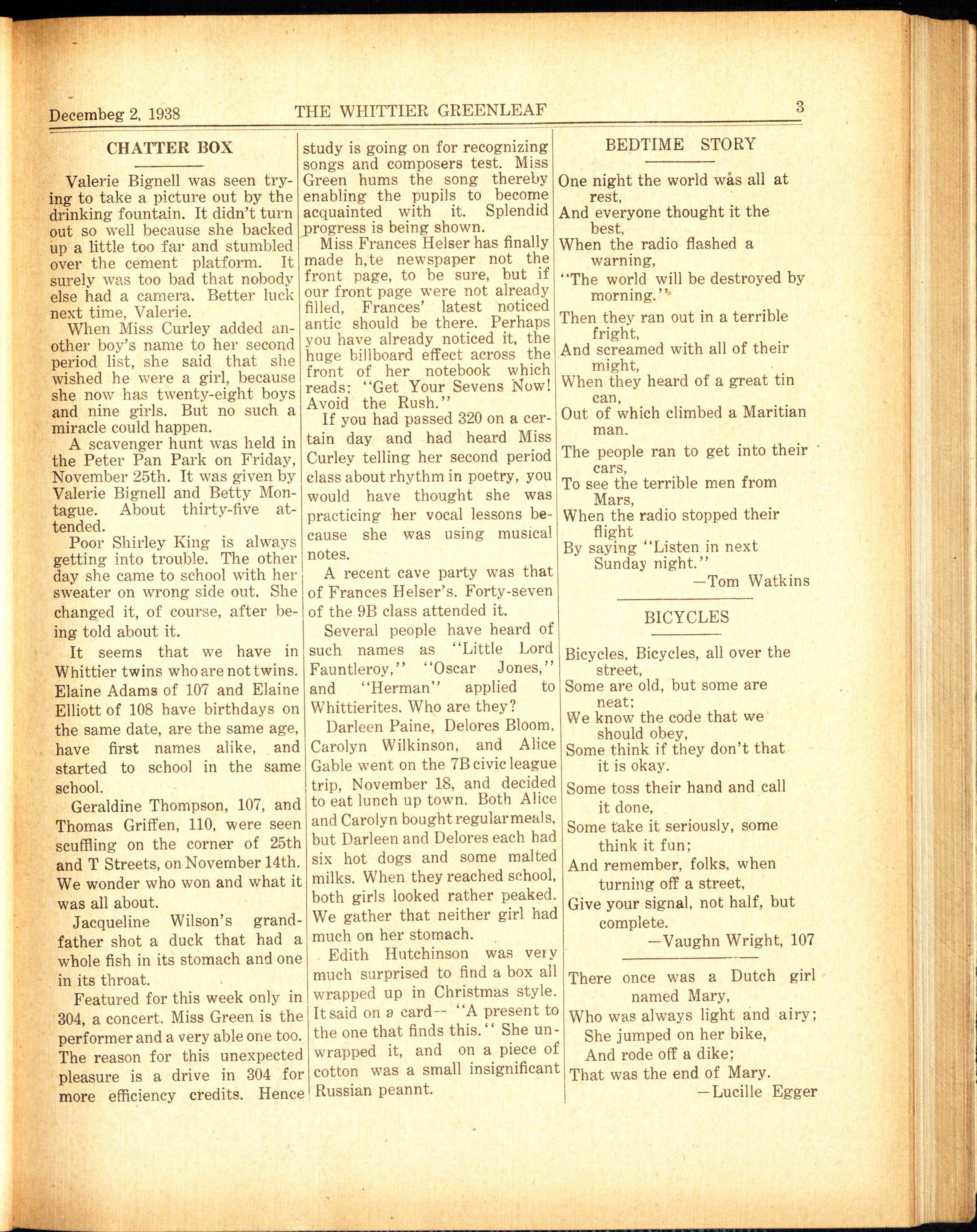 Founded and established in 1924 as the official student publication of Whitti e r Junior High School. Published bi-weekly during the school year by the Whittier Junior High School pupils.