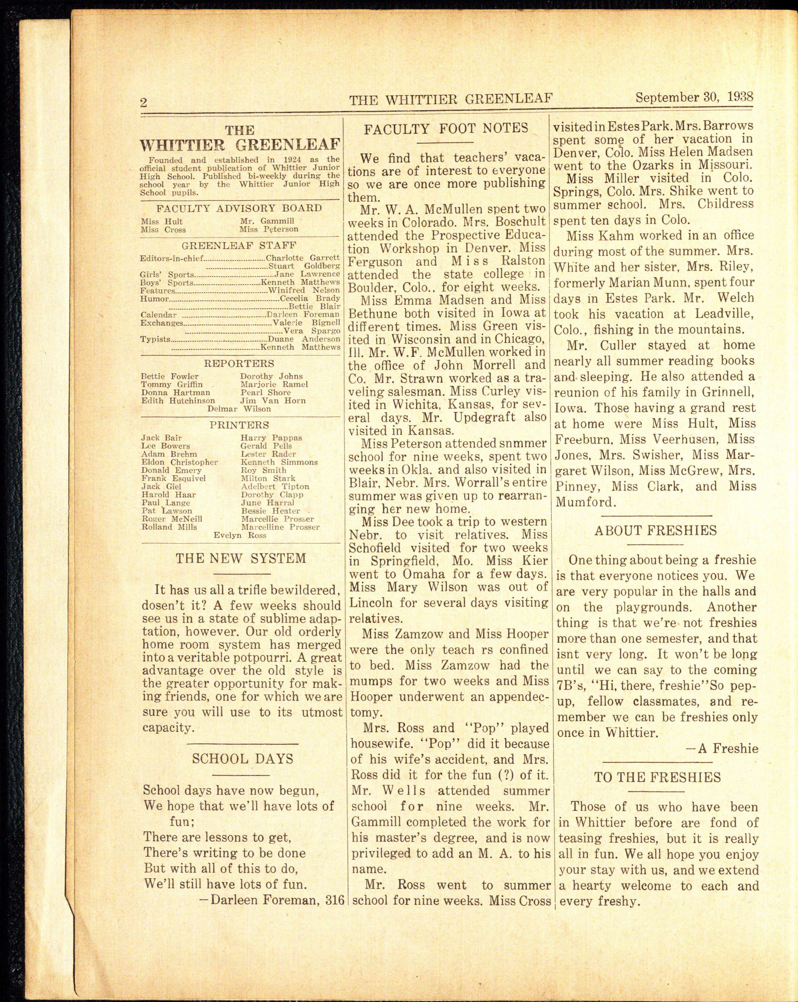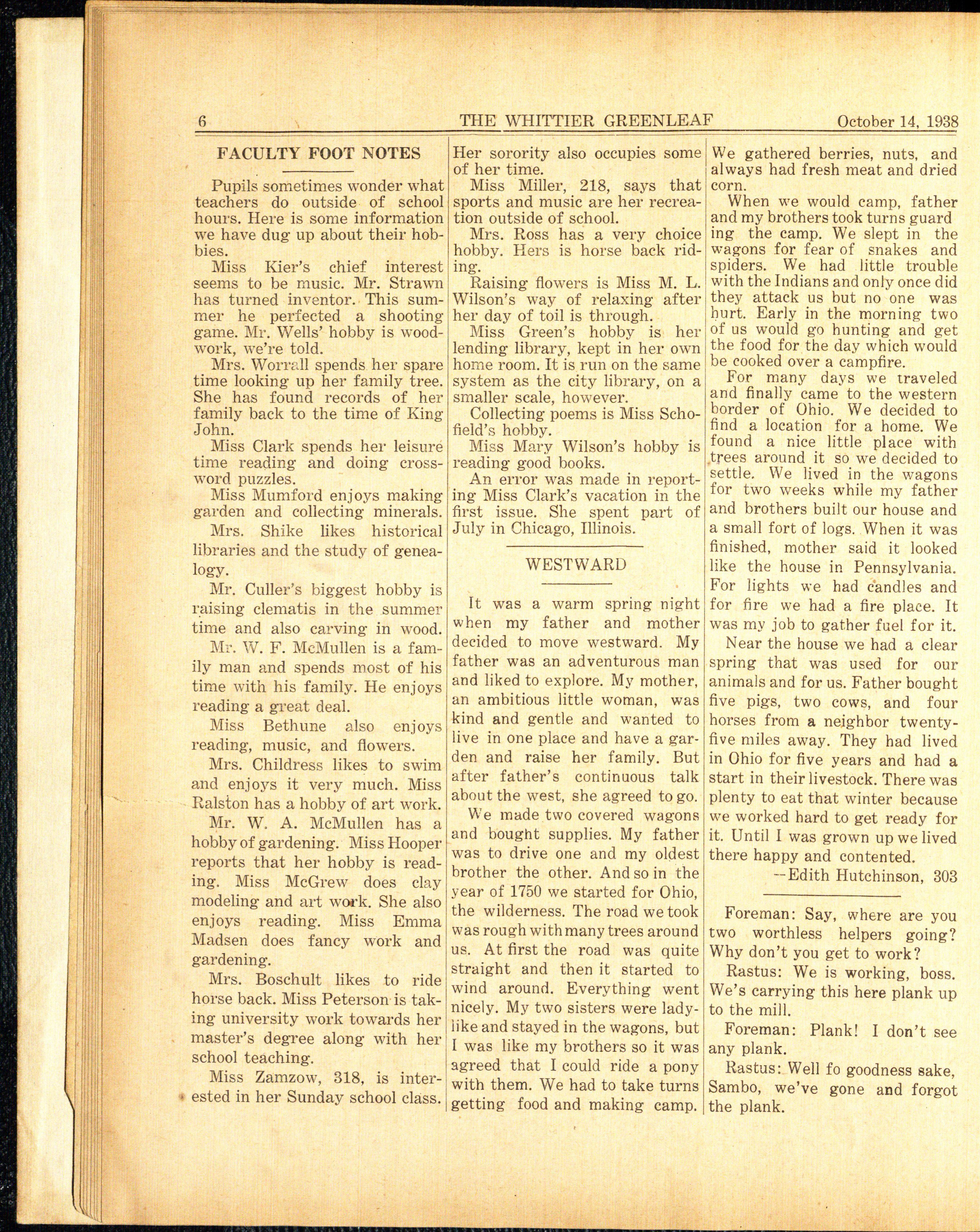 Whittier teachers going on the trip were Miss Hult, Mr. W. A. McMullen , Miss Zamzow, Mr. W. F. McMullen, Mr Updegraft, Miss Cross, Miss Curley, Miss Kier, Mrs. Barrows, and Miss Mumford.