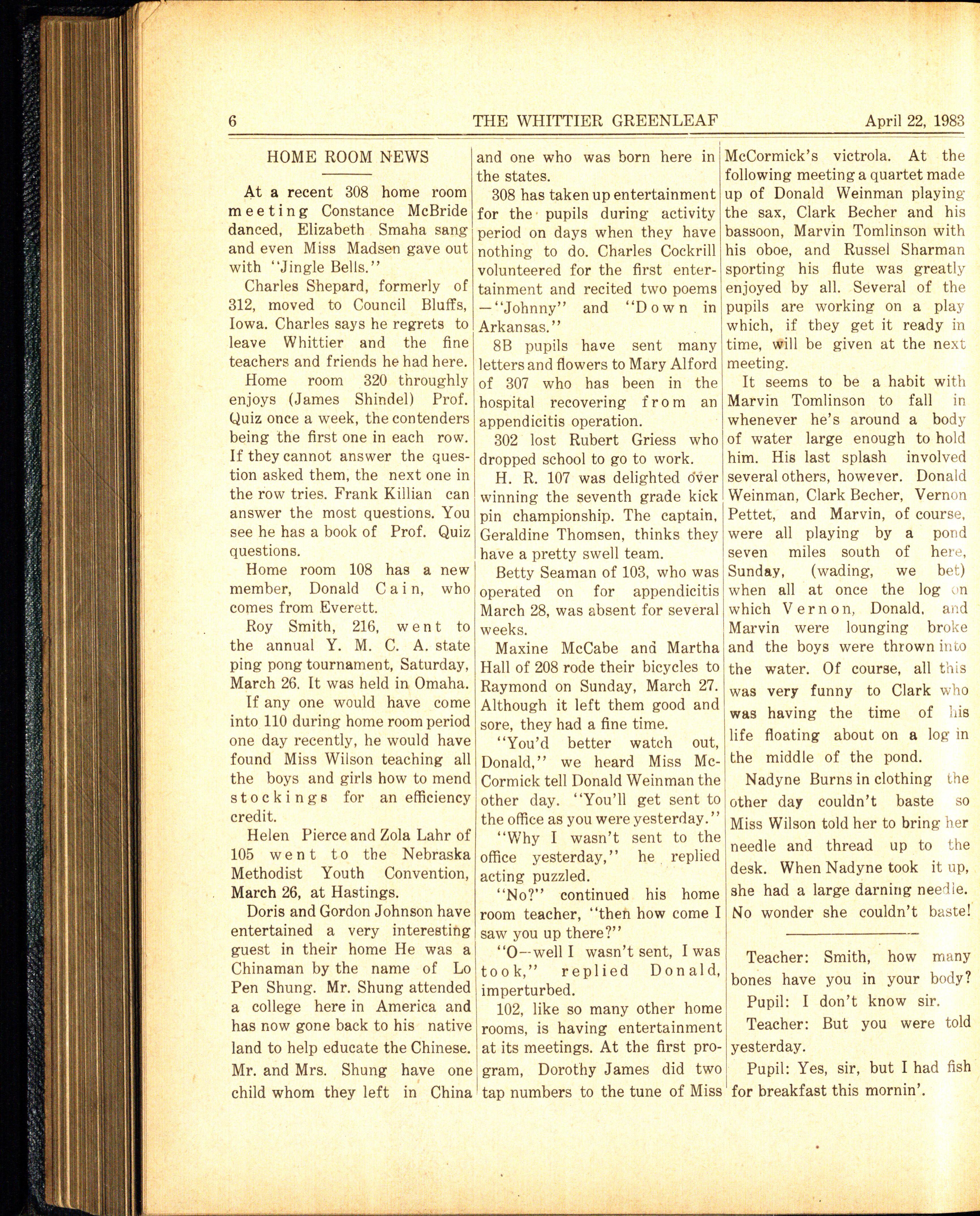 astonishing he had his grand- bright colored beads brighten up mother's, size thirteen, three any colored sweater and add Mar y Rumbolz of home room feet in length, and one foot in such a stylish look to your 110, was honored on her birthday diameter. He went to bed grin- clothes . with a hay-rack ride. Some of ning from ear to ear think- Initials are on ererything: Whittier 's girls were present·· ing of the good joke which he hats, sweaters, purses, pins, Lucille Egger, H elen Davenport, had played on old Saint Nick. clips, and now on anklets . You Elma Jean Dav enport, Betty But in the end this didn't turn can have them in any color you Ross, Do rot hy Winnegar, Betty out so well as you will soon wish according to the color of B 1air , Joan Eikenbary, and learn. your anklets.