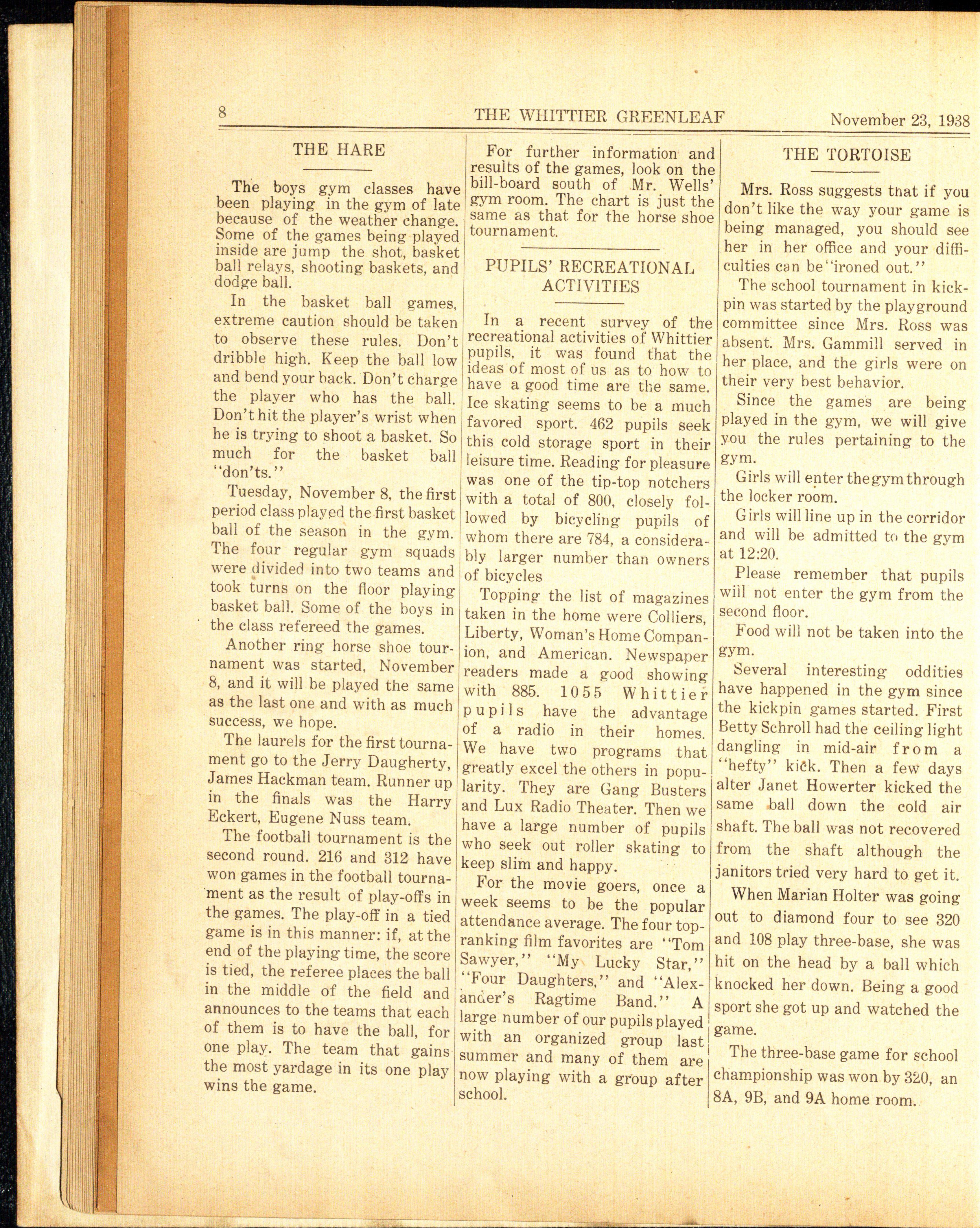 The basketball tournament will be a double elimination tournament. You may lose two games before you are out of the tournament. An all star basketball game will be played at the e n d of the year in which s ome of the be s t players will be chosen to -play. So far it looks as if these boy s a r e about "tops"Bob Rubino, Ed Neff, Kenneth Neff, Hoyt Yow ell, He r bert Meek, Rolly Allmond, Ed Schuckman, Harry Pappas, Bill Wa r ner, Leslie West, Ivan Stern, Henry Mew i 11 i a m s, Gene Kil'kendalL Walter Somerhi s e1·, and Don H01en.