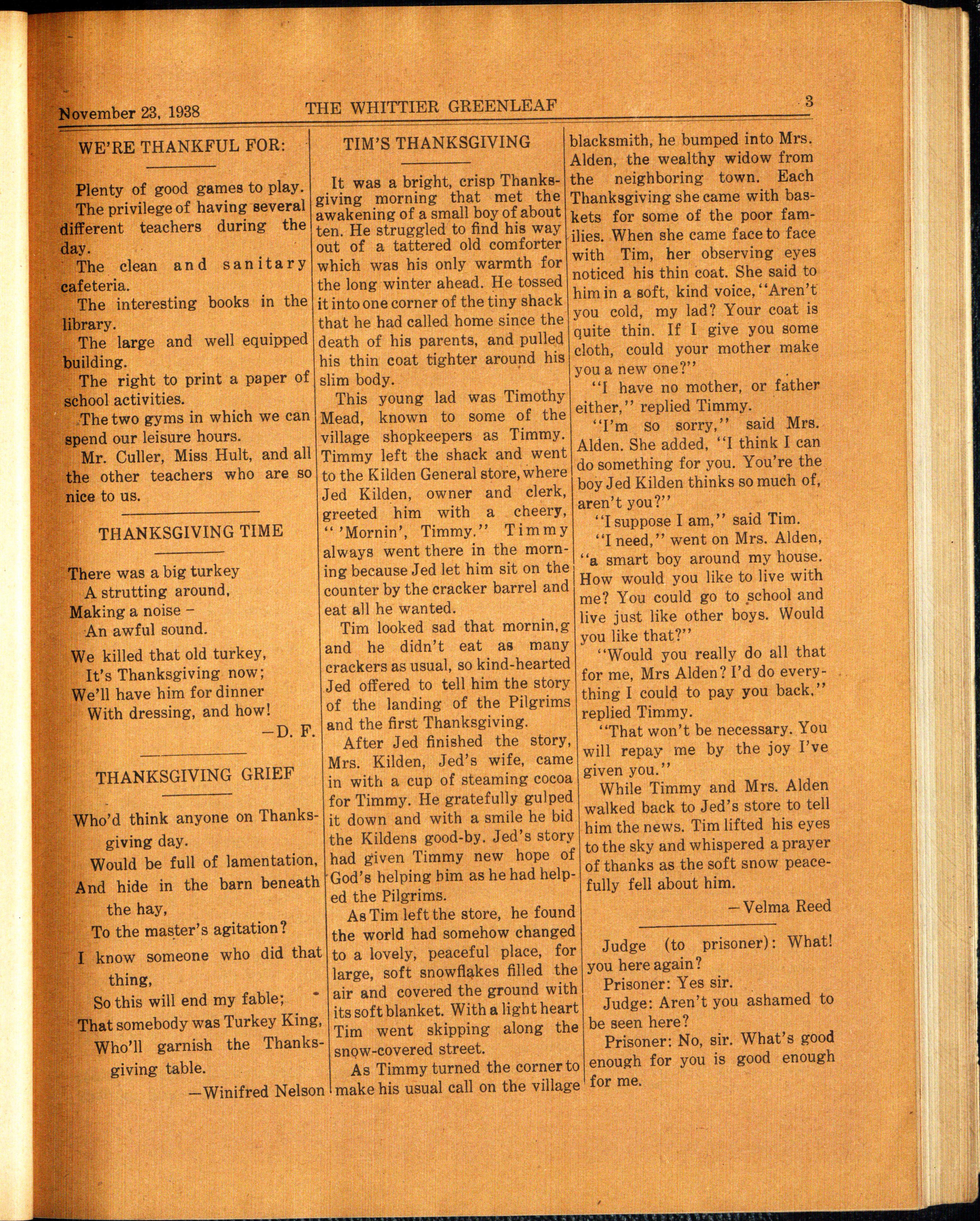 mastering himself listened to judge spoke. "The truth, crushed Mr. Pr ey's account of a most to earth, will conquer all." Everyunfo rtunate occurrence. It seems one looked approvingly at him that th is "Prey" bird had been as he led the dj,sagreeable Mr. gro wing a pair of choice pine oom. Pausing tre es that he had struggled with _._W\\A, ..,. ~ uttered in for seven years to entice them to low tones, ' ou a check gro w and just this year they had in the mo ..,....,.,,,;nlh• - m 1 I pulled sta rted to thrive. A neighbo r that very sttlit •myself when I had seen Archibald chop one i was a kid. You kno w, like father, down the previous night, "And ," I lik e s on." finis hed Mr. Prey, "I wouldn't 1 -Winifred Nelson, 320 have taken $10 for one of them."