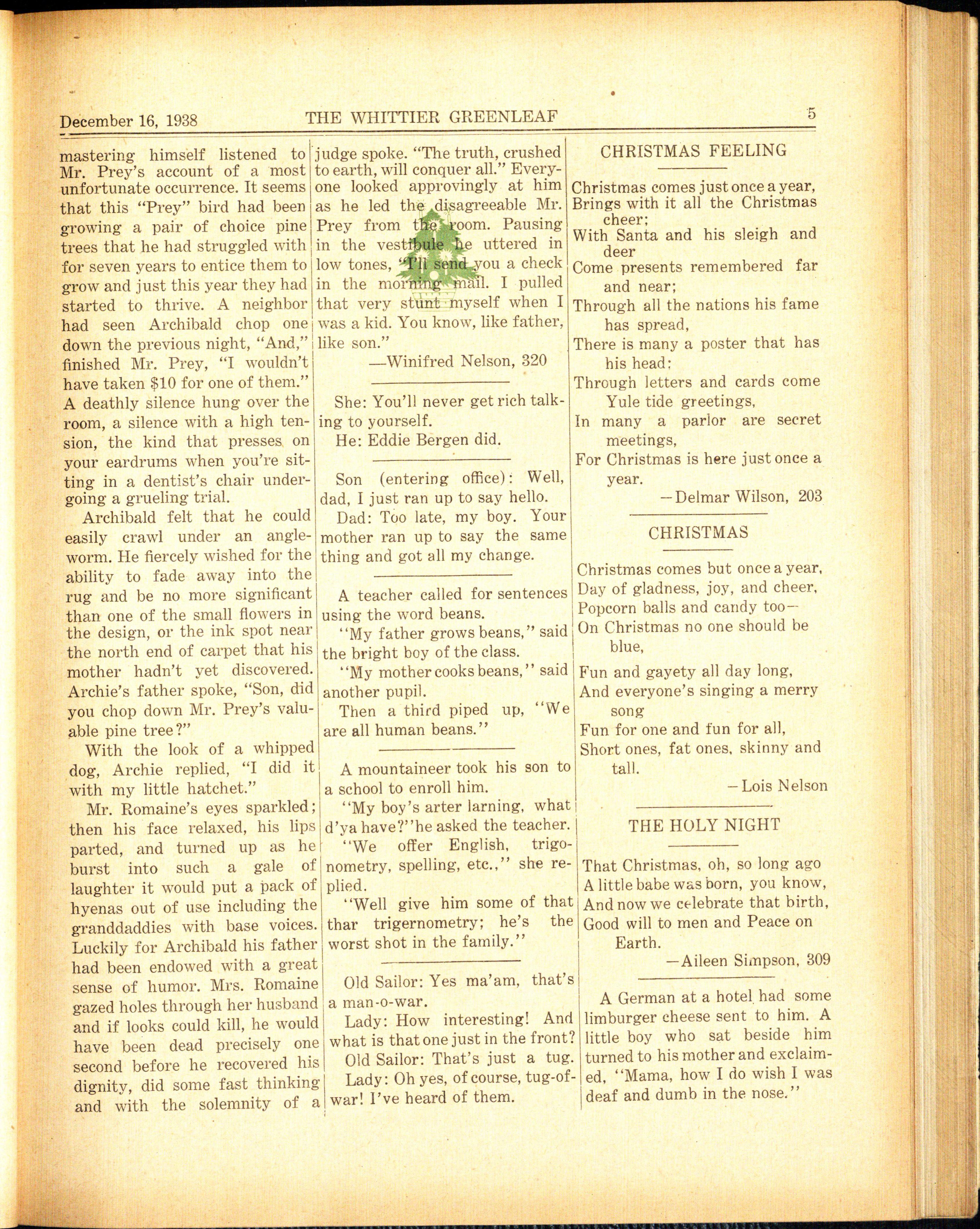 CHRIS TMAS CU TUP as the p i ne t ree crumb led t o the g r ound. Clutching the illegally (B ased on an ActuaJ Happe n ing ) gotten tree under his arm, ArchAr chibald ' ulged They ! ibald rushed from the scene. were sh i n" • ight sim- Arriving within the protec tilar to a t , ickering ing sanctum of his back yard he candles. ' ore him pushed the tree roughly into the was a fa ng a fab_ wood s hed for the night. The folulous fo r tt form of lo wing day he produced it, givth r ee silver do ars. As Archi- ing unintelligible, gutteral ansb a ld pounced upon it, his father, wers in reply to inqui r ies as to the own e r of the fat palm, ex- where he had p r ocu r ed it. Decopl a ined to him th a t he w a s t o r a tion of it was soon launched. buy a Christ m as t r ee with it. Then the inev i table occurred. F e el i ng a mite proud of such a The family had j ust completed huge responsibility, Archibald the evening meal a n d were sitdeparted with the speed of Sea ting around the open fireplace Biscu i t. The idea of b uy i ng a feeling fatly con t en t ed when t ree was r idiculous to Archibald there came a shar p r ap on the when trees flou r i s hed so vigor- po r t a l of their v ene r able edifice. o usly in hi s own home town, free Si s ter Ginn y , w ho always be a t for the cho pp ing. eve ry on e el s e to the door, adThat v e y night when smoky mit te d a man of gnarled build s hado w s lay thick on frozen I a nd shift y g a ze who had the e xmot her ear th he ventured forth I p r es s ion of a hawk ready to on his mi s s ion, axe slung o v e r I pounce on an unsu s pecting vieone shoulde r He intended to tim weaker tha n him s elf. If you chop one down in Merrit's Ra - stared at him fo r an y leng t h of v ine where no one particul ar l y tim e , you got the uneasy feeling ca re d. His path led him by a neat that he was not a man at all. little white hou s e w ith t w o lo ve- Archibald's family blinked their l y pine trees st a nding unifo r mly eyes a s if to r e lie v e them of a in front of it. A r chibald half w a y be w itched veil or sh r oud as the p a used, then slowl y , unwillingl y , v i sit or announced himself. "I ambled pa s t; b µt the mental pi e- a m Jo s ep h Prey, occupant of the t ure of the p i ne tr e e s refused to white house do wn the road. You be dismis s ed fr om his m ind. On a re Mr. Romaine, I be lieve?" he an impulse he turned and t aced in q uired as he add r essed Archiback to the small hou s e, sw ung b ald's father. his axe to the ground, and "You' r e quite right, glad to chopped away at the base of a know you, Mr Prey " The latter t r ee. As he progressed, his l a b- w a s said entirely for social puror ed strokes came fa s ter and po s es.