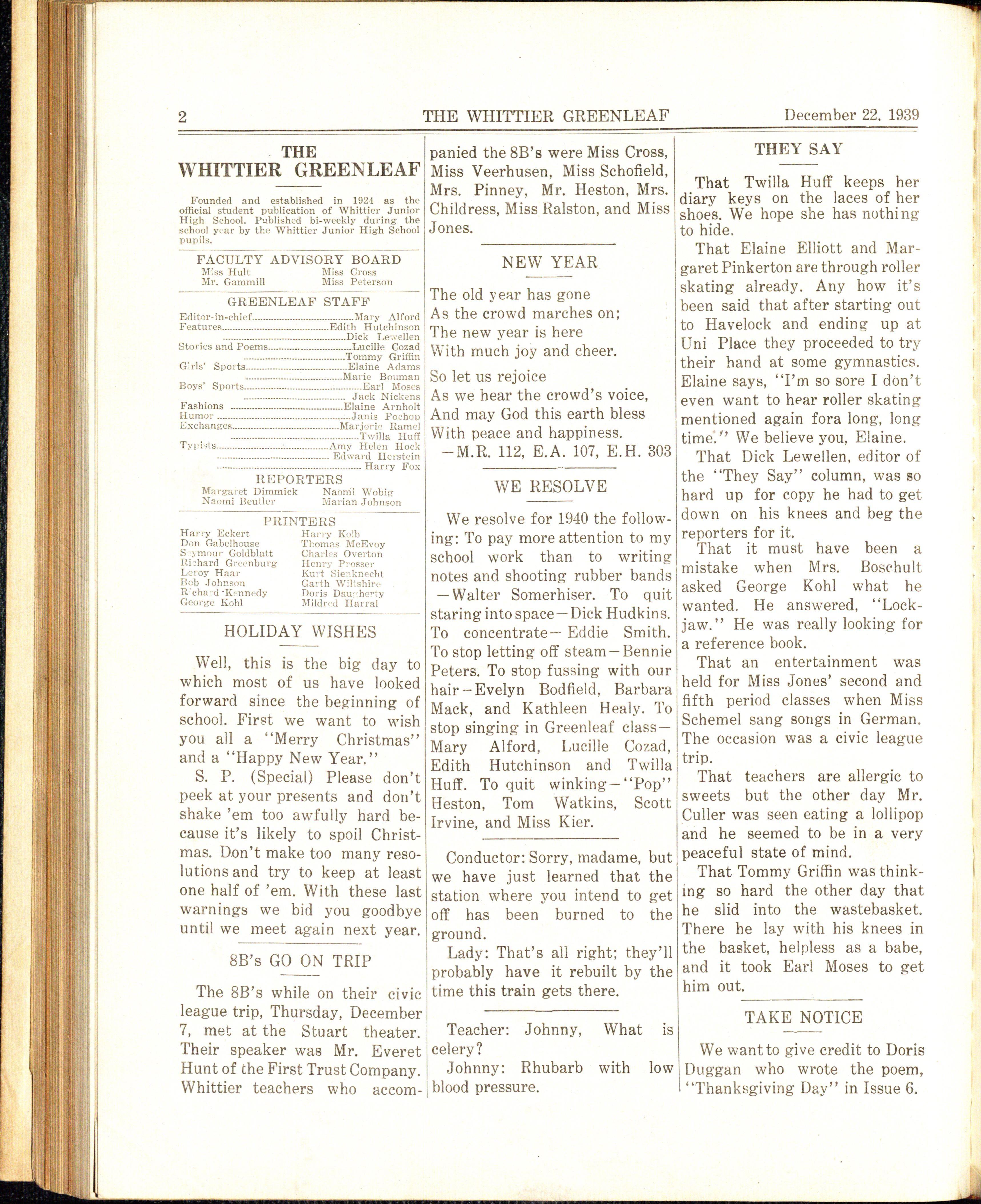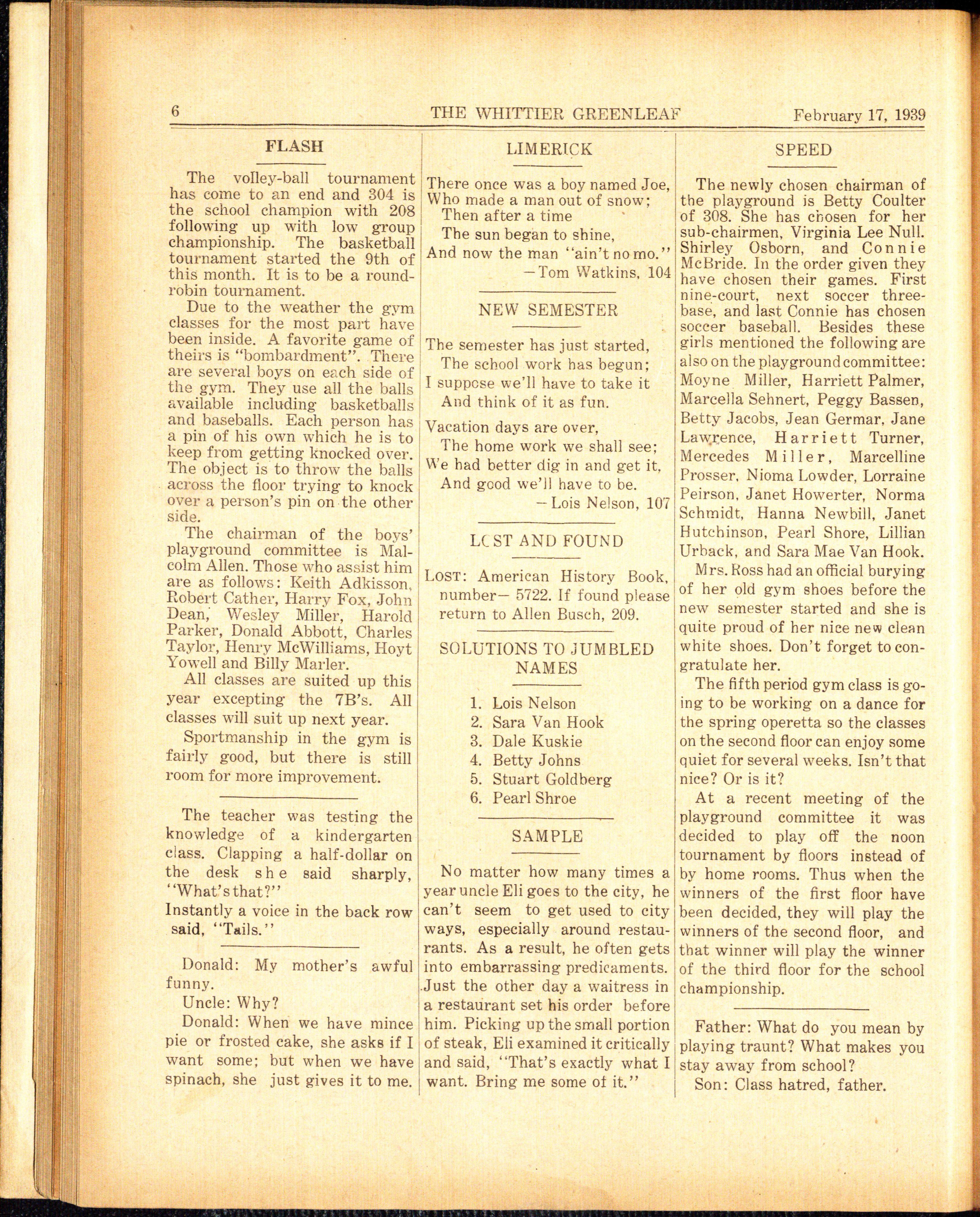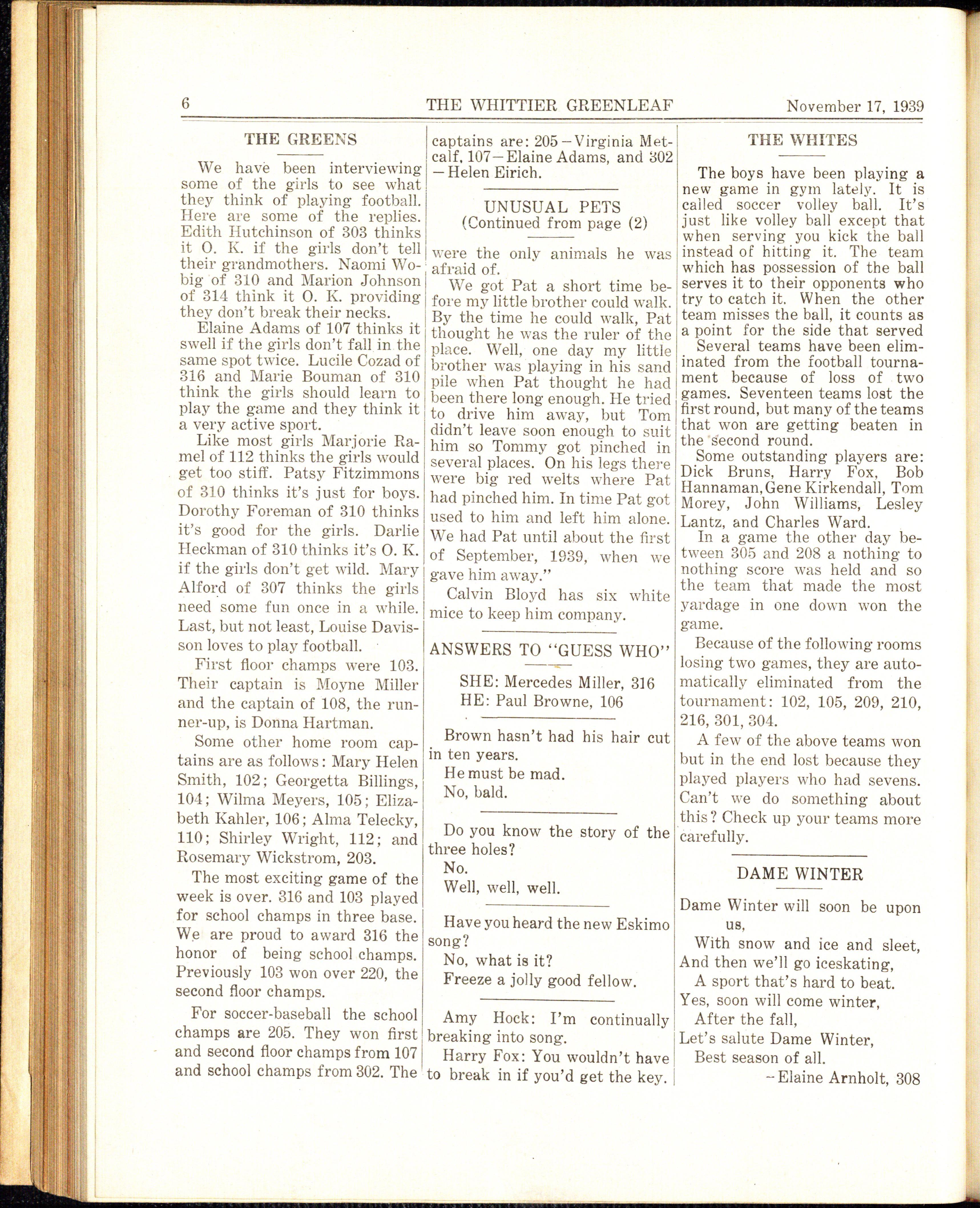 An assembly was held Friday, musical program put on by Mr. Much outside attention was Jan uary 6, for the purpose of I Welch's band and members of directed to Whittier's game fami liarizing pupils with the Miss Holcomb's violin class was rooms January fifth. Mr. Jones ndid at s for civic league of- thoroughly e~joyed by both fac- the he?'d of Lancaster county ca e ulty and pupils. The band under recreat10n and five other men fice s. It was opened by the as- the direction of Mr. Welch lead who have charge of the recreasem bly singing "Ame rica," under off the program with four num- tional centers in Lancaster the direction of Mrs. White. This bers entitled, "The Opener County made a tour of our game was followed by the flag sa lute ~arch," "The B~nquet Waltz," rooms. . l d b K neth Neff and the Church •Echoes, and a march There are many mterestmg . Y en . with the Drums and Cymbals. games for the pupils of Whitc1v1c league pledge led by Marian Miss Holcomb then took over tier to play. The boys seem to Herz og. Mary Ellen McFarland with four pupils from her violin prefer the game of pool while state d the purpose of the meet- II class, Ellen Dietze, Bettyrose the girls choose fiddle sticks, a ing and Mary Alford rendered a Jurgens, Ralph Kuwamoto and game that tests how steady your • 1 Th d"d t John McCorckle. Their perform- hand is. Crokinole is fun but ~ia no so o. e can 1 ~s were ance consisted of six short num- rather hard on fingers. The game mt roduced by the re~irmg ?f- bers including such composers is to snap a wooden shooter at ficer s. Secretary nommees, m- as, Bach and Mozart, also a some rings and get them into a traduc ed by Betty Gary and Hungarian Folk Song and a net hole. A game that everyone John Coulter were Peggy Hud- French Choral. plays is chinese checkers. The El 'H d B'll M l ------- time passe s too quickly when one son, eanor u_r , 1. ar e_r CANDIDATES ATTEND is playing click ball. Many Whitand Robert Rubmo. Vice pres1- EFFICIENCY MEET,ING tier people play this new game. dent nominees, introduced by These are but a few of the grand Marian Herzog and Kenneth Thursday, January 4, 9A's games in Whittier's game rooms. who have worked industriously I Mr. Culler and Mr. Strawn Neff, were Winifred Nelson, and efficiently attended an ef- have added new games to our Joyce Crosby, Wesley Miller and ficiency ~e~ting. held i~ the collection. Mr. Culler's game is Bl.11 Schlaebitz. Finally, Mary south admm1strat10n bt~1ldmg of Pile 'em High and Mr. Strawn's the Board of Educat10n. The . . Ellen McFarland and Duane speakers were such notables as is _Bo~o. Upon mterviewm~ Don Ande rsen introduced candidates Miss Town who opened the W1ggms and Tom Watkms of fo r the presidency , who were Carroll Lea Anderson, Marian Coomb s, John Blumer and Malcolm Allen. Each candidate remeeting with a few well chosen 104 both boys remarked that w?rds and then ~ntroduced l\'.(r. these games "are swell!"