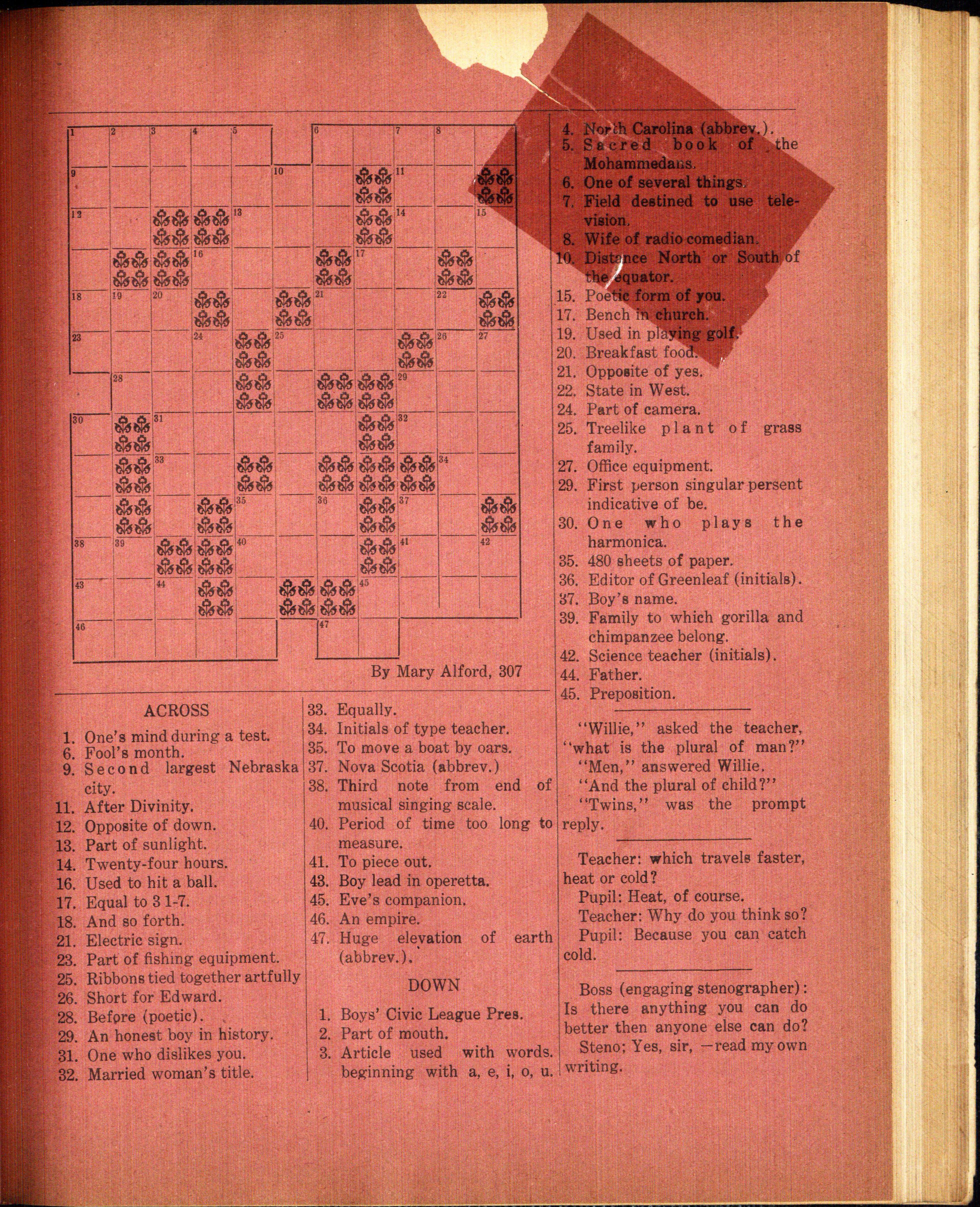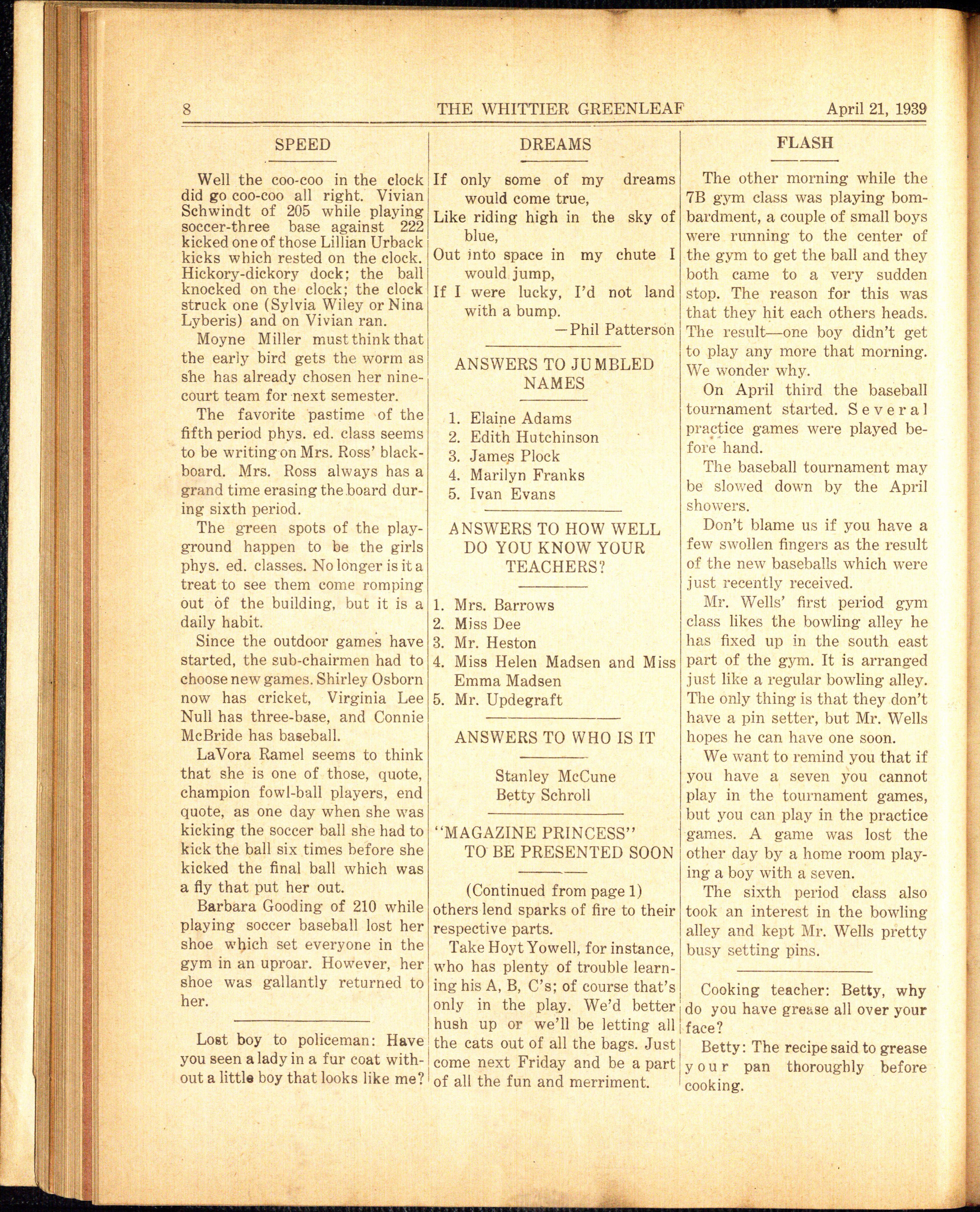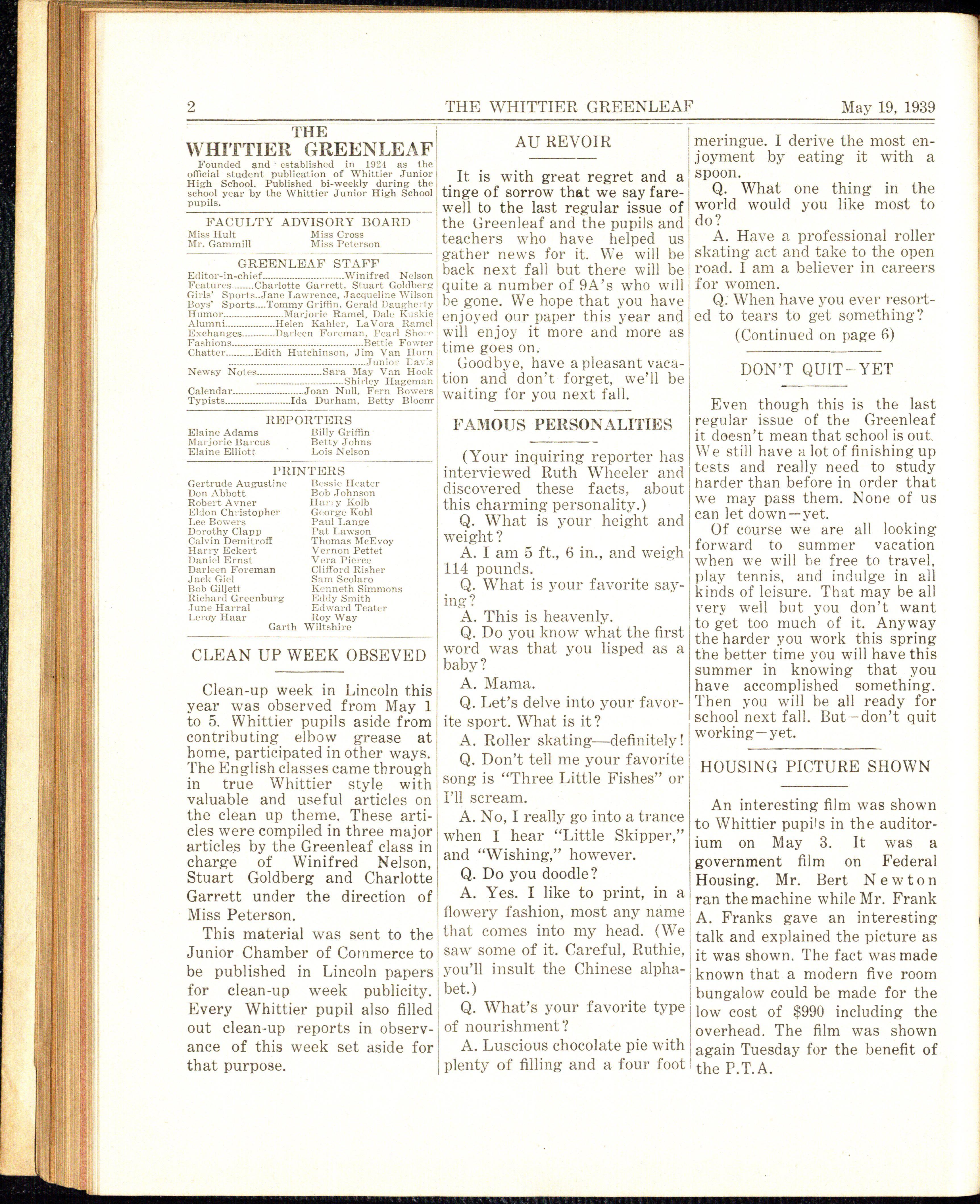 An assembly was held Friday, musical program put on by Mr. Much outside attention was Jan uary 6, for the purpose of I Welch's band and members of directed to Whittier's game fami liarizing pupils with the Miss Holcomb's violin class was rooms January fifth. Mr. Jones ndid at s for civic league of- thoroughly e~joyed by both fac- the he?'d of Lancaster county ca e ulty and pupils. The band under recreat10n and five other men fice s. It was opened by the as- the direction of Mr. Welch lead who have charge of the recreasem bly singing "Ame rica," under off the program with four num- tional centers in Lancaster the direction of Mrs. White. This bers entitled, "The Opener County made a tour of our game was followed by the flag sa lute ~arch," "The B~nquet Waltz," rooms. . l d b K neth Neff and the Church •Echoes, and a march There are many mterestmg . Y en . with the Drums and Cymbals. games for the pupils of Whitc1v1c league pledge led by Marian Miss Holcomb then took over tier to play. The boys seem to Herz og. Mary Ellen McFarland with four pupils from her violin prefer the game of pool while state d the purpose of the meet- II class, Ellen Dietze, Bettyrose the girls choose fiddle sticks, a ing and Mary Alford rendered a Jurgens, Ralph Kuwamoto and game that tests how steady your • 1 Th d"d t John McCorckle. Their perform- hand is. Crokinole is fun but ~ia no so o. e can 1 ~s were ance consisted of six short num- rather hard on fingers. The game mt roduced by the re~irmg ?f- bers including such composers is to snap a wooden shooter at ficer s. Secretary nommees, m- as, Bach and Mozart, also a some rings and get them into a traduc ed by Betty Gary and Hungarian Folk Song and a net hole. A game that everyone John Coulter were Peggy Hud- French Choral. plays is chinese checkers. The El 'H d B'll M l ------- time passe s too quickly when one son, eanor u_r , 1. ar e_r CANDIDATES ATTEND is playing click ball. Many Whitand Robert Rubmo. Vice pres1- EFFICIENCY MEET,ING tier people play this new game. dent nominees, introduced by These are but a few of the grand Marian Herzog and Kenneth Thursday, January 4, 9A's games in Whittier's game rooms. who have worked industriously I Mr. Culler and Mr. Strawn Neff, were Winifred Nelson, and efficiently attended an ef- have added new games to our Joyce Crosby, Wesley Miller and ficiency ~e~ting. held i~ the collection. Mr. Culler's game is Bl.11 Schlaebitz. Finally, Mary south admm1strat10n bt~1ldmg of Pile 'em High and Mr. Strawn's the Board of Educat10n. The . . Ellen McFarland and Duane speakers were such notables as is _Bo~o. Upon mterviewm~ Don Ande rsen introduced candidates Miss Town who opened the W1ggms and Tom Watkms of fo r the presidency , who were Carroll Lea Anderson, Marian Coomb s, John Blumer and Malcolm Allen. Each candidate remeeting with a few well chosen 104 both boys remarked that w?rds and then ~ntroduced l\'.(r. these games "are swell!"