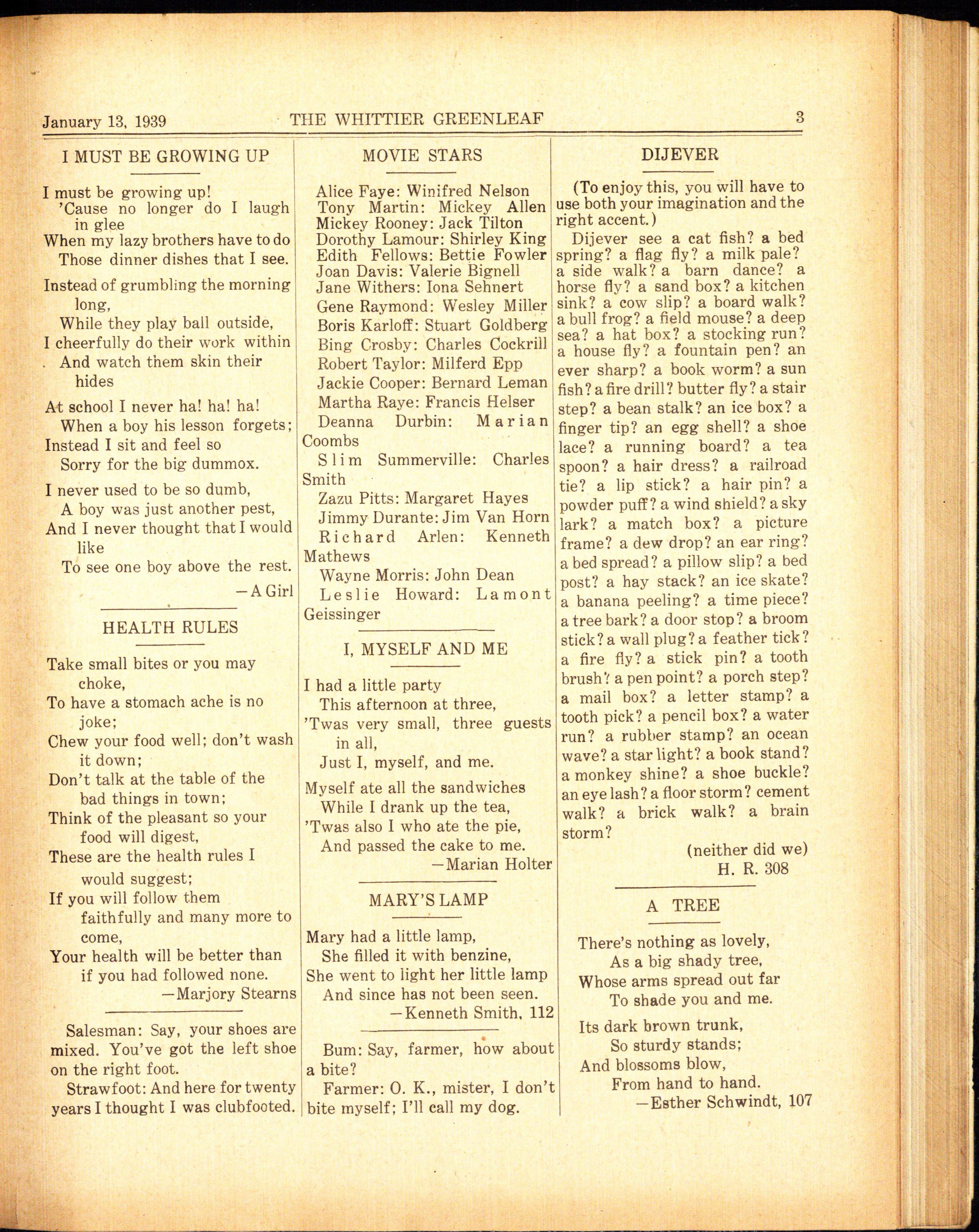 Please excuse the printers , Mrs. Shike, for the misspelling of your name in the last issue of the Greenleaf. It was all due to somebody's dropping the type. I love to wait for Chrjstmas, To see a Christmas tree, To know what Christmas means to you
