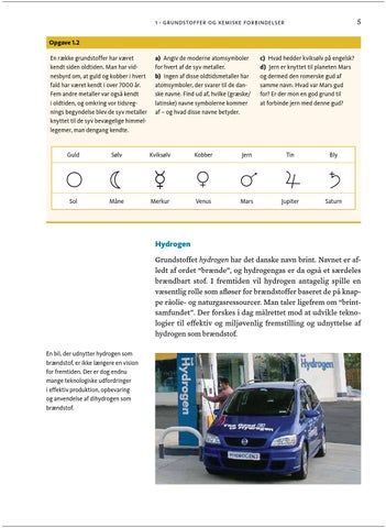 1 · grundstoffer og kemiske forbindelser Opgave 1.2 En række grundstoffer har været kendt siden oldtiden. Man har vidnesbyrd om, at guld og kobber i hvert fald har været kendt i over 7000 år. Fem andre metaller var også kendt i oldtiden, og omkring vor tidsregnings begyndelse blev de syv metaller knyttet til de syv bevægelige himmellegemer, man dengang kendte.