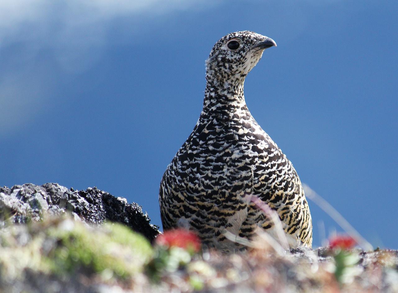 Ptarmigans are hardy members of the grouse family that spend most of their lives on the ground at or above treeline. During the winter when it is snowy, these birds are white; during the summer when the snow has melted, they are brown or tan. Construction of the nest, incubation of the eggs, and rearing of the young are activities performed exclusively by the female. Nests (right) are sparsely lined with grasses, lichens, leaves, and feathers.