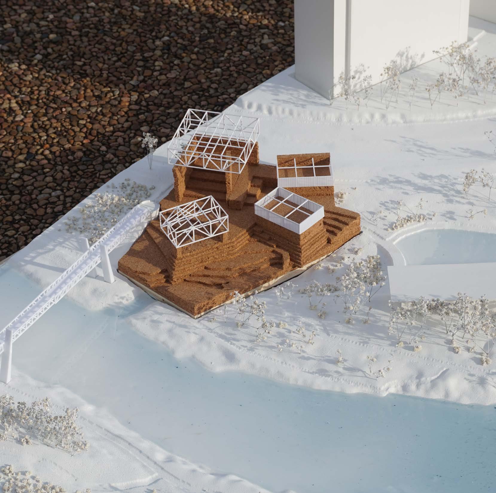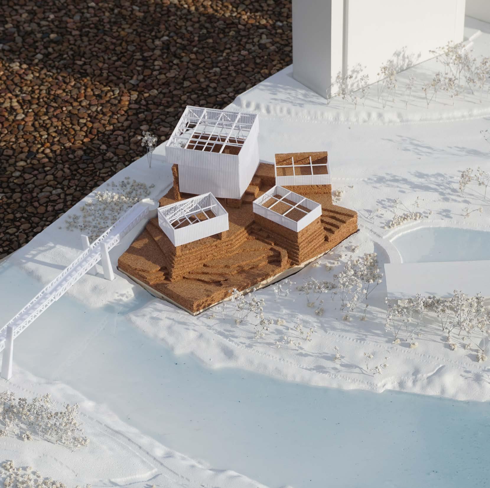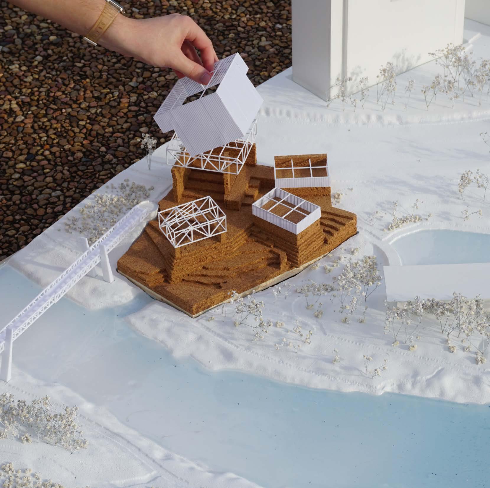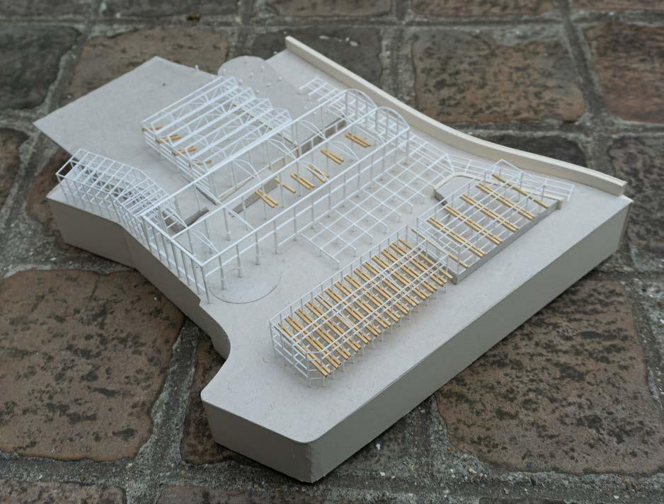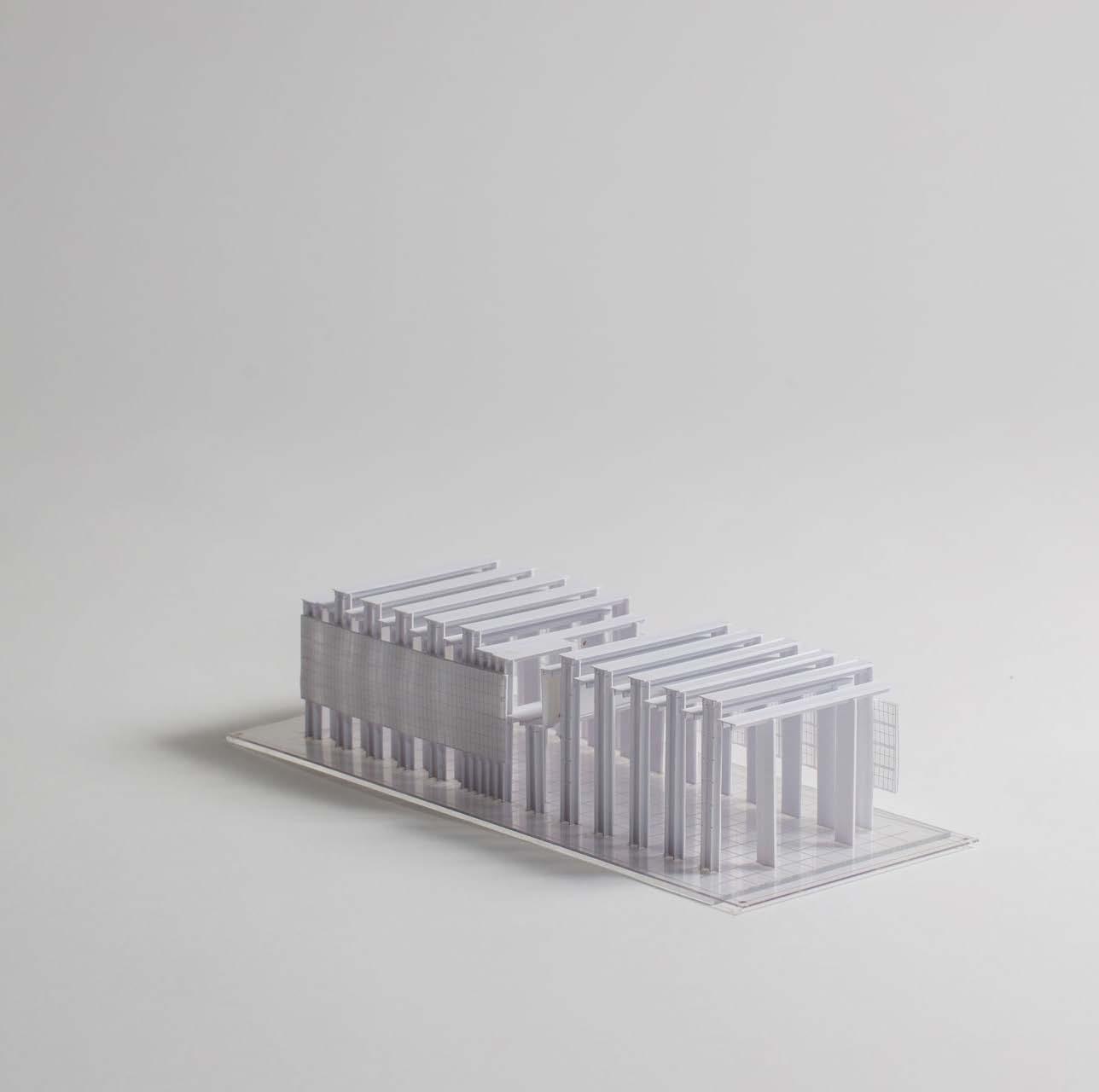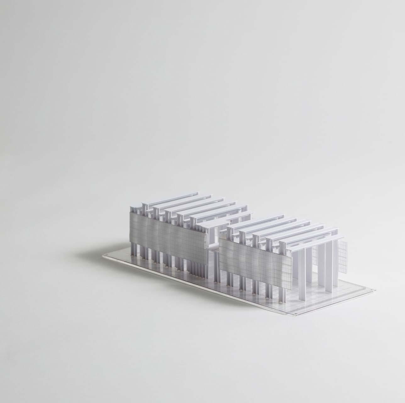 The model clearly delineates the ground and building conditions, accepting some of the occupiable space as part of the ground. Both the ground and the walls are read as the same material, while the steel structure that sits upon those walls is a light skeleton, resting on top. The building is then lightly clad, providing further contrast in these two building tectonics.