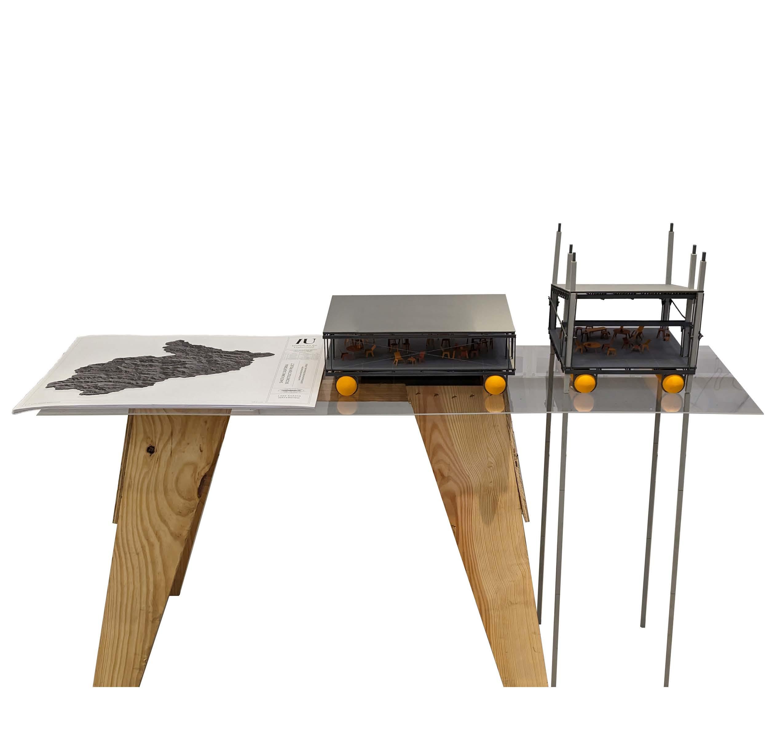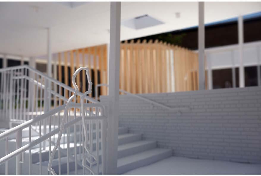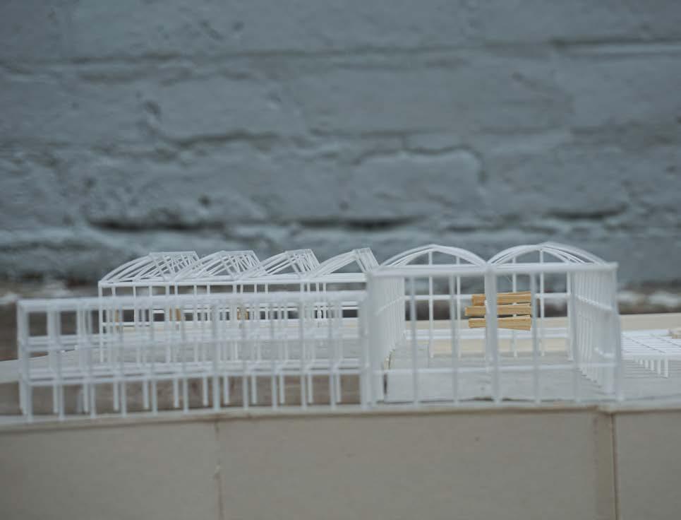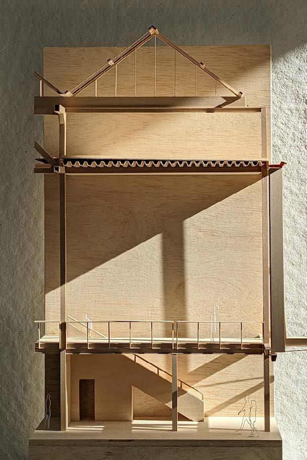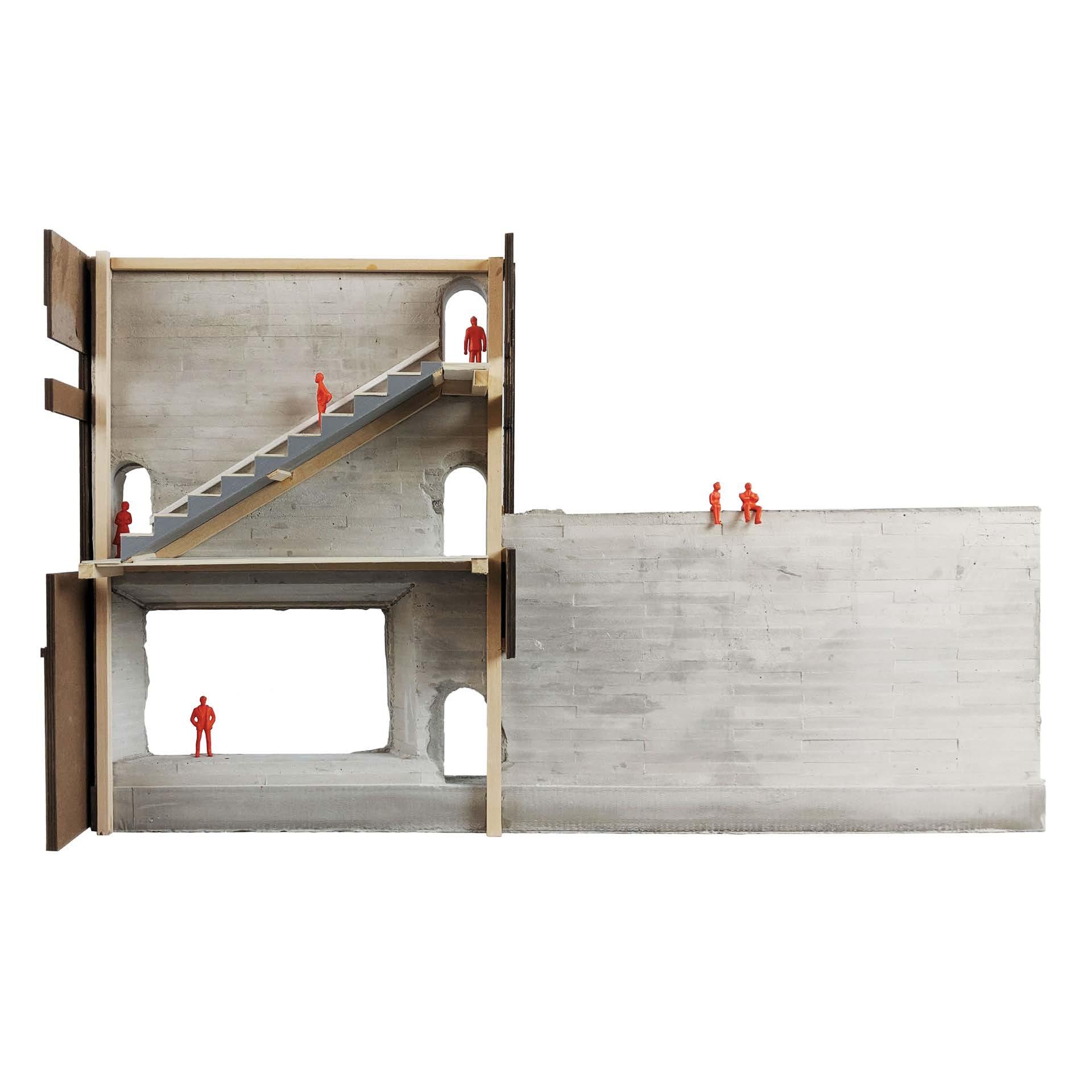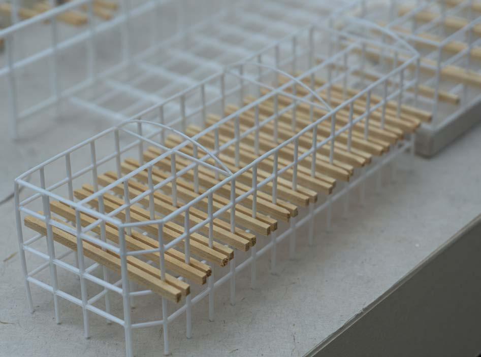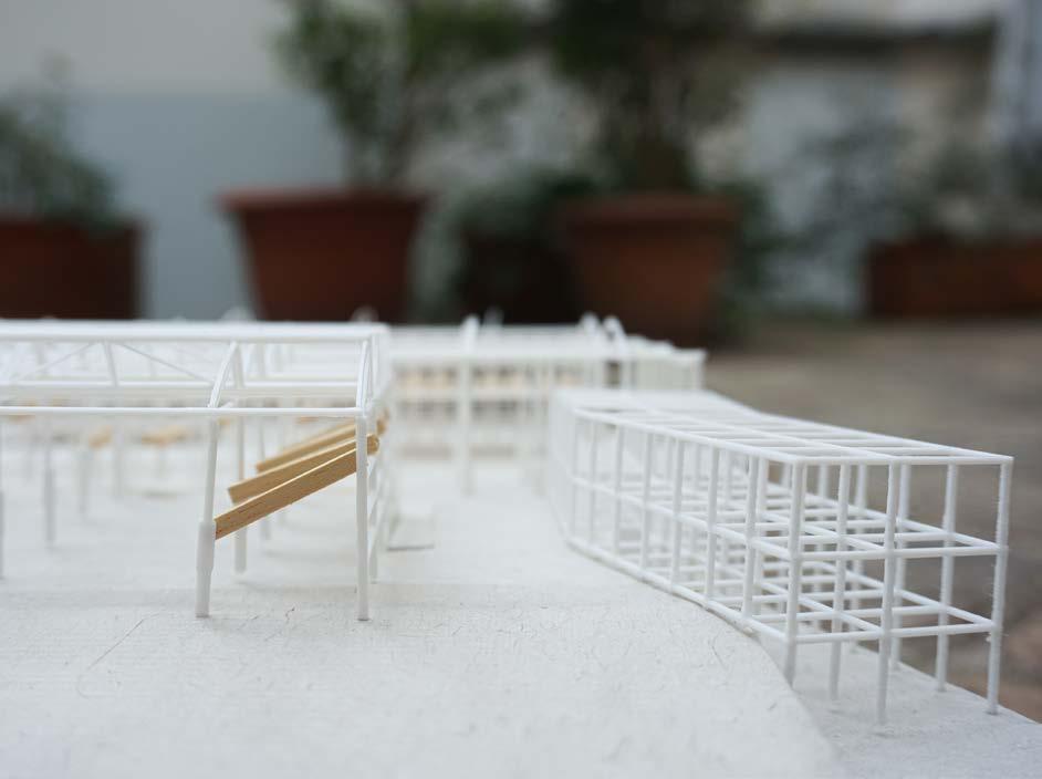 The model clearly delineates the ground and building conditions, accepting some of the occupiable space as part of the ground. Both the ground and the walls are read as the same material, while the steel structure that sits upon those walls is a light skeleton, resting on top. The building is then lightly clad, providing further contrast in these two building tectonics.