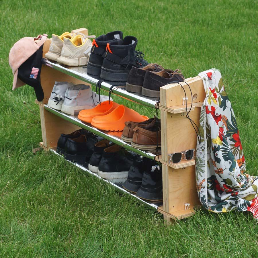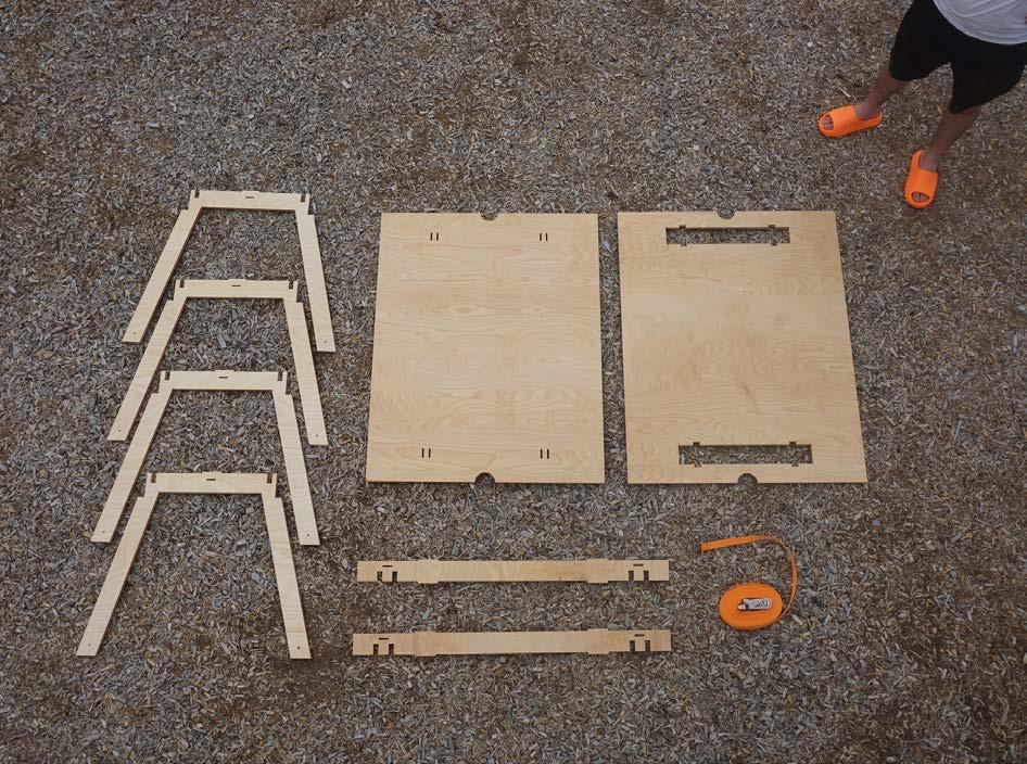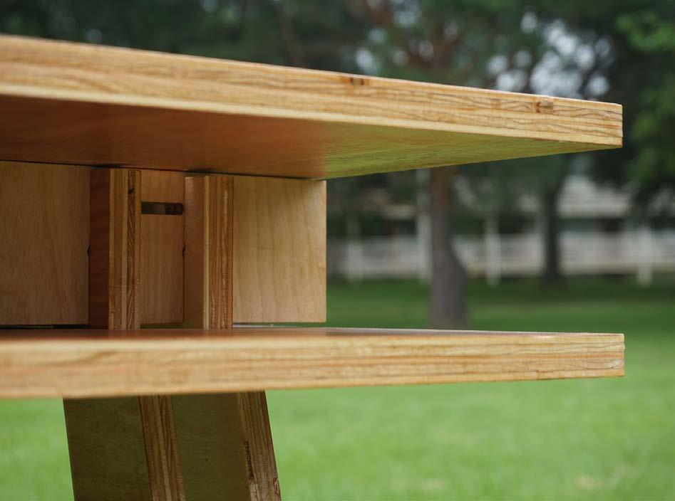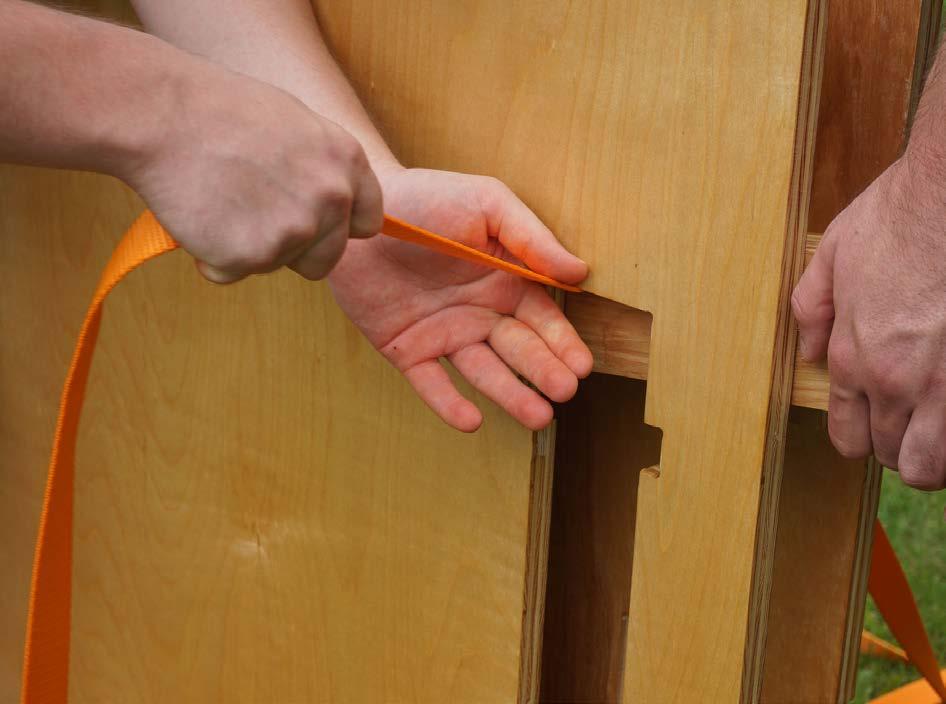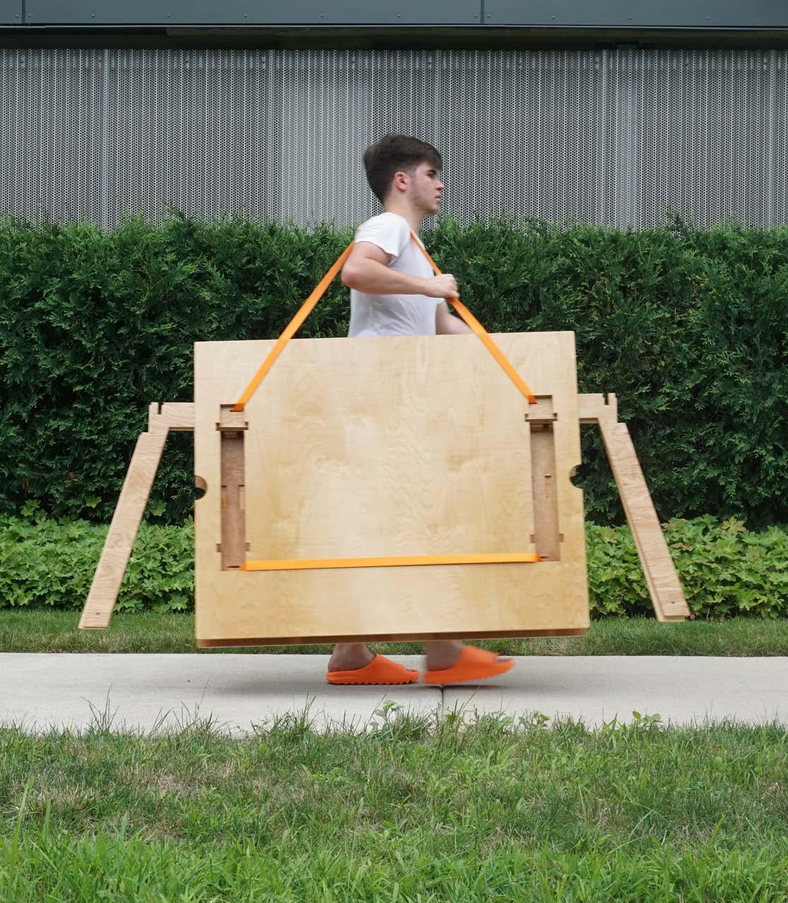 The Strap Table is made for working, dining, entertaining and moving. The table is made to move with a nomadic and uncertain lifestyle and remain useful. The table is friction fit and can be disassembled, packed flat, carried, and reassembled. The table is held together by a continuous ratchet strap which is used as a shoulder strap when moving making all parts of the table useful all of the time.