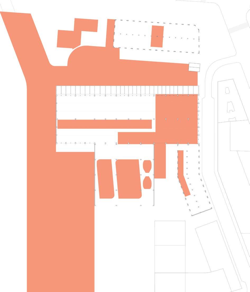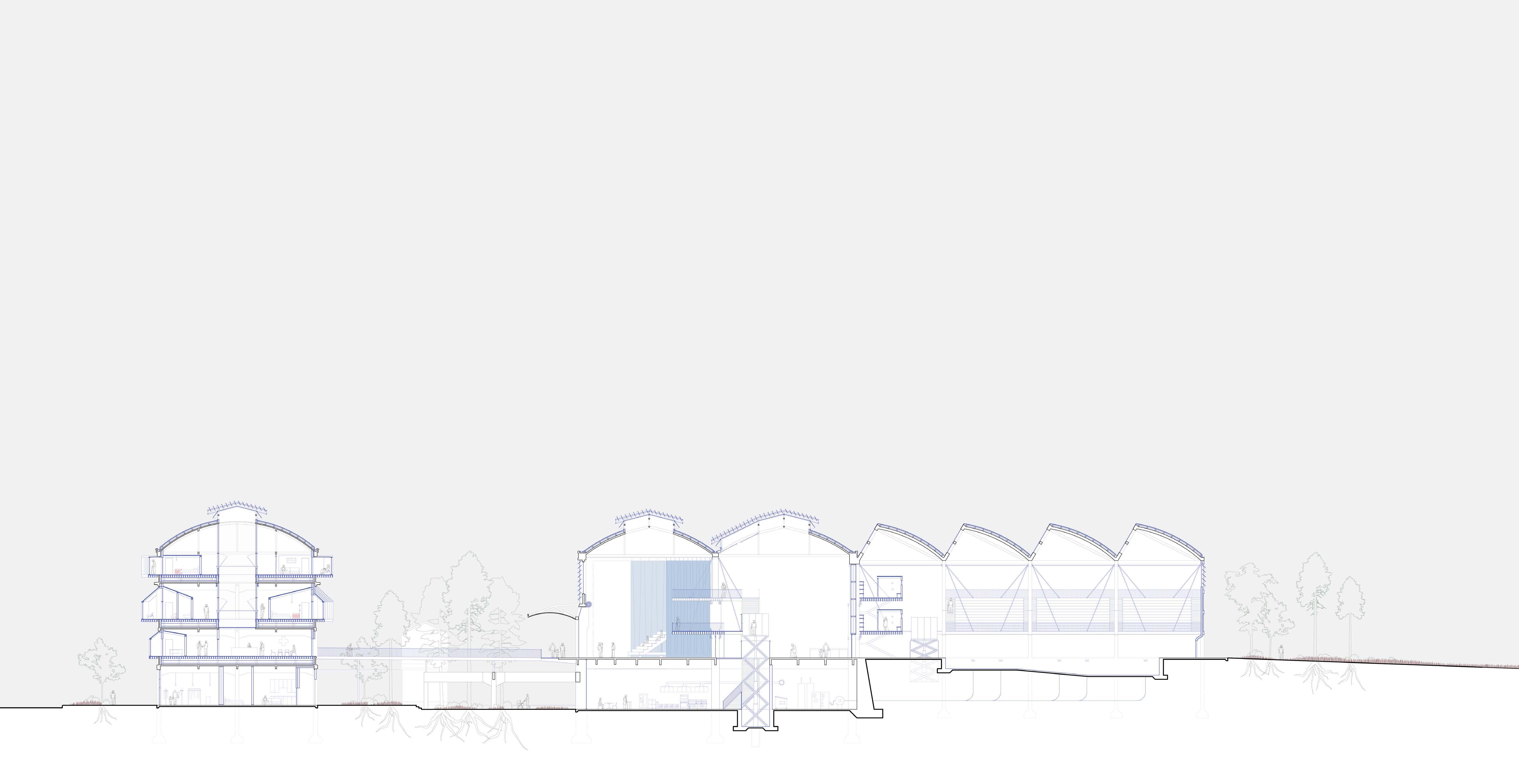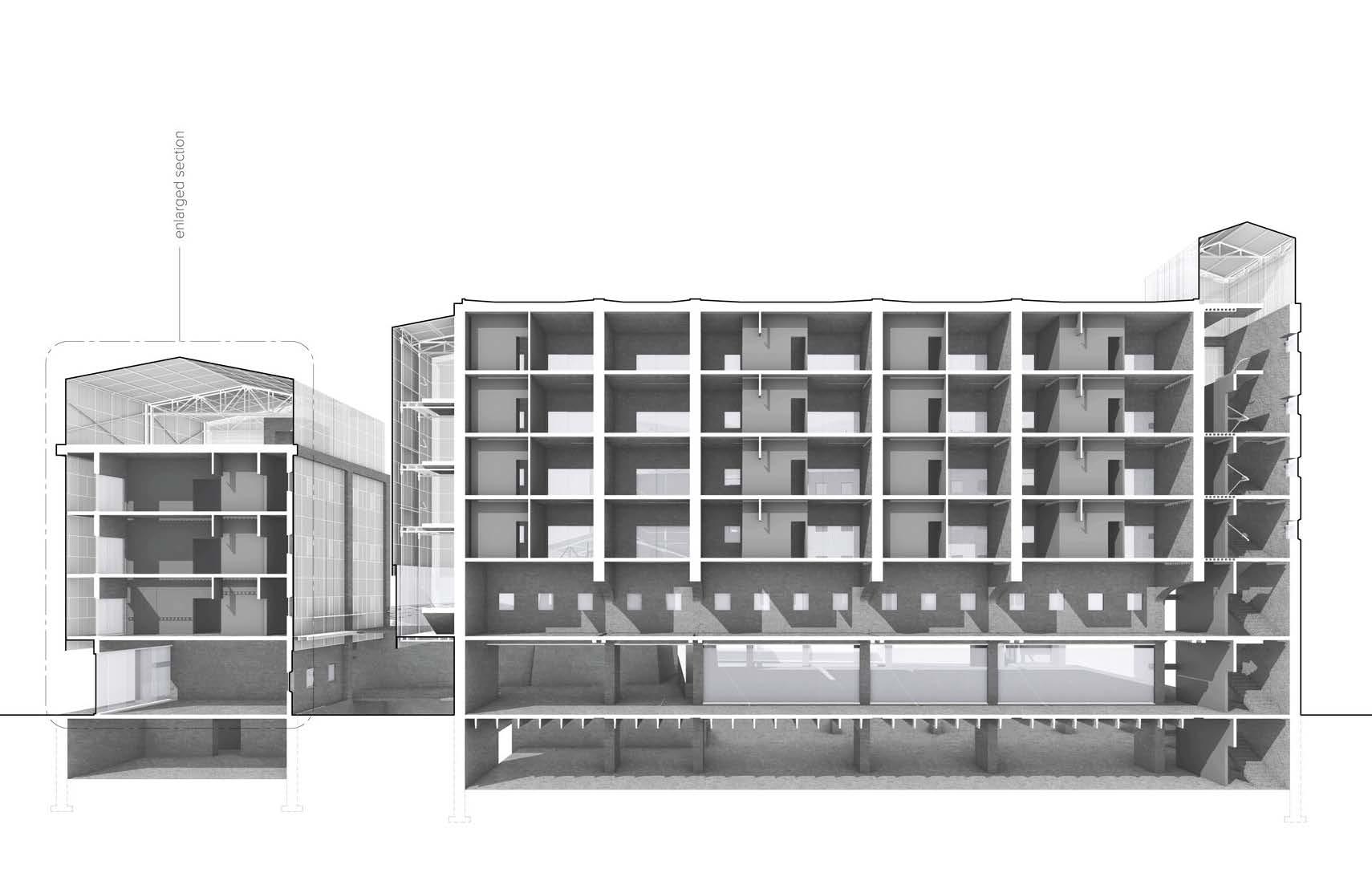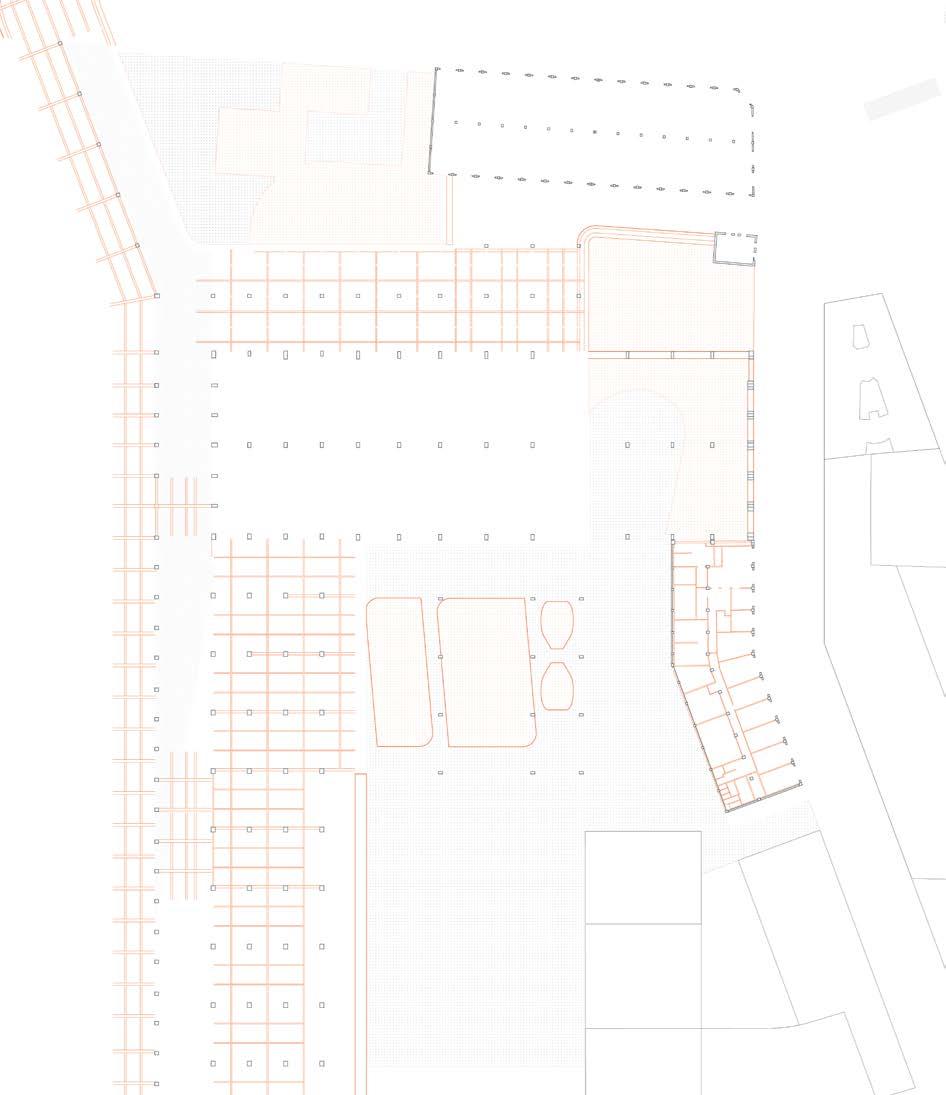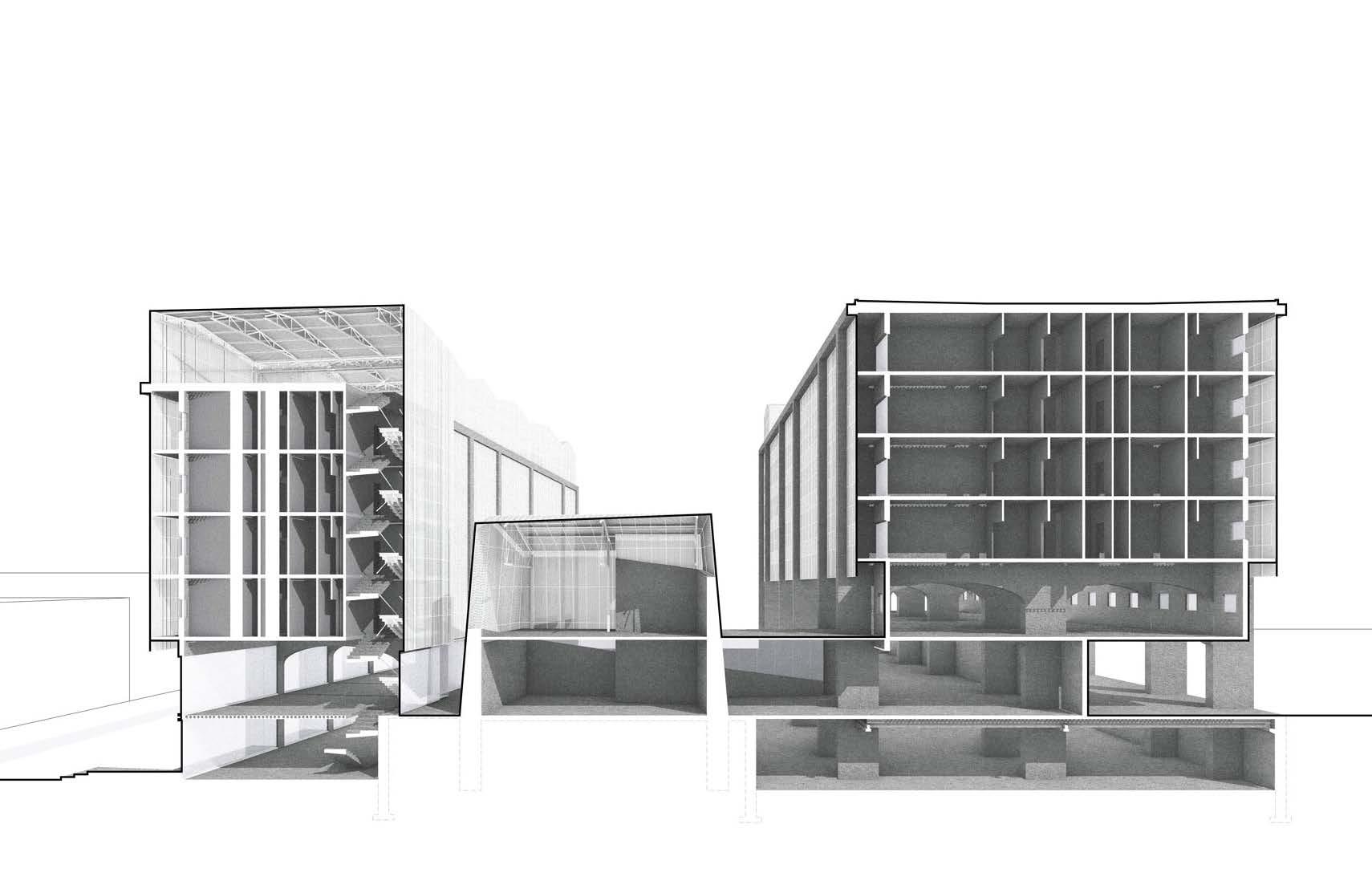 The design approach had three main motives through the project: preserving concrete structures while adding insertions to the volumes, bringing light into the volumes, and connecting the building to the current urban context through reconciling the elevation difference by revealing the existing underground structures