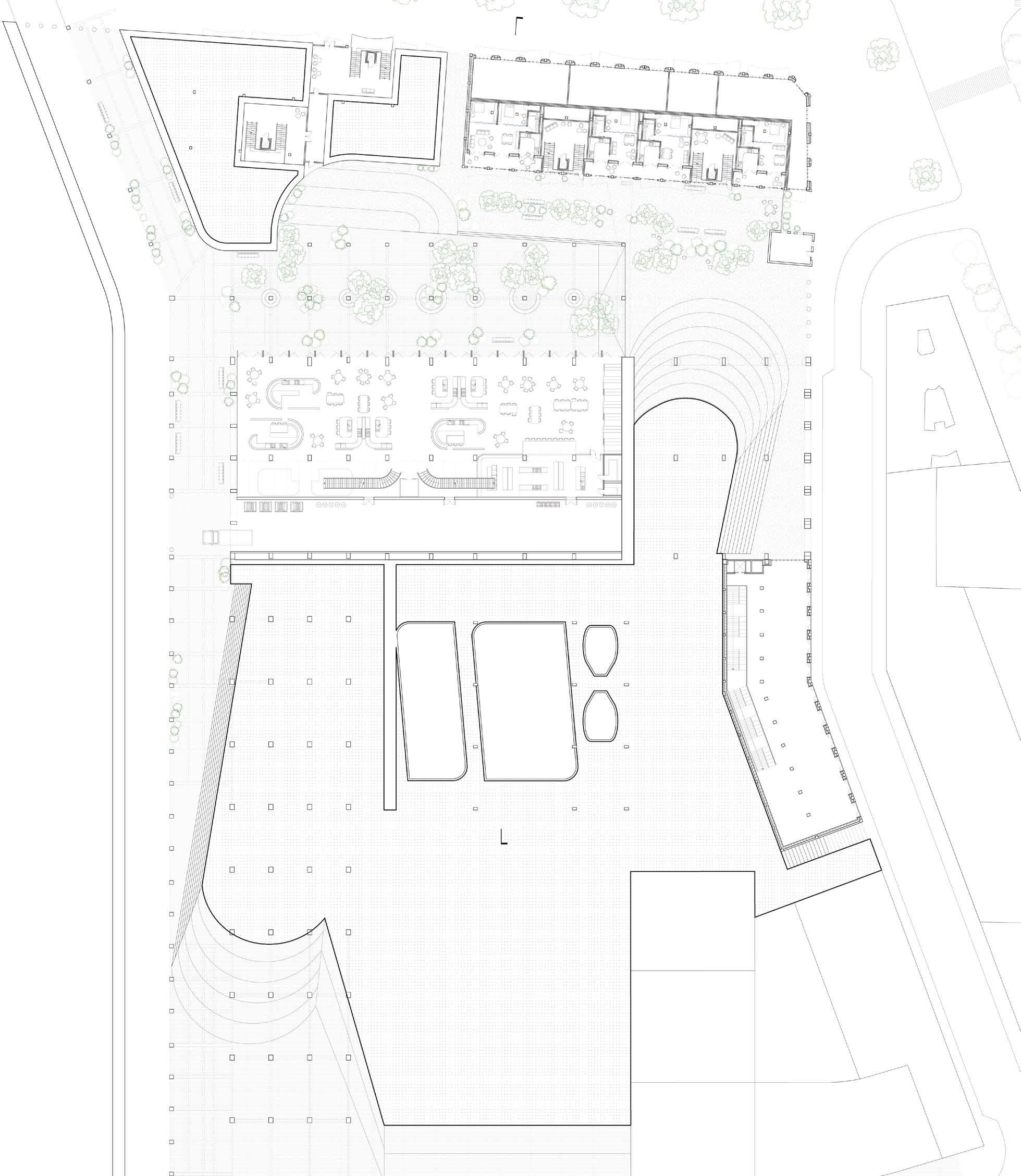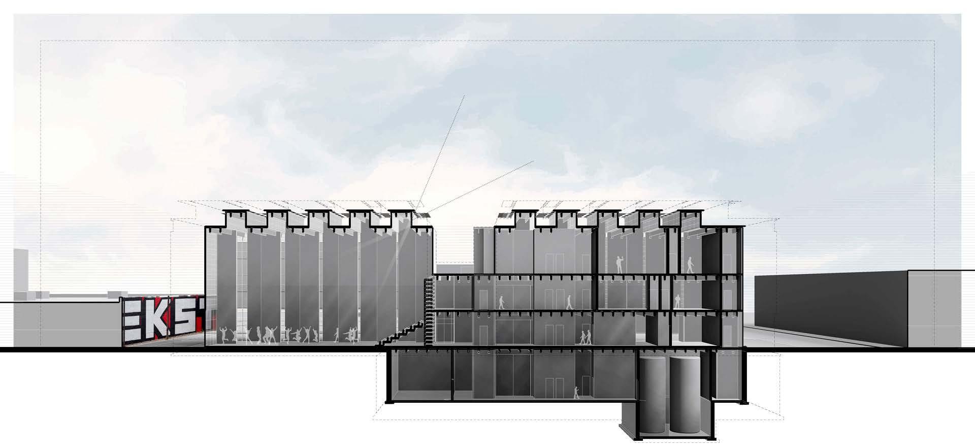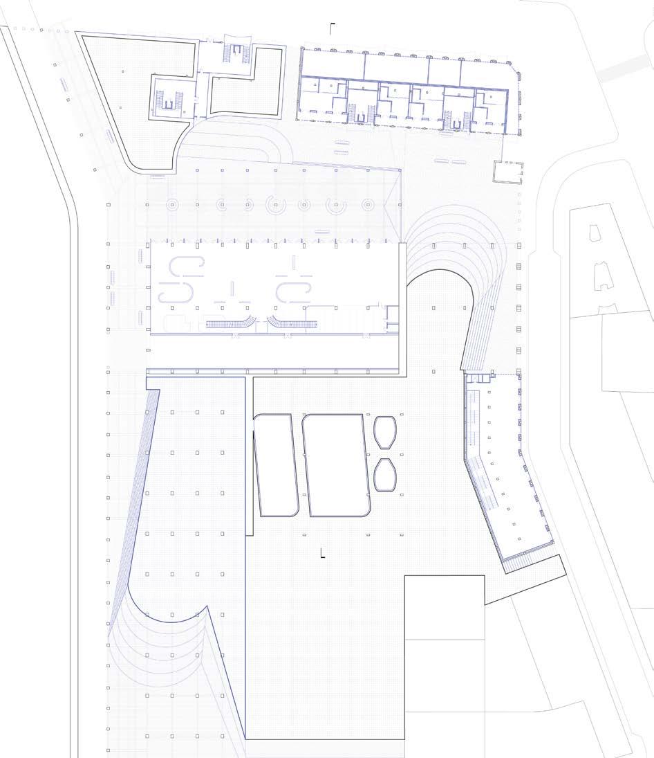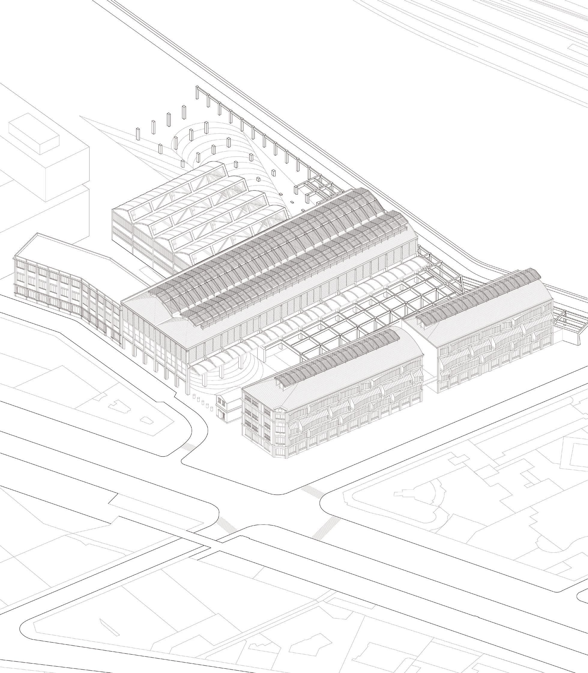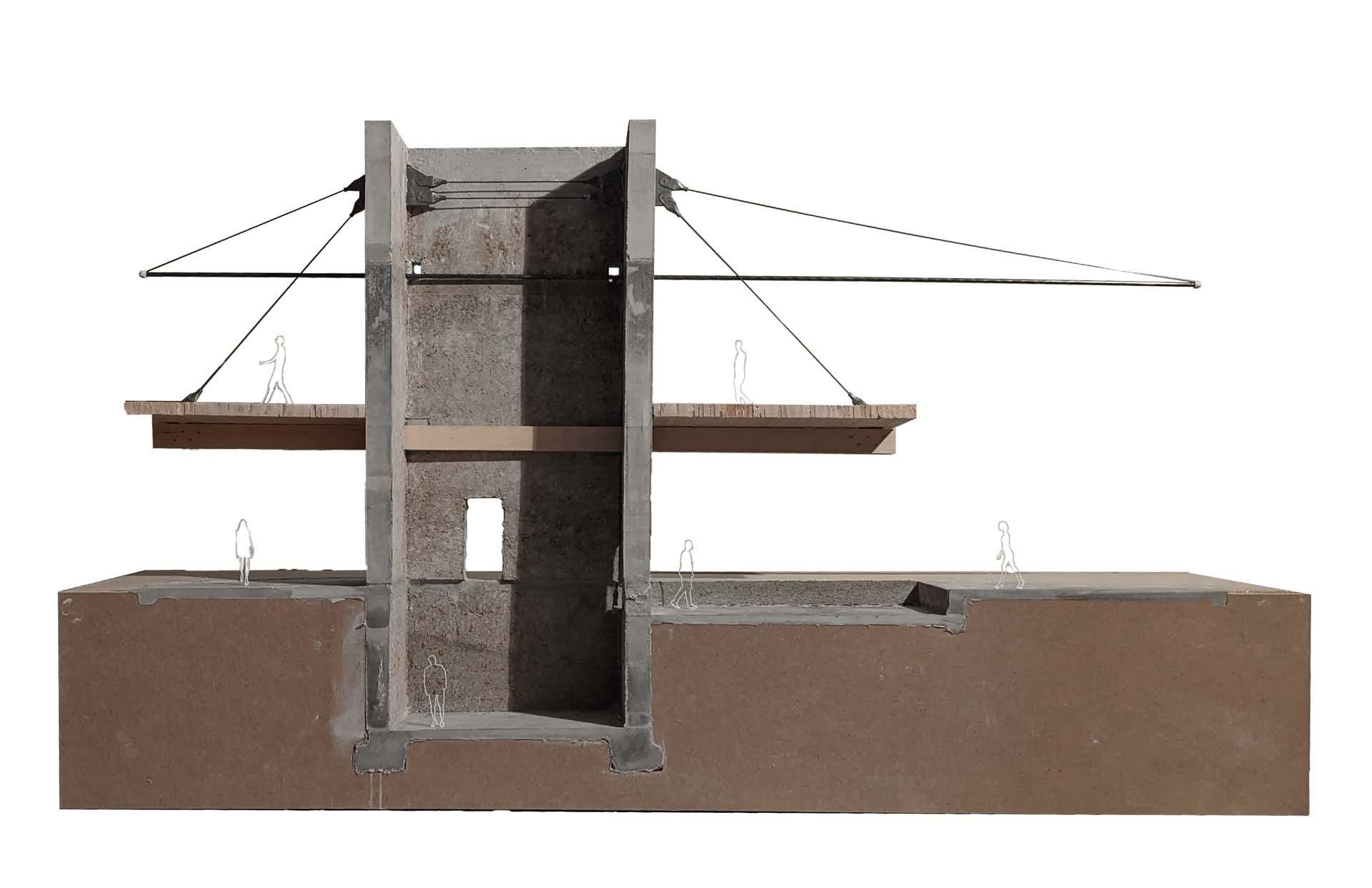 The design approach had three main motives through the project: preserving concrete structures while adding insertions to the volumes, bringing light into the volumes, and connecting the building to the current urban context through reconciling the elevation difference by revealing the existing underground structures