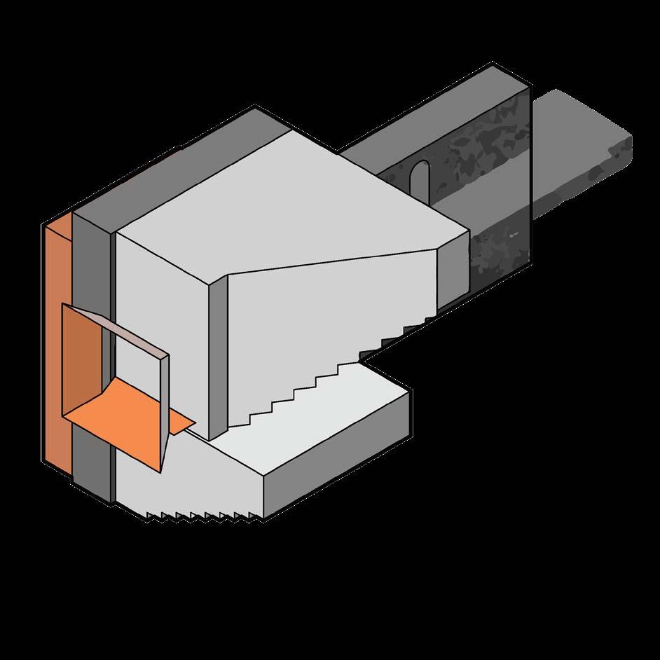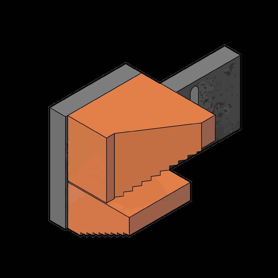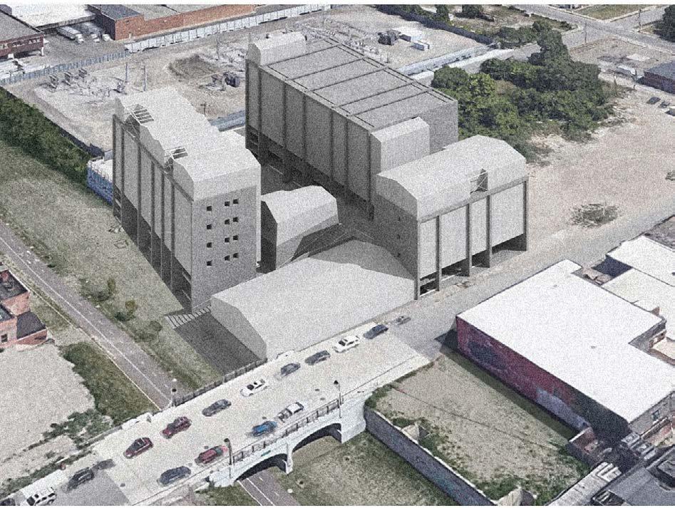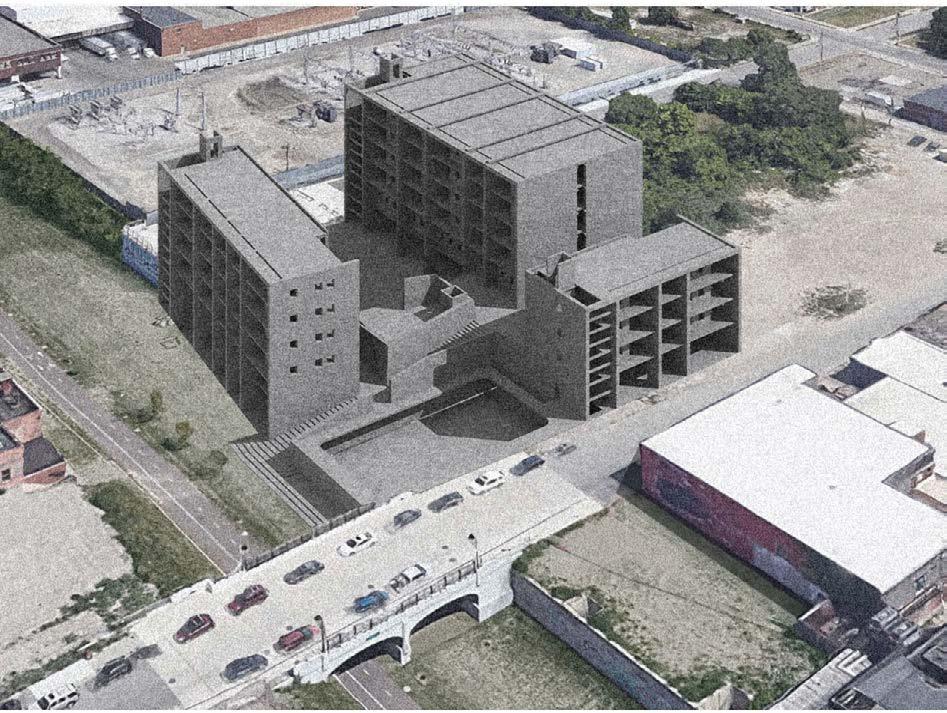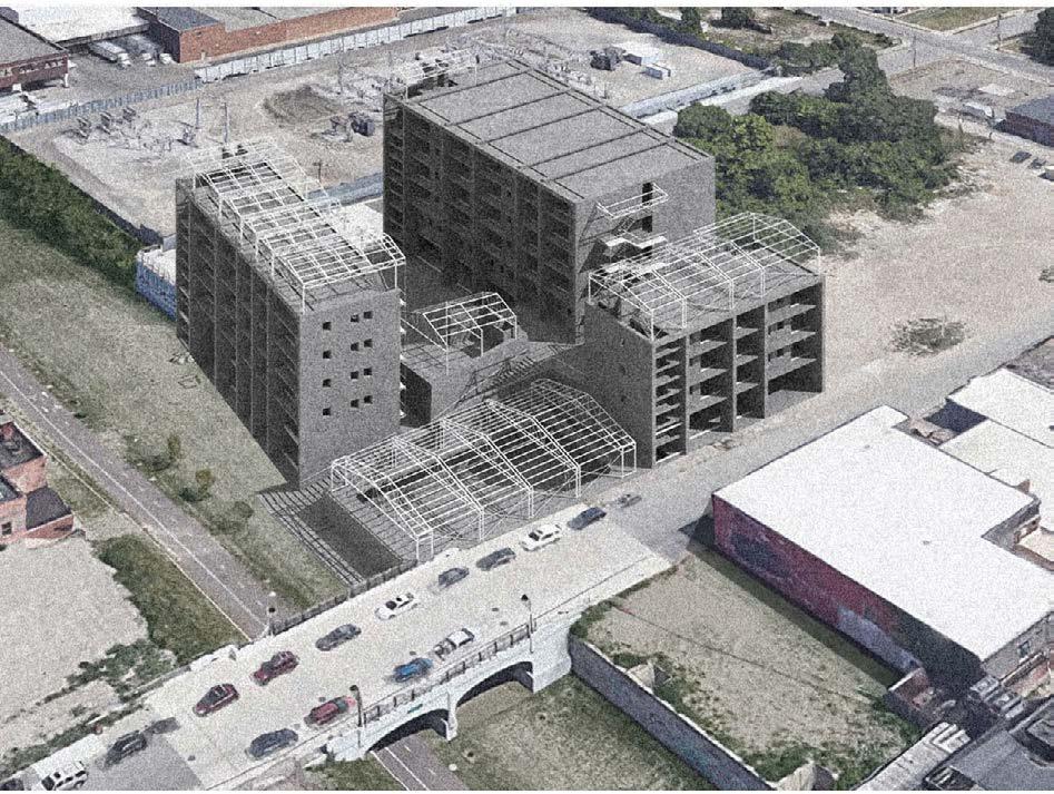 The first stage of construction, after site preparation and excavation is the pouring of the primary site cast concrete massing. This stage firstly retains earth, sets up the shear wall system’s rhythm that will be repeated above, and creates the unique shapes to define elements such as the educational space in the center, and gym space in the south west quadrant. The walls’ rhythm is determined by the residential spaces above, and their spacing is determined by what size of unit is above. In order to reconcile the more modular residential units with the larger footprint, open space retail and office spaces, the walls are punctured by large archways whose profile is taken from the multiple bridges that span over the Dequindre cut. Lastly, the site cast massing includes the monumental stair that connects the Dequindre cut grade to the street level grade, and terrace grade on level two.