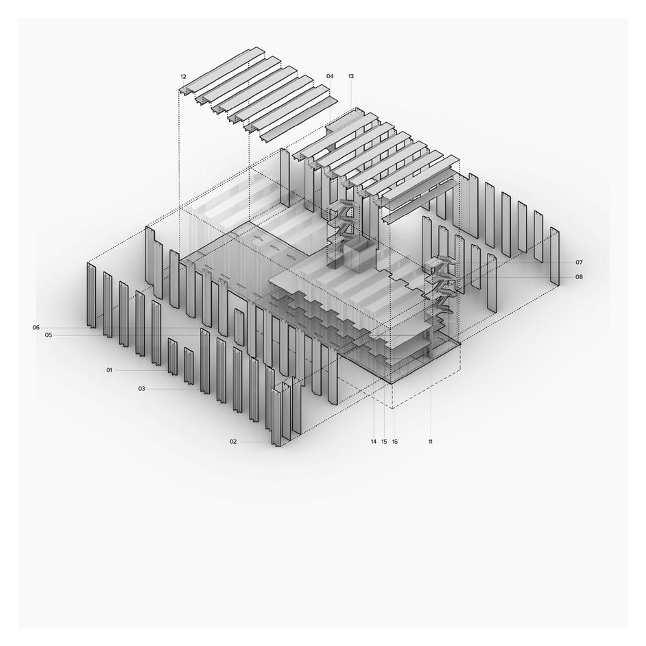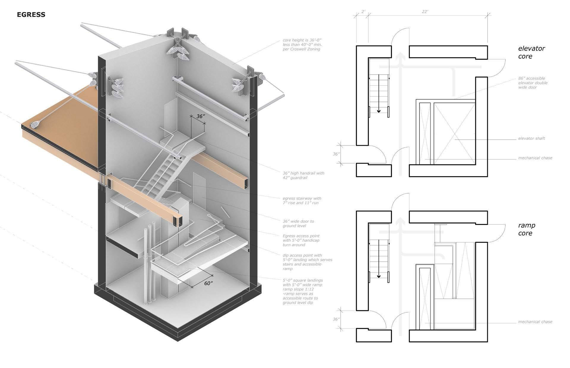 The core of the building is its most permanent gesture, and hosts all of the major systems, acting as an anchoring point for mechanical, structural, and circulation systems. It is constructed out of concrete and is meant to be a useful remainder after the building is occupied and the site is reconfigured.