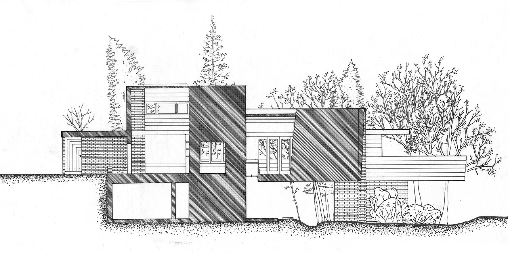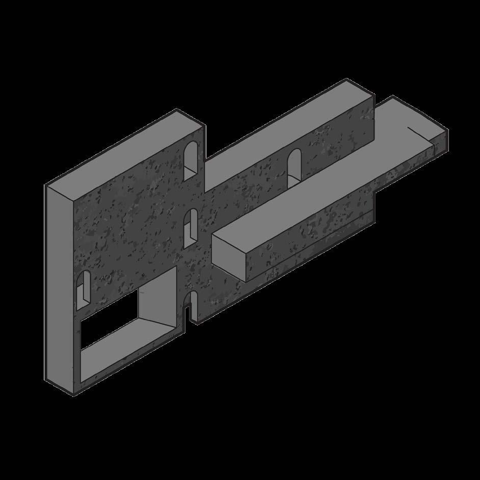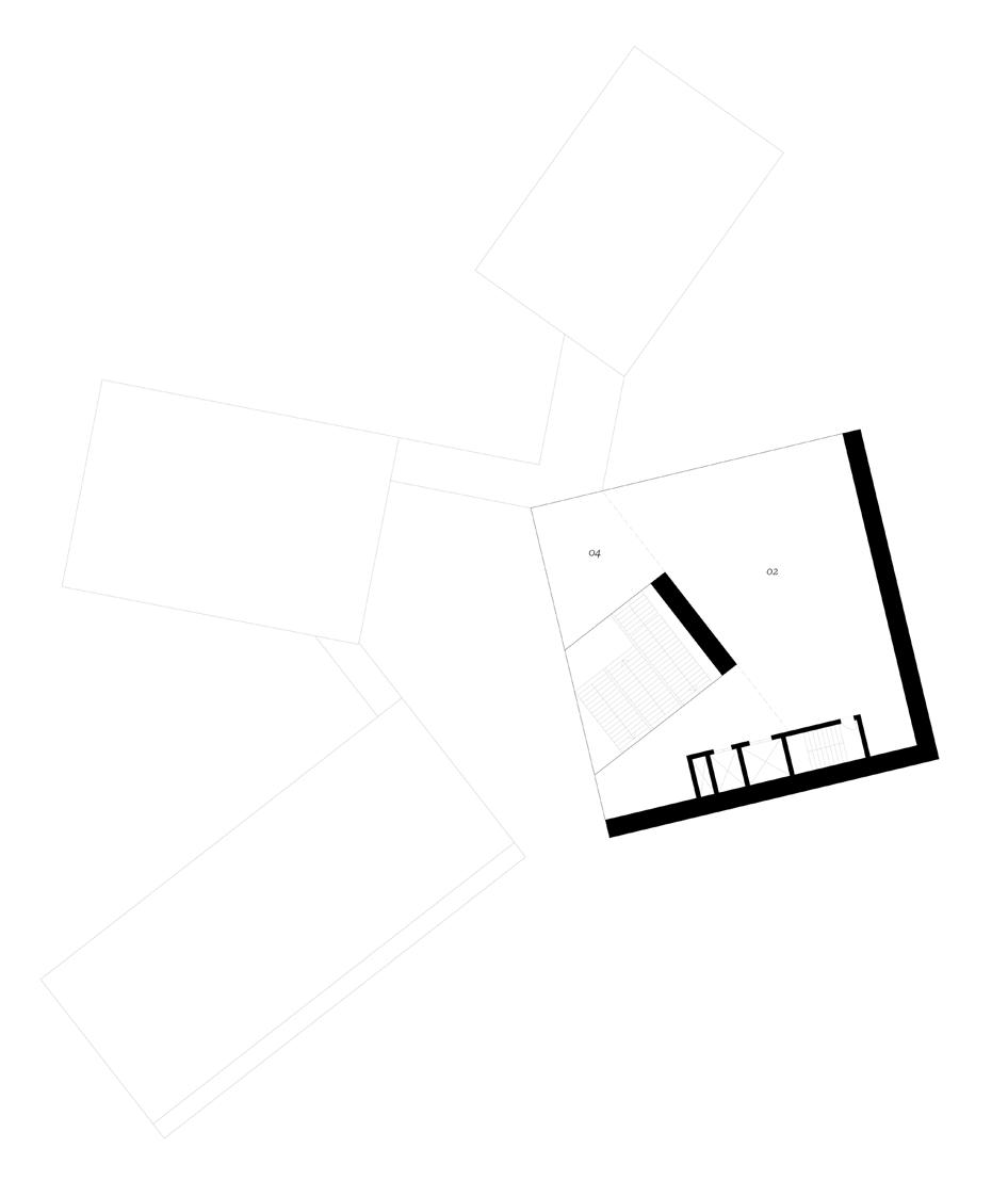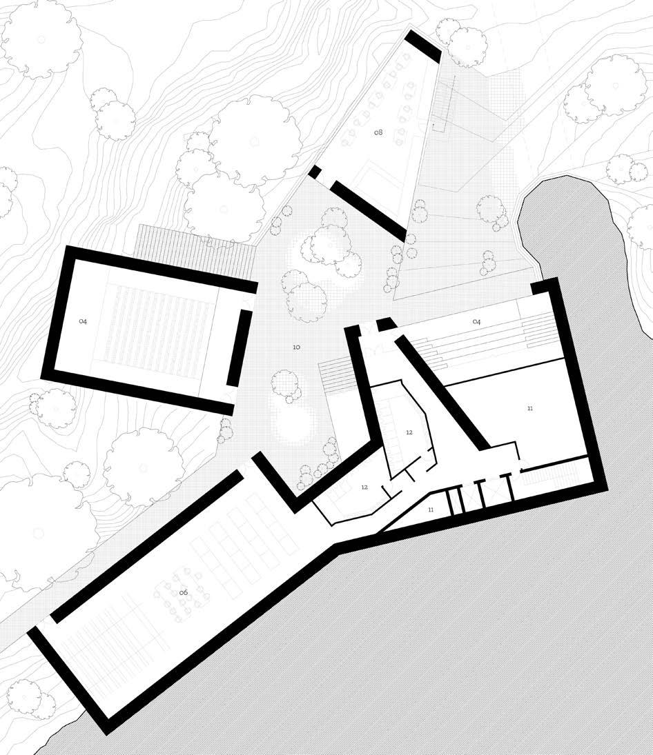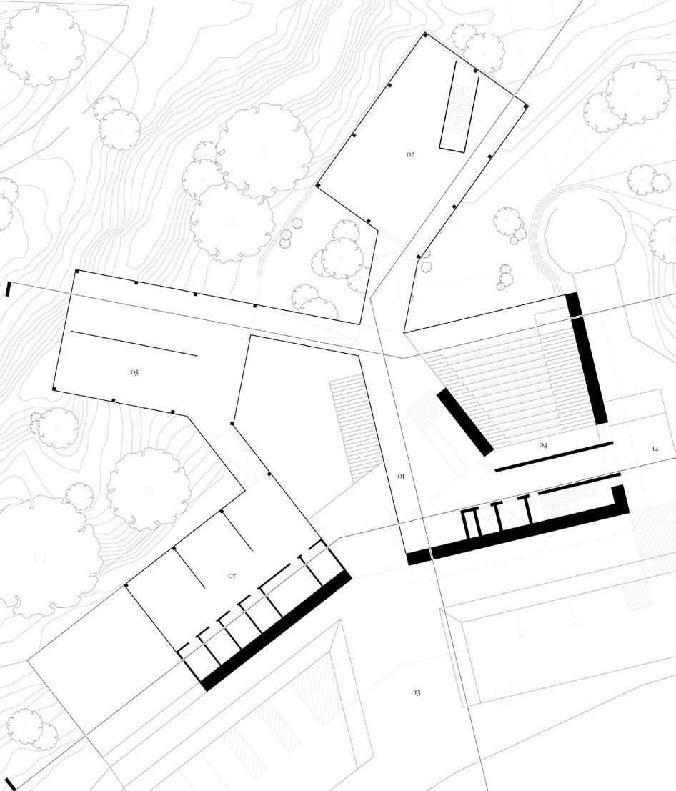 A Wall is built up, to formalize this break and distinguish itself from the city. In plan, the building strategically folds out onto the landscape. These footprints are supported by retaining walls below, and provide a secure place to build up upon, and rise up to divide and define the form above.