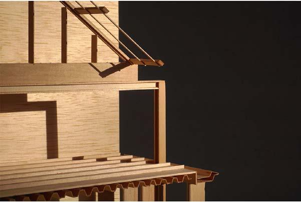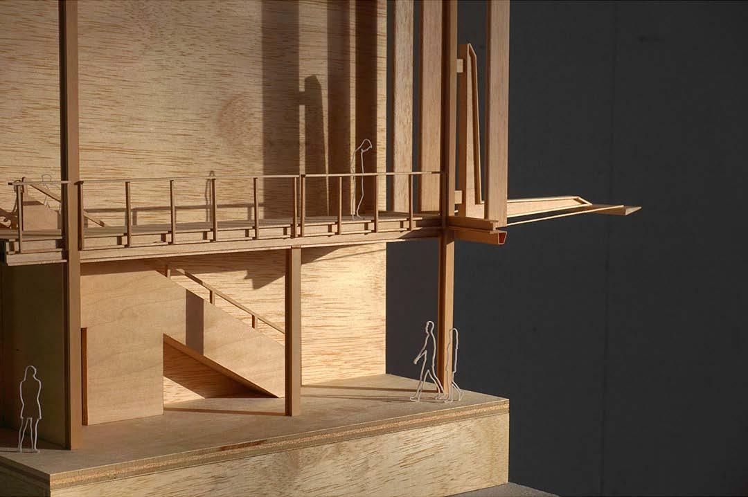 The unique composition of architectural systems can best be seen in together cohesively in section, where the gradient of permanence radiates from the core, with its systems fanning out, most dramatically being the suspended cantilever of the second floor. The model reflects these systems and materials at an equally dramatic 1/4” = 1’-0” scale.