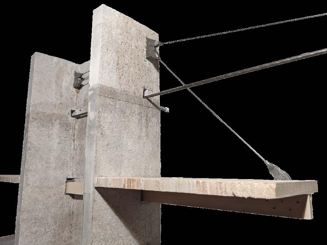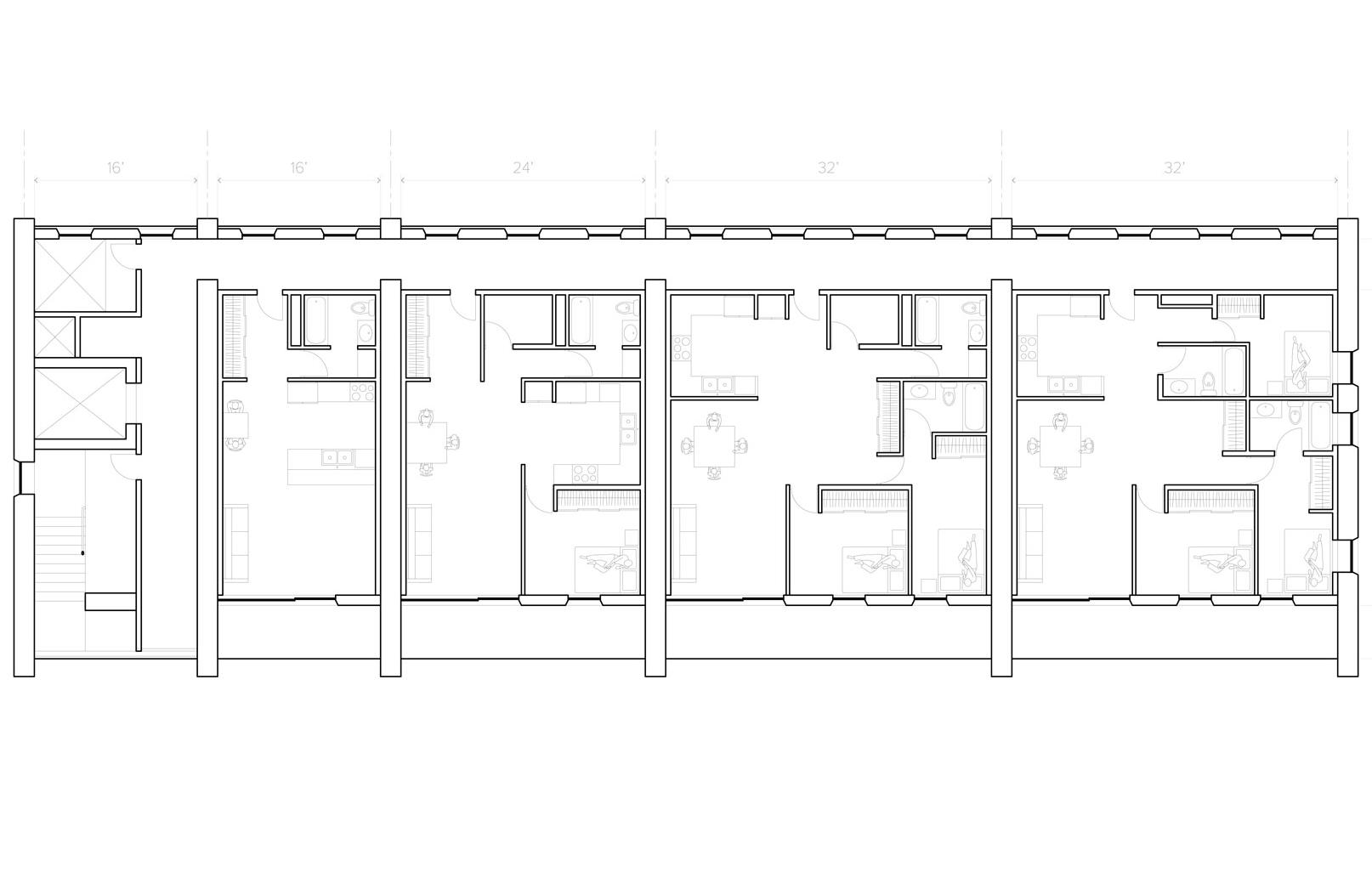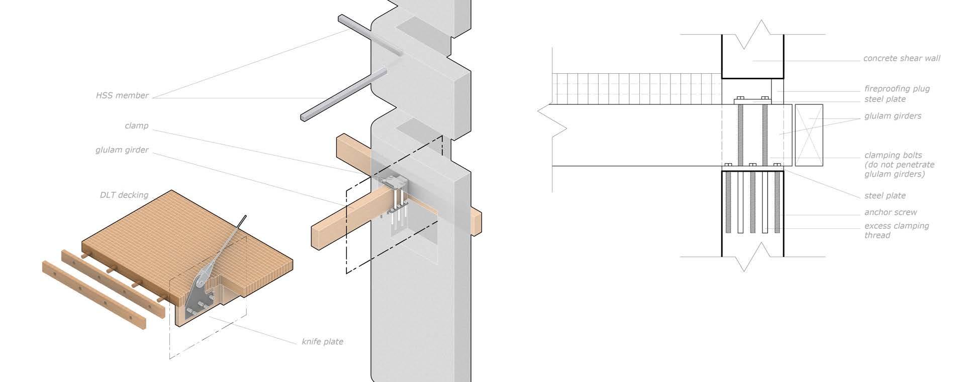 Pre-cast hollow-core concrete slabs are installed next, spanning perpendicular, and between the previously erected site-cast and pre-cast concrete walls. The slabs also vary in length given the rythym of the walls, but still maintain an economy of scale because of the typical 16’, 24’, and 32’ spacings determined by the residential units. Similarly, pre-cast beams are spanned between the walls in order to support slabs which run parallel to the walls in spaces like cores where precast stair units and typical hollow-core slabs sit. Similarly in the core are pre-cast elevator cores which extend above the wall height to provide access to greenhouse and rooftop spaces for general access and maintenance.