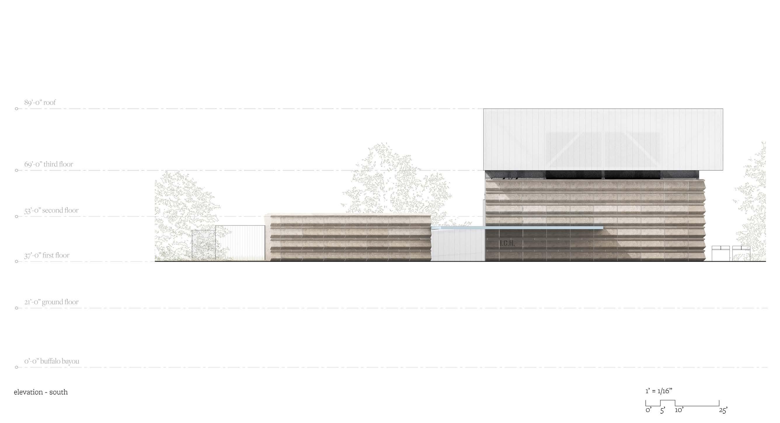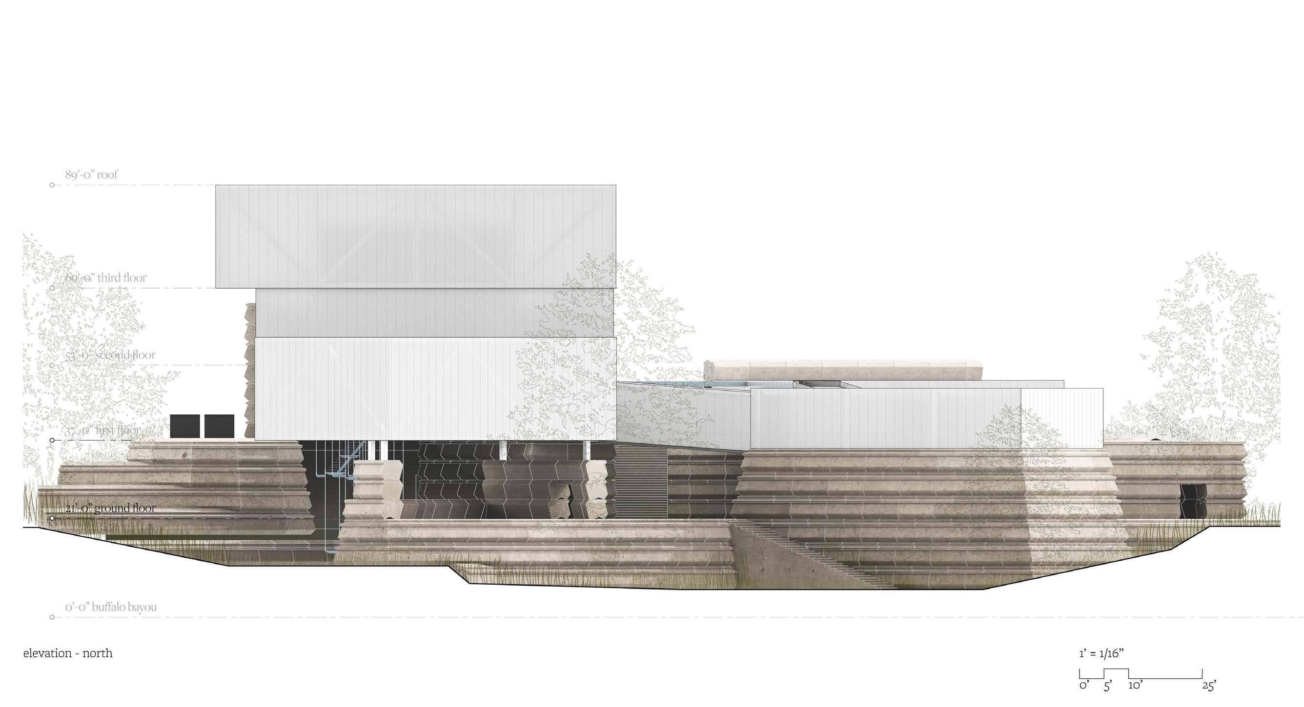 The wall that breaks the building from the city reads simply from the southern side, where you would approach the building from the city. From the Bayou in the north, the buildings formal reading is more porous and fragmented. The singular entrance from the street is contrasted by the multiple paths down to the Bayou.