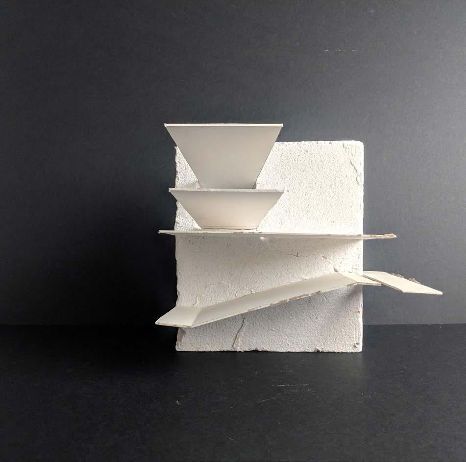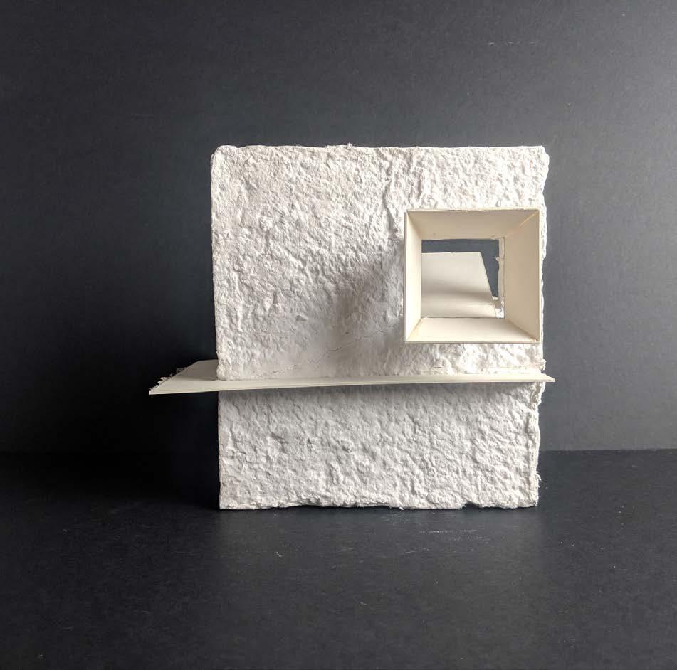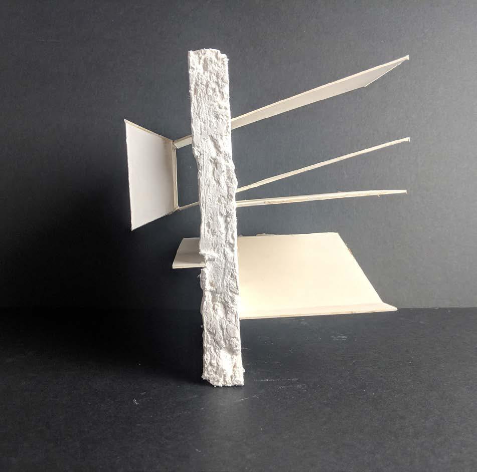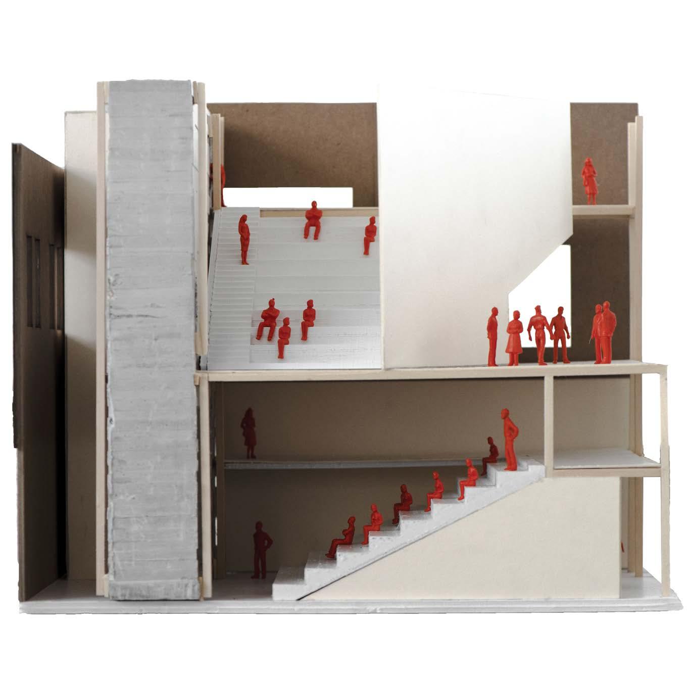 Both theaters are exposed and occupied. The final model represents the culmination of many study models experimenting with thin planes intersecting or penetrating a monumental wall.