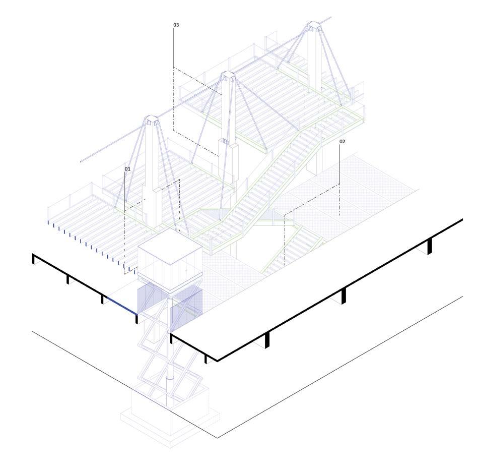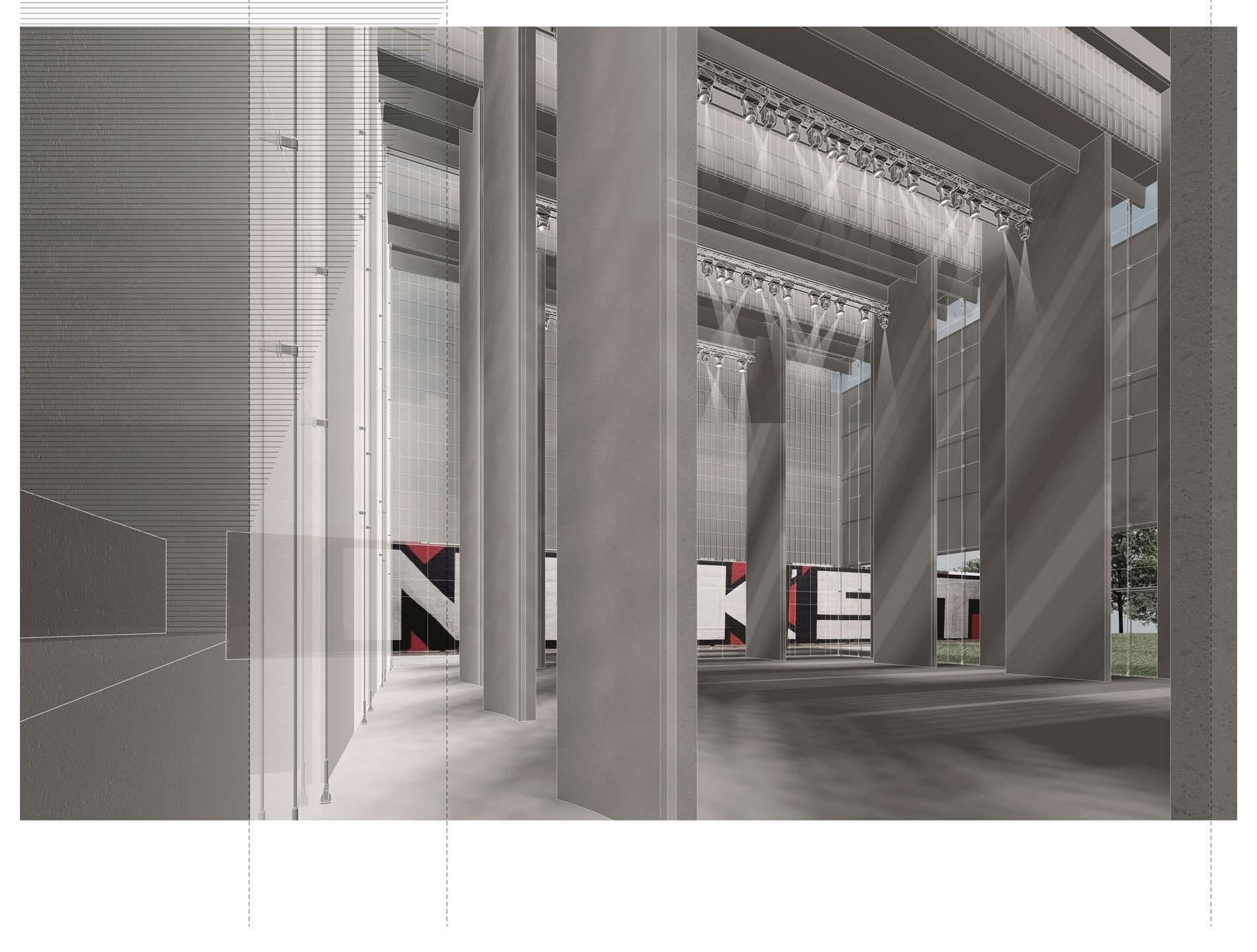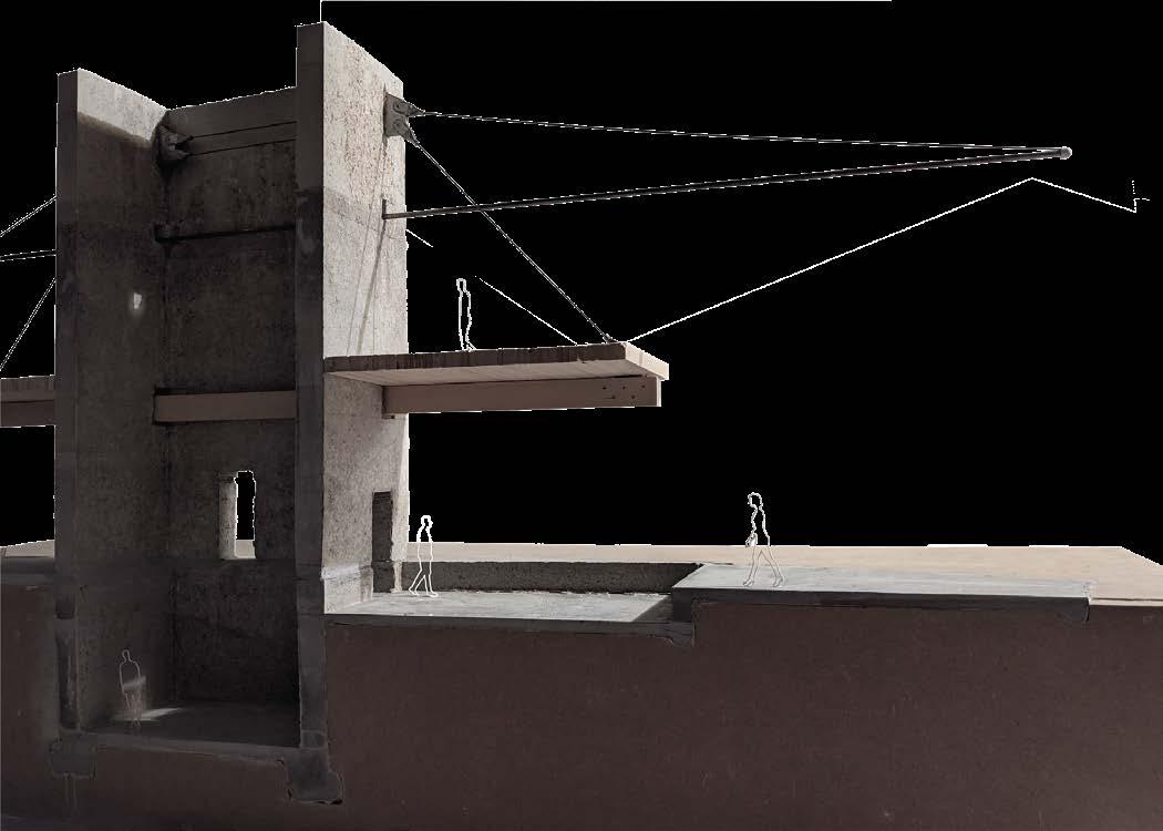 In an attempt to read light, the new insertions are also hanging from the existing structure. The three main hanging platforms are in the auxiliary hall and pool, while the addition to the telegraph building acts as a shelf sliding through the fenestrations over the existing structure. The last motive defining the remaining gesture is the removal of slab and roof in the Halle’s the telegraph buildings to help bring natural light and ventilation into the spaces. Ultimately, we are trying to find the most value in minimal demolition.