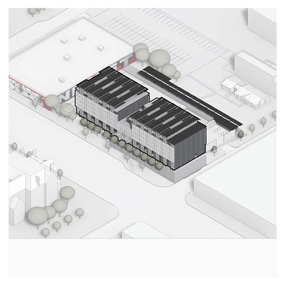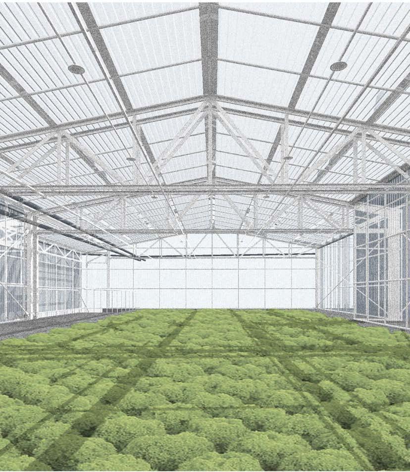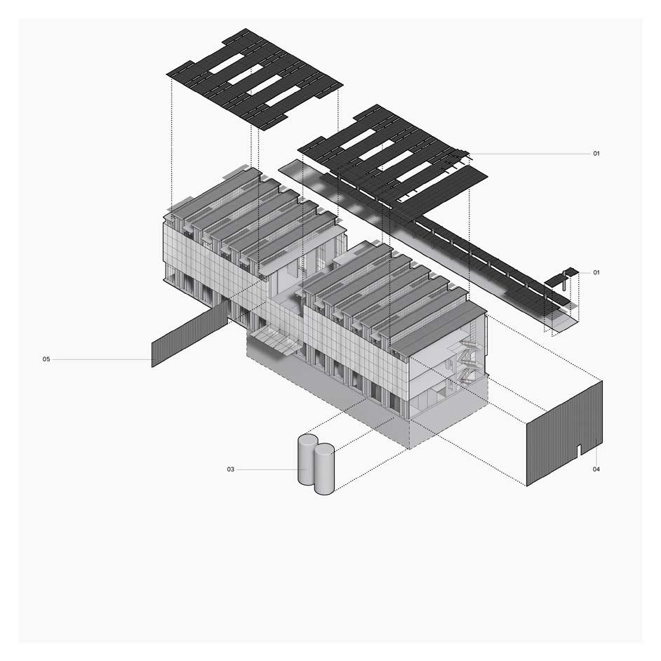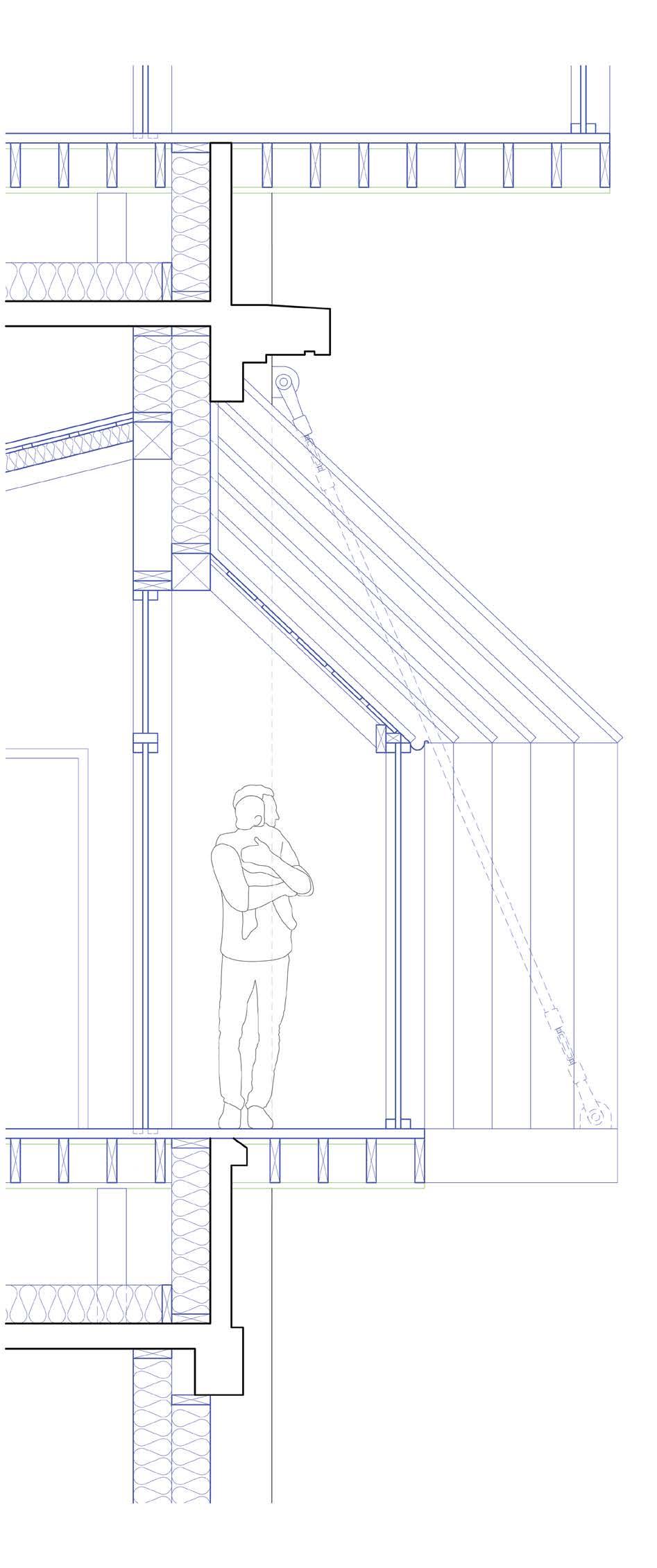 The primary cladding of the building is made of polycarbonate and kalwall materials, all translucent, with varying levels of transparency, however on the exterior they are meant to be read as a singular, light and airy material to contrast the heavy gestures made by the concrete. This polycarbonate is of most use on the greenhouse spaces above two of the residential masses, however their profile extends downward to enclose the balconies of the residential units, but remain operable at viewing level to give the occupant the ability to bring in direct light or not, and subsequently increasing or decreasing the heat gain of the space.