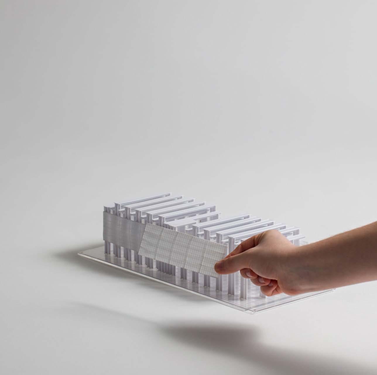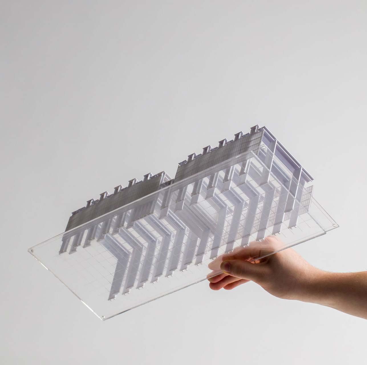 The model is meant to act as a clear and readable expression of the structure and enclosure. The structure sits on a clear base, allowing for a view of the interior conditions. The double facade enclosure sits on the vertical double tee fins and remains removable to demonstrate the sequence of assembly.