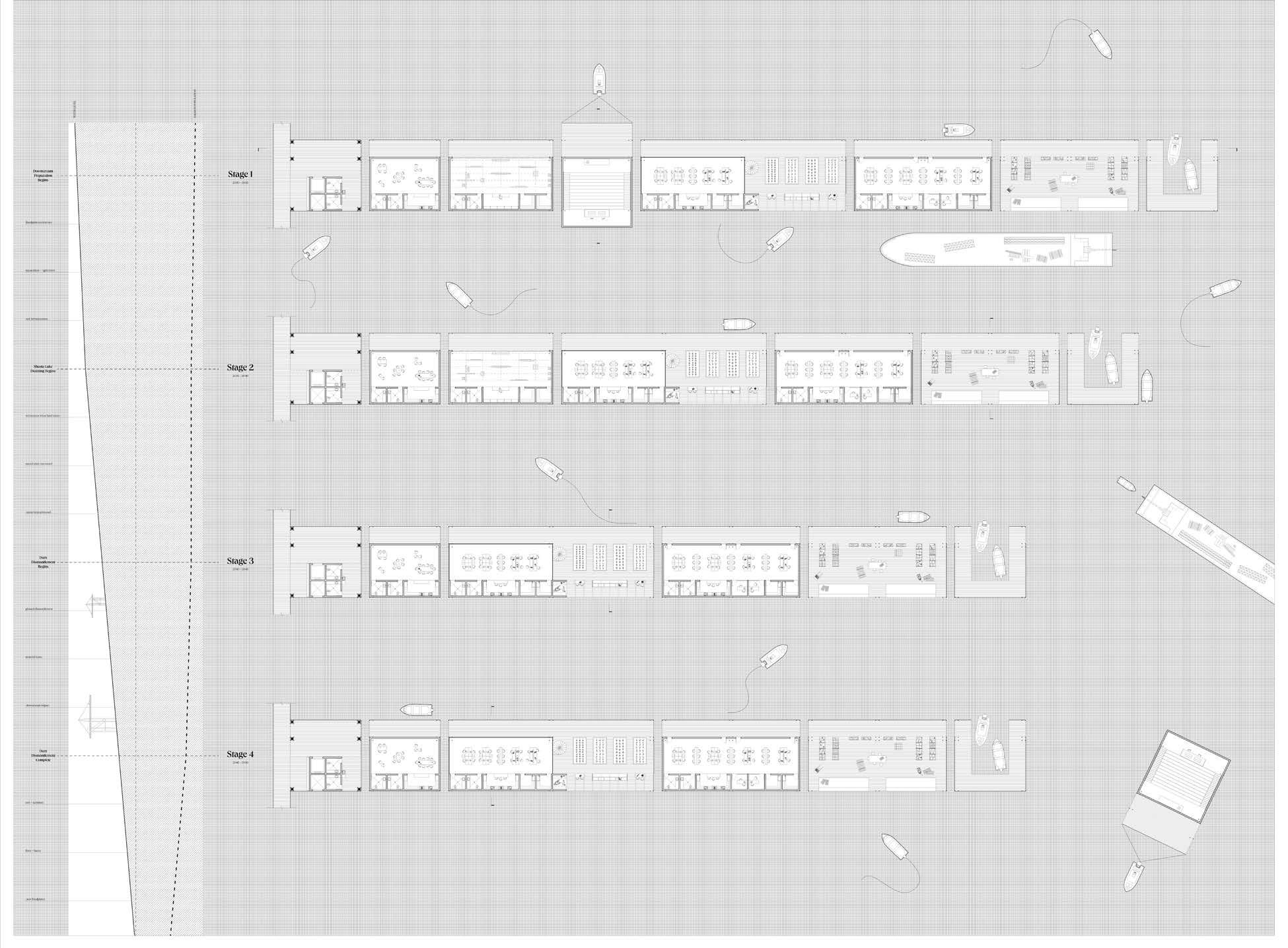 The floating platforms of various programs are tethered linearly, beginning with a core module. This core is the only permanent construction of the institute and is intended to remain far past the dismantling of the dam, while the other platforms dismount and float away. The core is anchored down the lakebed by an array of piers which keep the train of platforms from moving. While in the beginning stages, the Institute may appear to be arbitrarily placed in the lake, the piers that support the core touchdown just off the shore of what has been, and will be, the level of the Sacramento River when the Shasta Dam no longer reserves water.