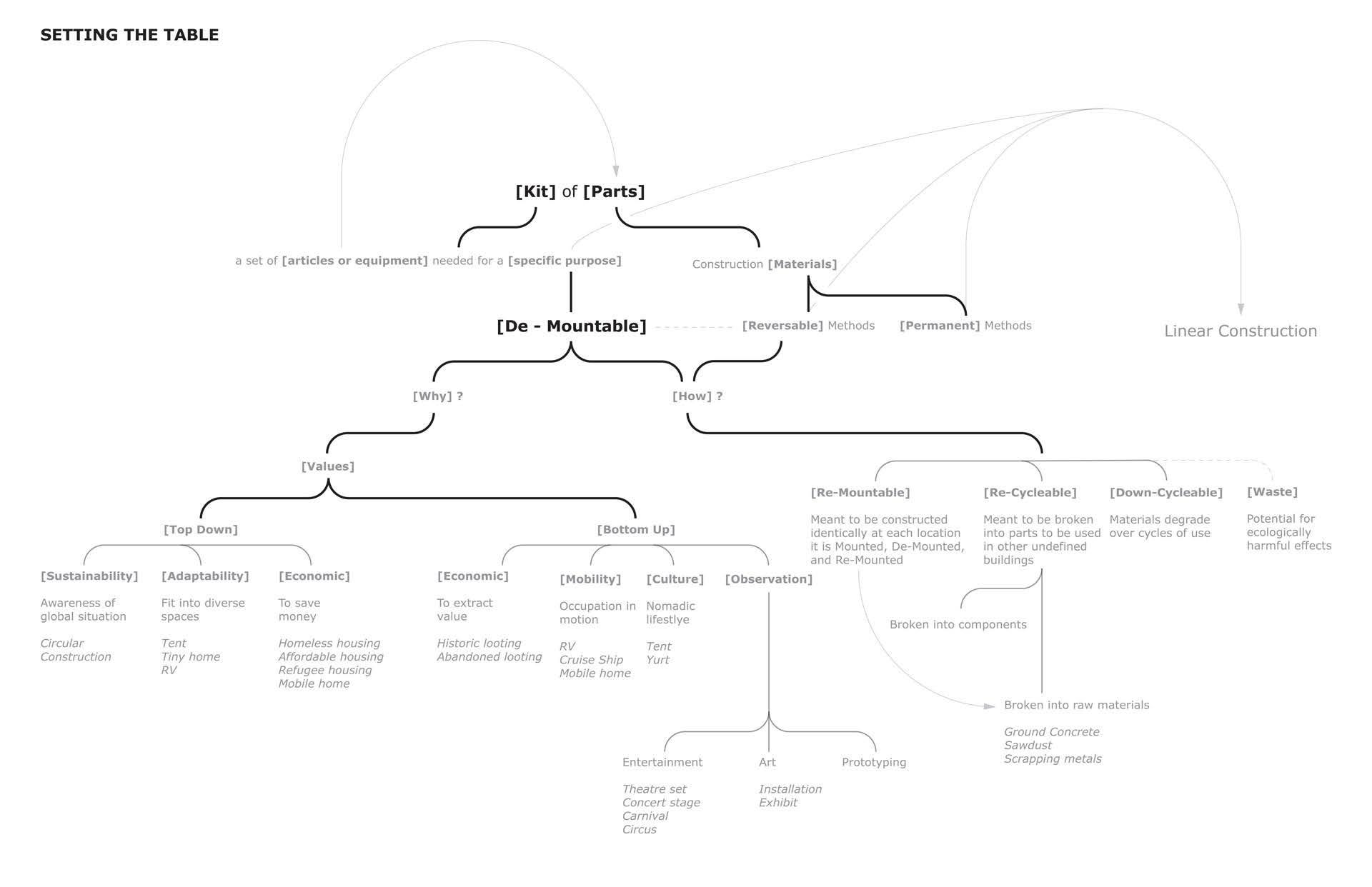 All architecture is de-mountable as it is eventually demolished or abandoned. All architecture is also made from a kit of parts which are prescribed by architects with instructions on how make them whole. De-mountability implies re-mountablity. This dichotomy is the essence of circular construction which requires energy that is only exerted when its outcome has value. Therefore, the kits of parts and their subsequent instructions that architects prescribe should be in service of re-mountability which can exist within the current set of economic and cultural values. Some outcomes of circular construction have value which is not immediately obvious. Circular construction which is beneficial to the environment is a much larger and longer idea whose benefits are not always clear to those who are short-sighted or ignorant. The eagerness to replace and demolish architecture for new lies partly in the excitement of experiencing a new building and partly in