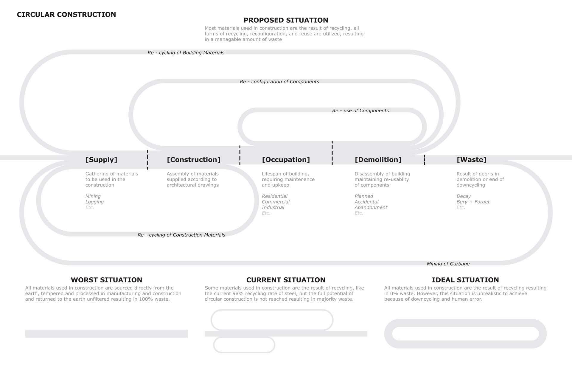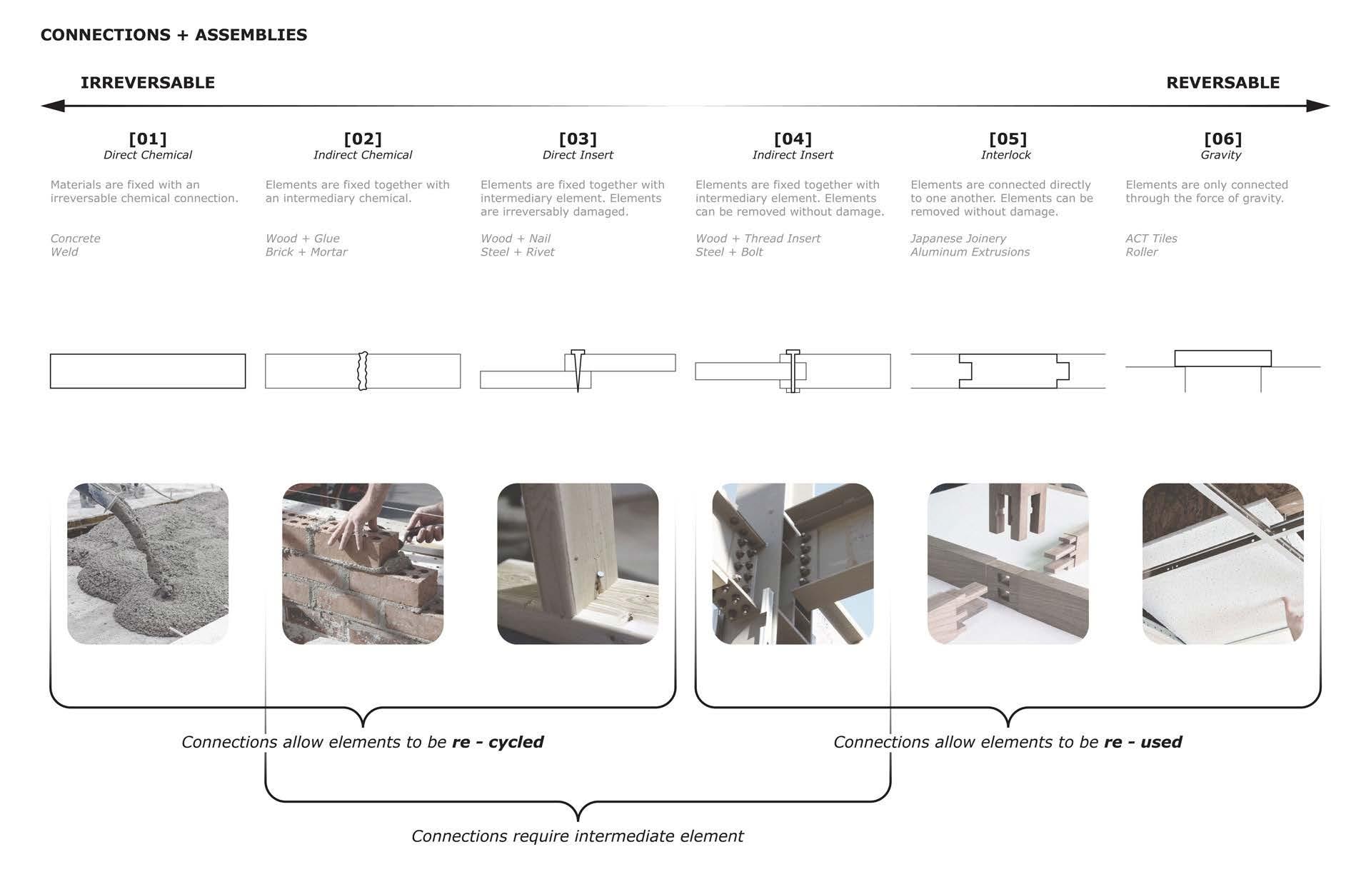 breaking them down and reusing them as raw materials like recyclable materials (which is not possible), they are reused as a complete assembly and constructed to be as easily removable and reusable as possible. In lieu of an economic revolution, it is the architect’s responsibility to strive towards a circular construction by defining how far materials can break down and still be usable, and develop techniques and assemblies to ensure their future usefulness.