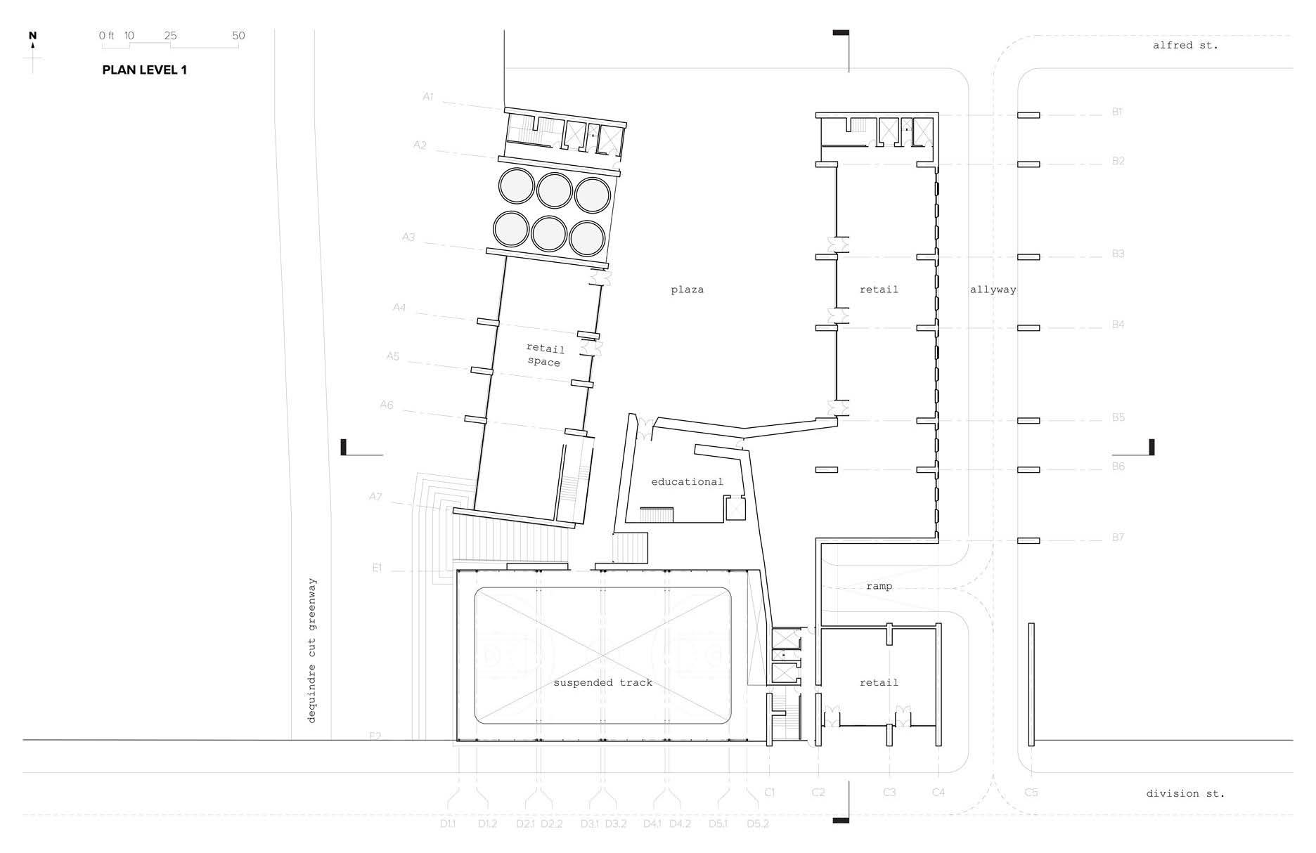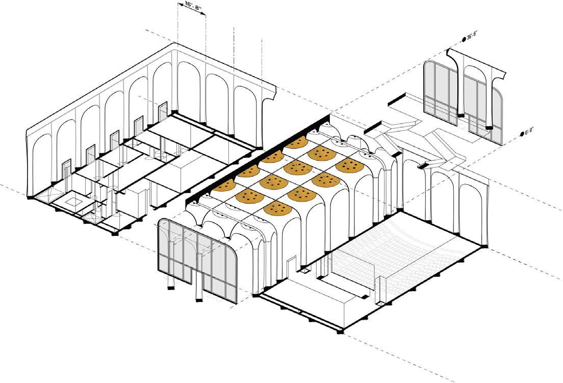 Outdoor space, covered and uncovered, is used as a connection between the fundamental program masses. Uses of the spaces range from completely outdoor, unconditioned with a roof, and conditioned with an operable envelope. The primary facilities are inserted into the existing building, with each holding one. The insertions are made with minimal impact to the structure, as all the interventions are trying to do. In this approach, the secondary spaces also take advantage of the current conditions. The existing basement structure is unsurfaced. The heavy columns, beams, and retaining walls are exposed, some components strategically removed, and used as organizational mass, and structure for these secondary spaces. Depending on the internal function, the existing envelope is either maintained with updated glazing, removing glazing, or removing the enclosure altogether.
