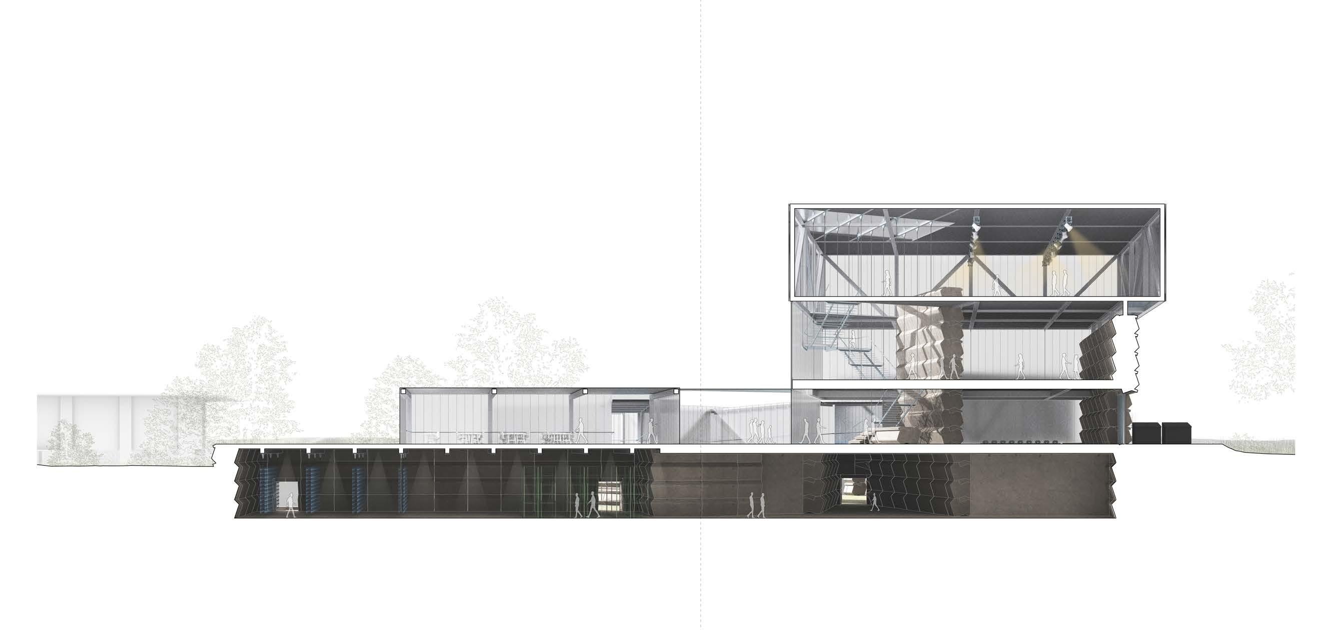 The building’s program is split into three parts, which is reflected in the building’s form. The north section is main assembly space, where the wall panels are pushed in far enough to accommodate a hallway. The south is vertically split into 3 levels of ‘back of house’ space, and the wall panel offset is there to allow light in. The center is also split into 3 levels and is pinched. The top of the pinch is an open to sky gathering space, where the bottom is the lobby. This pinch identifies the entrance to the building as well as a direct connection to the sculpture garden behind.