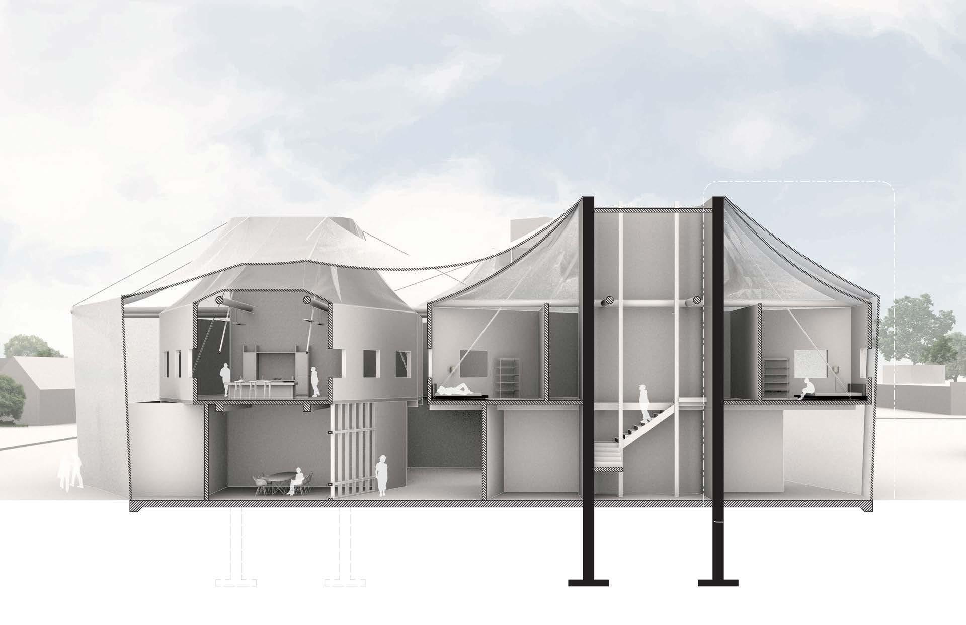 The Maison de Soins is composed of three houses. The already recognized Maison de Sante contains the traditional and purely active forms of care. The Maison du Public is composed of the major program zones, the kitchen, pool, and learning center, which provide opportunities for both active and passive care. Lastly, the Maison du gé is a housing facility which is designed specifically with the Parisian elderly in mind.