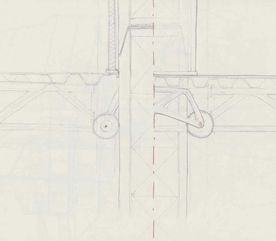See the stairs in these sections for example. They hang from the top most sets of trusses and extend down to the lobby, where the last riser is missing creating a gap between the concrete and steel, distinguishing what is resting on the earth, to be flooded, and what is hanging from above, to be spared from the damages.