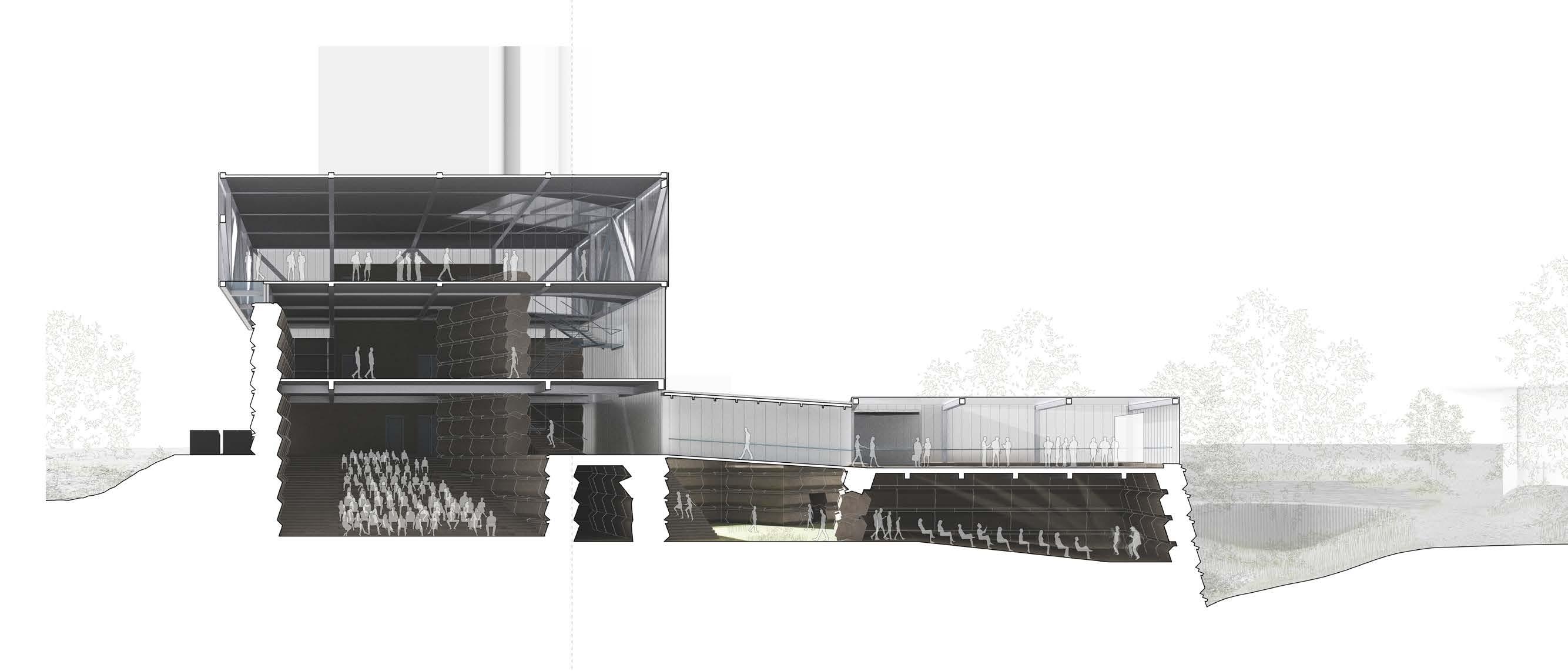 A cut through the monumental wall, exposing the interior circulation routes, and its various entrances and exits. These lead into and out of the theaters, the first that spans from the first to second level, and the second that spans from the second to third level.