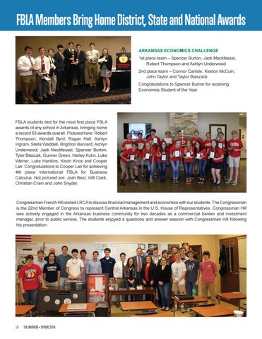 FBLA Members Bring Home District, State and National Awards ARKANSAS ECONOMICS CHALLENGE 1st place team – Spencer Burton, Jack Meckfessel, Robert Thompson and Ashlyn Underwood 2nd place team – Connor Carlisle, Keeton McCuin, John Taylor and Taylor Blaszack Congratulations to Spencer Burton for receiving Economics Student of the Year.