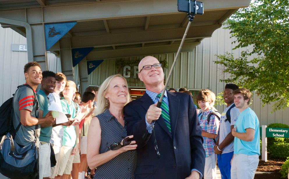 Looking Back: Dr. and Mrs. Arnold along with members of the Class of 2016 were all smiles outside the House of Love for the annual first day of school tradition where seniors greet younger Warriors at each building.