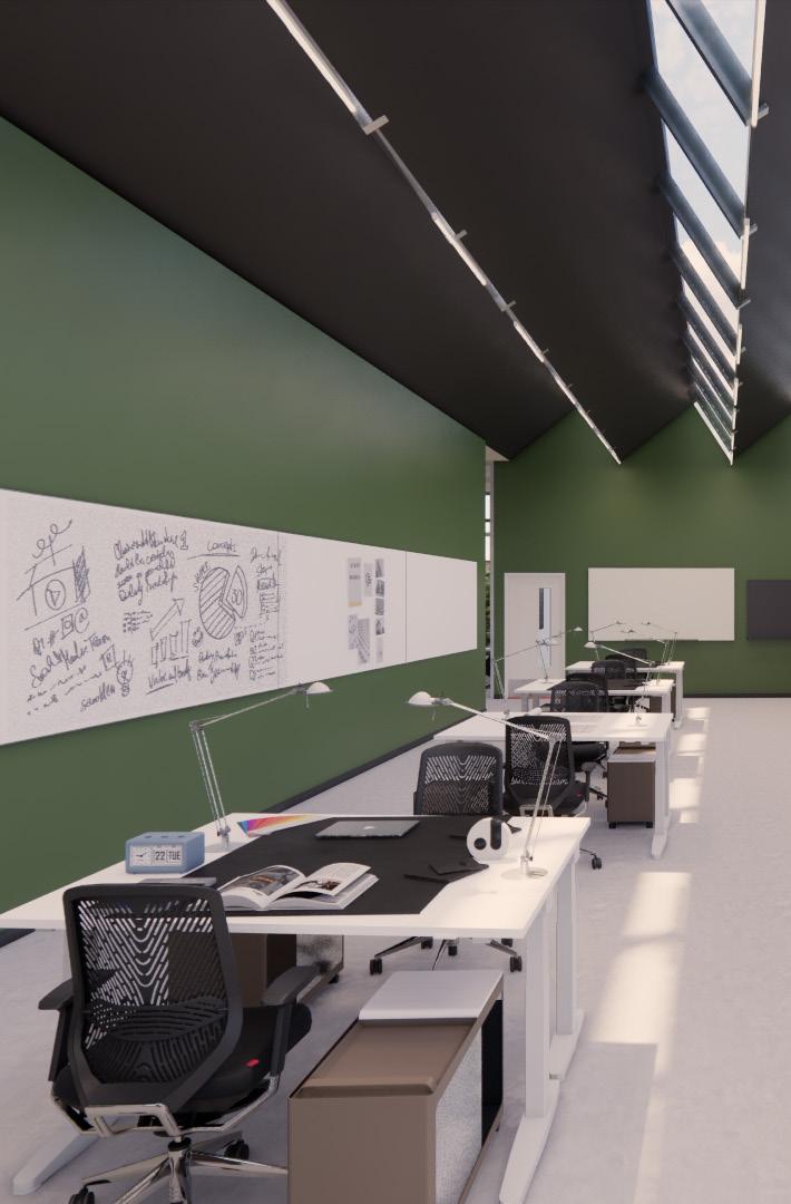 The furniture in this studio provides options for students to stand or sit during long hours in the studio. Along with considering ergonomics, the unique sawtooth roof provides students with natural sunlight to improve morale, productivity and health.
