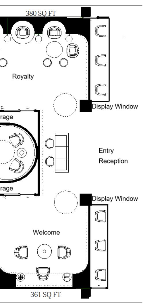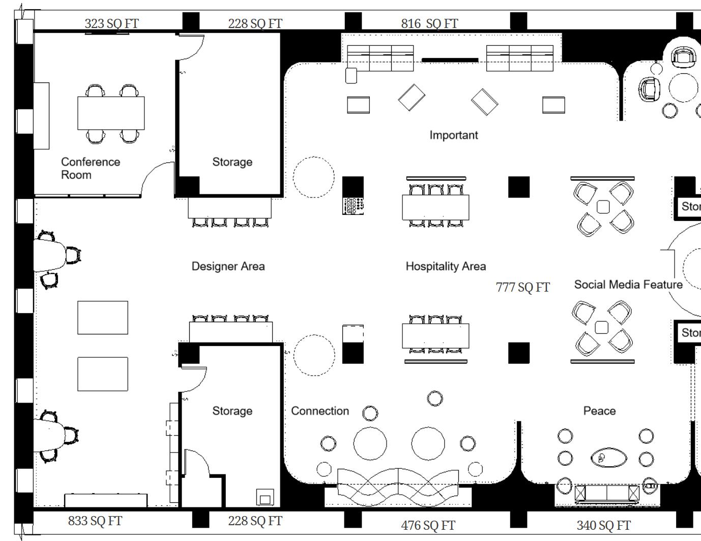 This furniture plan optimizes space by keeping all showroom vignettes to the side and making hospitality the center of Bernhardt’s focus.